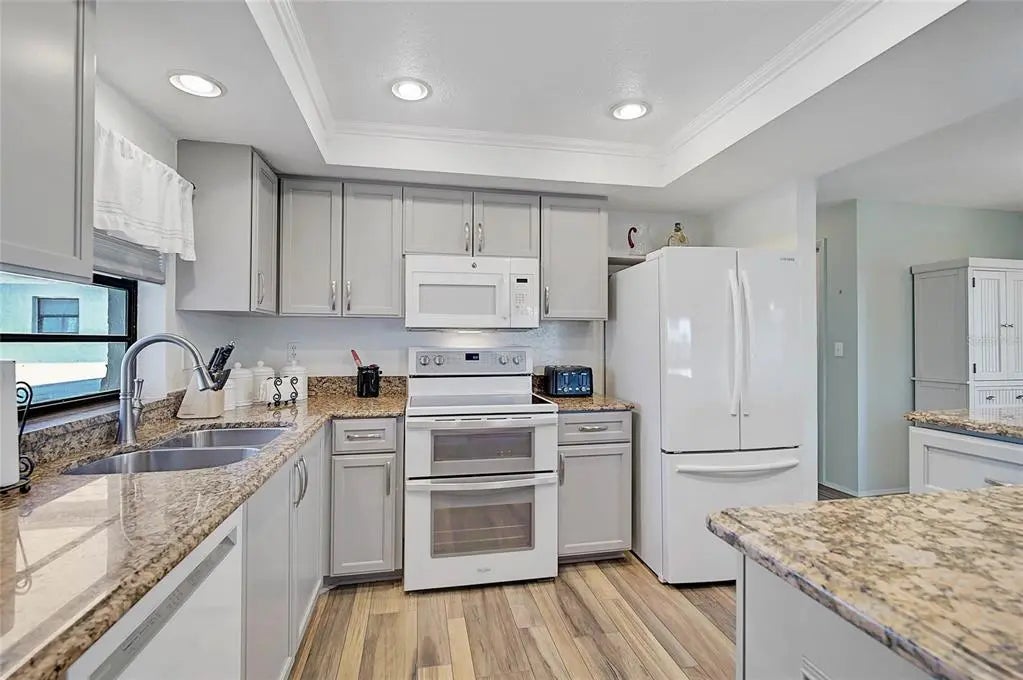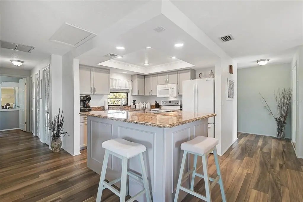 Welcome to Villa Nova, a well-maintained community in the heart of Venice, known for its mature landscaping, welcoming atmosphere, and convenient location near I-75, Gulf Coast beaches, historic Venice Avenue, and a variety of shopping and dining options. This annual rental offers bright, open-concept living with luxury vinyl plank flooring throughout, generous room sizes, and ample closet and storage space. Offered unfurnished. (Furnishings shown in photos are for illustrative purposes only). The updated kitchen (2021) features wood cabinetry and granite countertops. The spacious primary suite includes a walk-in closet and an updated en-suite bath with a walk-in shower. The guest bathroom has also been tastefully renovated for a cohesive, modern feel. Enjoy the oversized screened lanai—perfect for relaxing with morning coffee or evening breezes. Additional highlights include in-unit laundry, a new electric panel (2024), and a building with a recently replaced roof. Residents have access to a community clubhouse with a heated pool, library, kitchen, and outdoor grill area. Located in a community with age restrictions (per association guidelines). Annual lease only. Association approval required prior to occupancy. Schedule your private showing today.