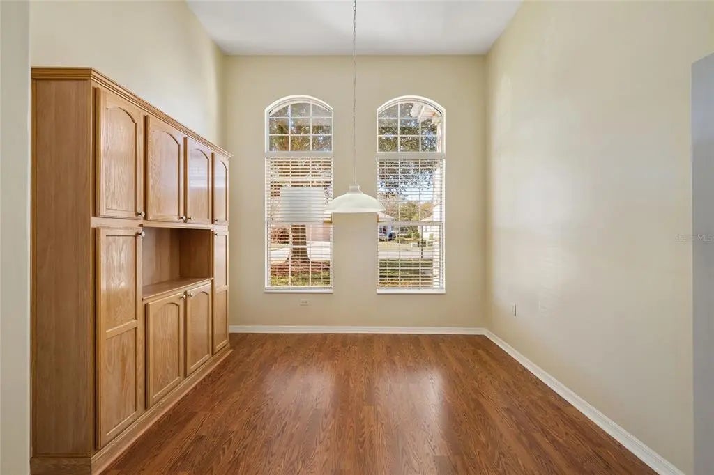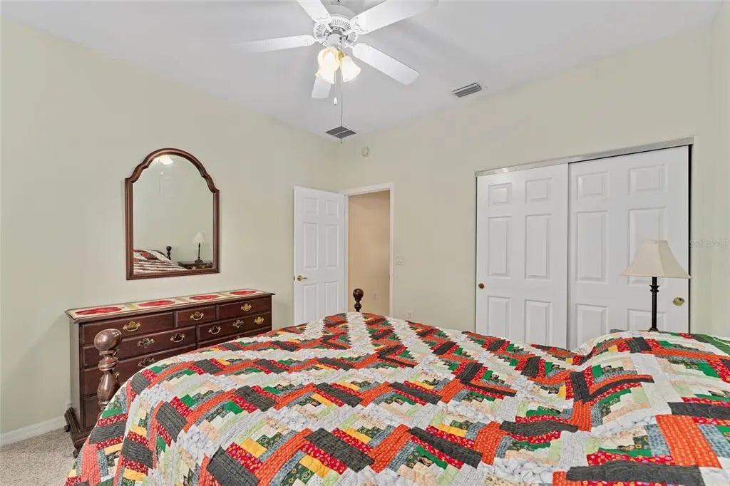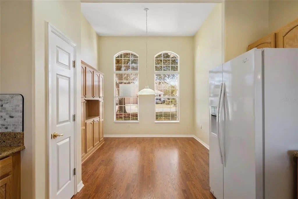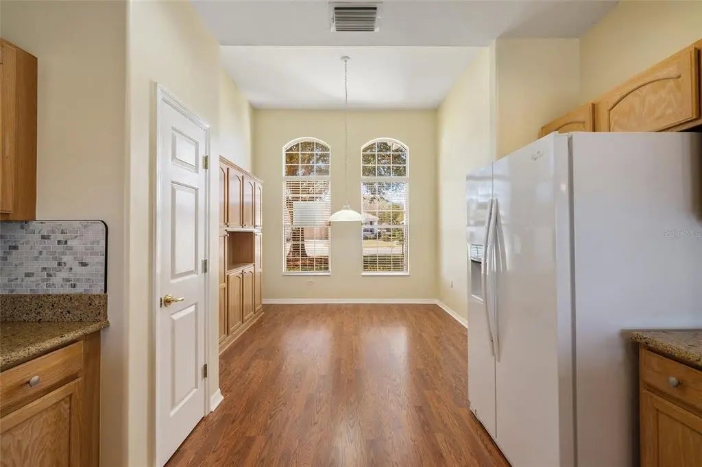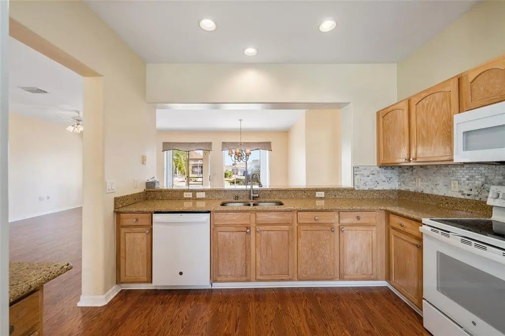 Spacious and thoughtfully designed, this popular Sanibel model offers 2 bedrooms, 2 baths, and a versatile den, making it the perfect Florida retreat or full-time residence. The split floor plan provides privacy for owners and guests alike, with the primary suite on one side of the home and the guest bedroom and den on the other. The kitchen features granite counters, a tile backsplash, abundant cabinetry, and a cheerful breakfast nook filled with natural light. The great room easily accommodates both a large dining table and a comfortable living area for entertaining or relaxing. Step out to the screened lanai and enjoy the open space and privacy between homes. One standout feature is the extended garage—one side measures 32 feet long, the other 26 feet—offering ample room for two cars, a golf cart, a workbench area, and includes a utility sink and drop-down attic stairs for extra storage. The primary bathroom is upgraded with a built-in closet system, double granite vanity, and a modern cultured marble shower with a bench. Located just a short walk—3 to 5 minutes—to the fitness center, indoor heated pool, softball field, walking trails, and more. Roof replaced in 2021, HVAC in 2026, and a new hot water heater was added in 2009. Enjoy the vibrant lifestyle of Del Webb Spruce Creek, featuring 36 holes of golf, 10 pickleball courts, 12 tennis courts, 2 outdoor heated pools, and an abundanc of actiivites,. VINYL PLANKING FLOORING INSTALLED IN LIVING ROOM DINING ROOM, HALLWAYS. Only the bedrooms have carpeting. Call today to see it. The wallpaper that was seen previously is gone.