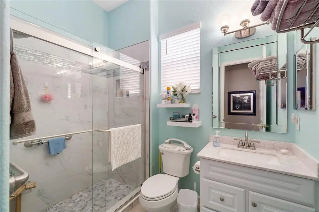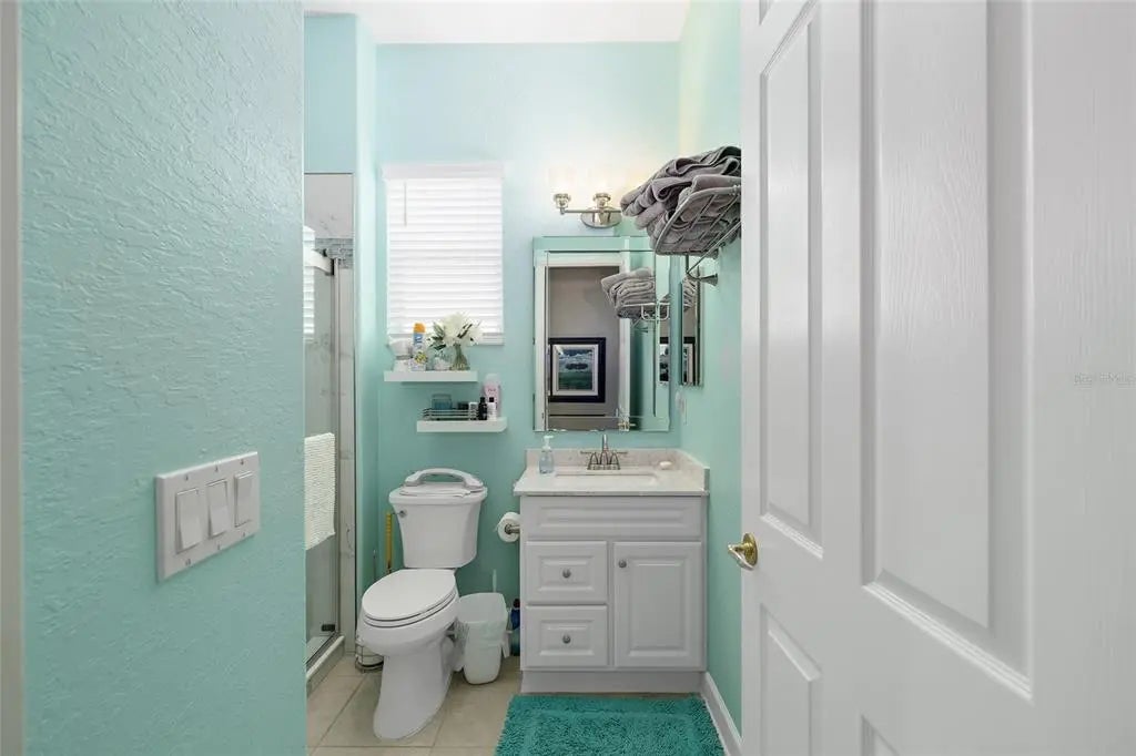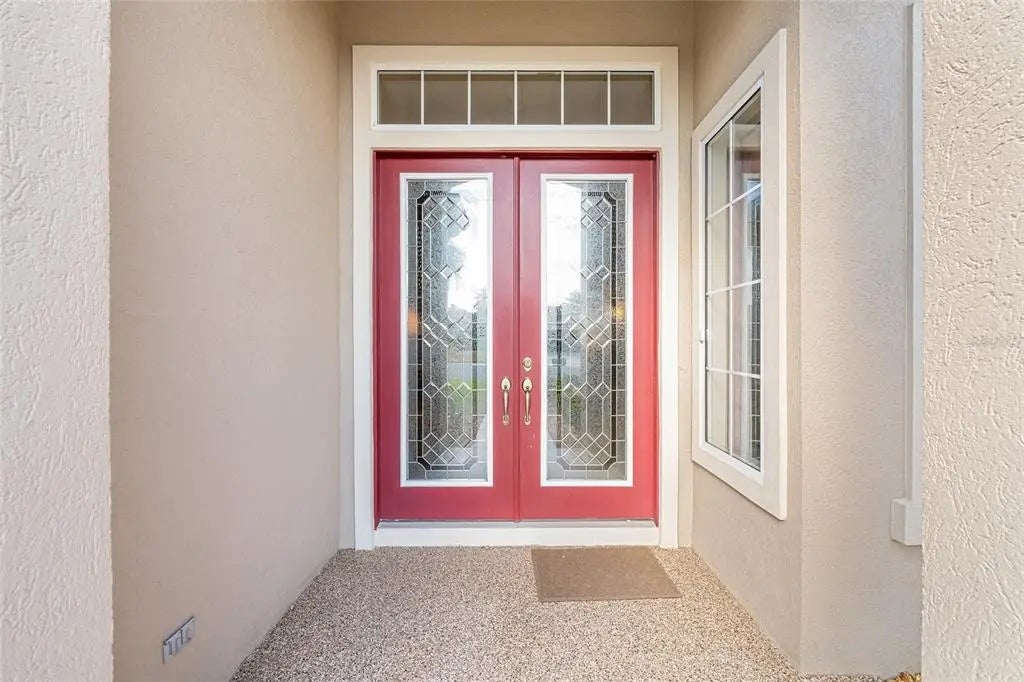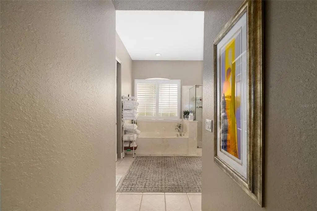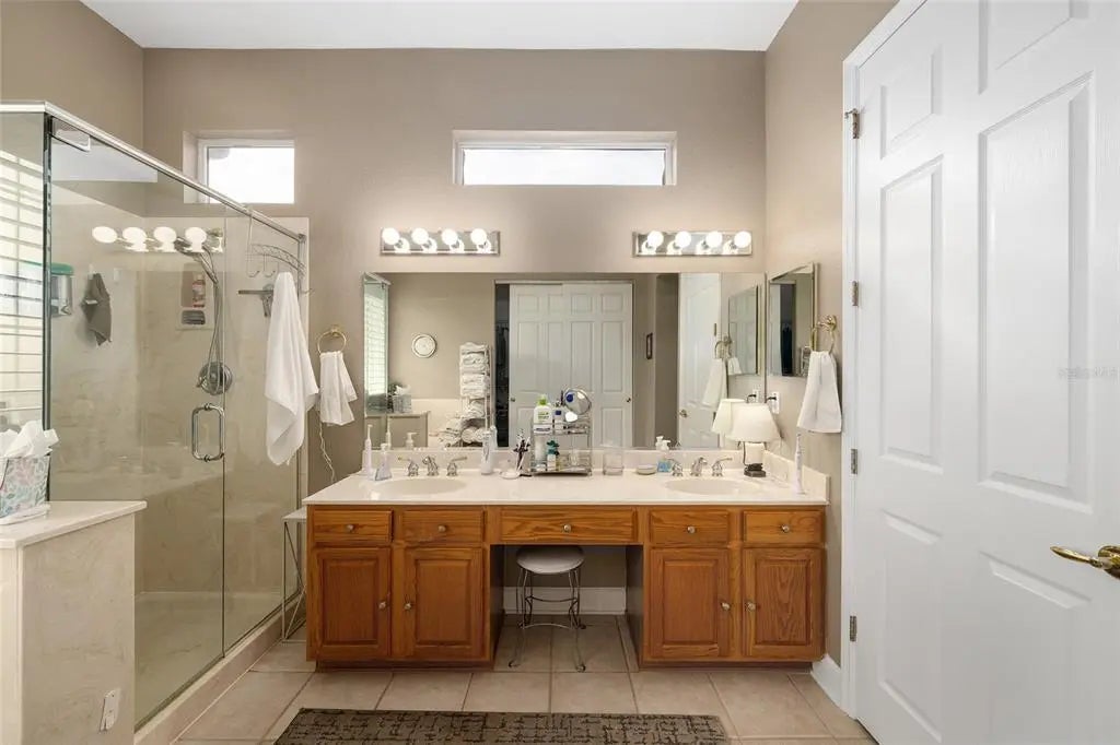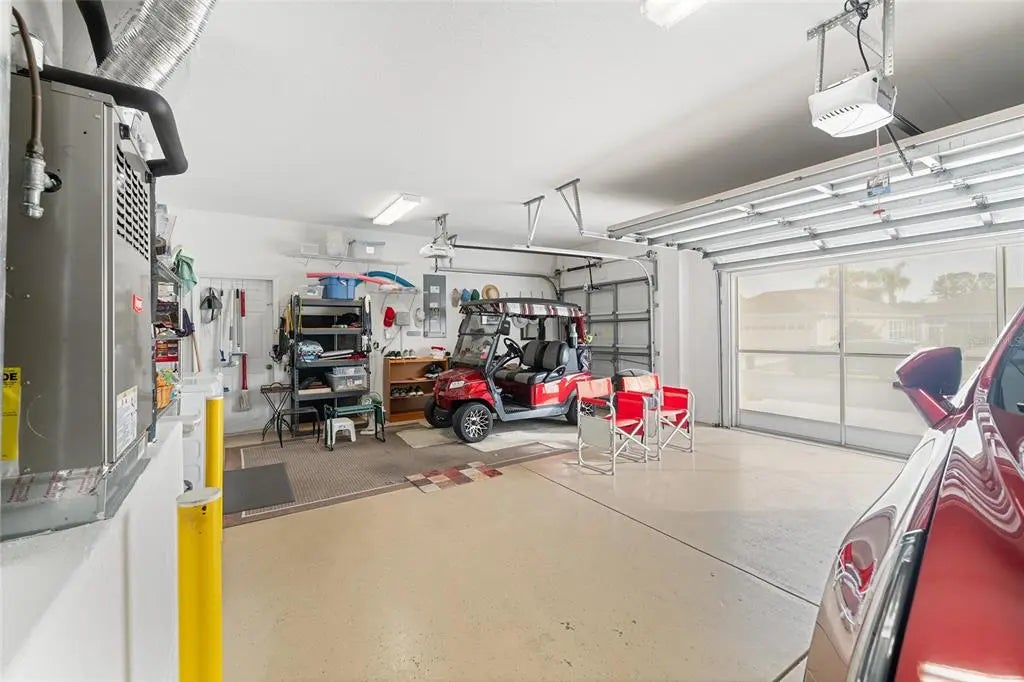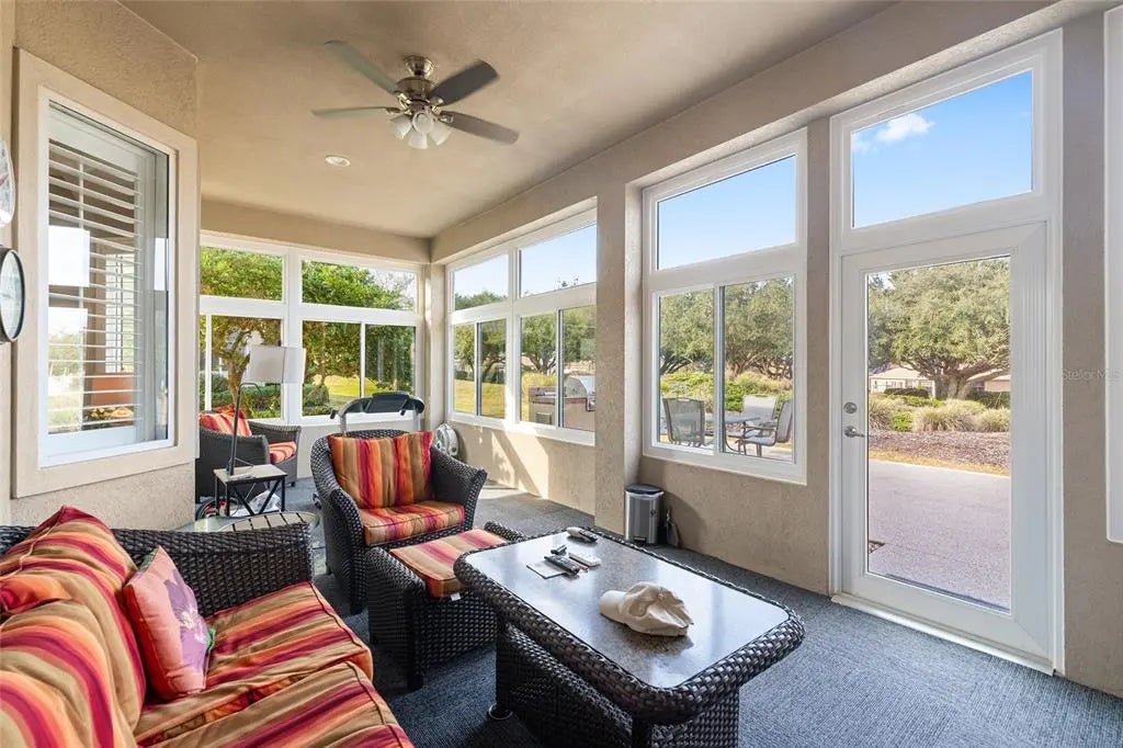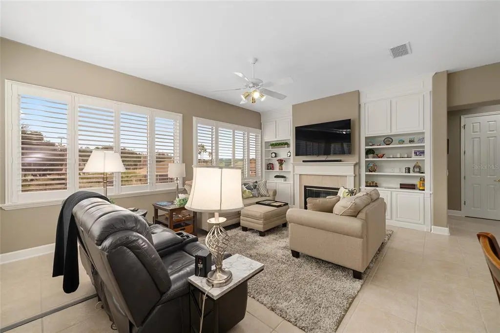 First time on the market, this beautifully maintained Hampton model offers 3 bedrooms, 2.5 baths, and an exceptional list of upgrades. The kitchen features quartz countertops, newer appliances, a gas cooktop, 42" oak cabinets, a skylight, and ceramic tile flooring.You are welcomed by double leaded-glass entry doors, set off by a designer-painted driveway and walkway with professionally maintained landscaping. Inside, the foyer opens to the dining room on the right, the living room straight ahead, and continues into the kitchen and family room. Ceramic tile flooring runs throughout the home, with engineered wood floors in all bedrooms. Plantation shutters are featured in nearly every room. The Florida room includes built-ins and a gas fireplace and is positioned for easy viewing from the kitchen, creating an ideal layout for everyday living or entertaining. The primary suite offers bay windows and a ceiling fan, while the ensuite bath includes a separate shower, soaking tub, double vanity with cultured marble countertops, and plantation shutters.The second bath has been completely remodeled with a walk-in shower and newer vanity. The utility room has been adapted for office use and includes abundant overhead cabinetry. The large, glass-enclosed lanai is equipped with a split HVAC system installed in 2022. Additional highlights include a spacious garage with a dedicated golf cart area with overhead door (or equivalent storage/workshop space), designer-painted garage floor, washer and dryer, and utility sink. Major updates include a new roof (2021), two HVAC systems (2021), Rinnai tankless hot water heater (2021), and a Generac whole-house generator (2021). The home has been meticulously cared for. Furniture is available separately.