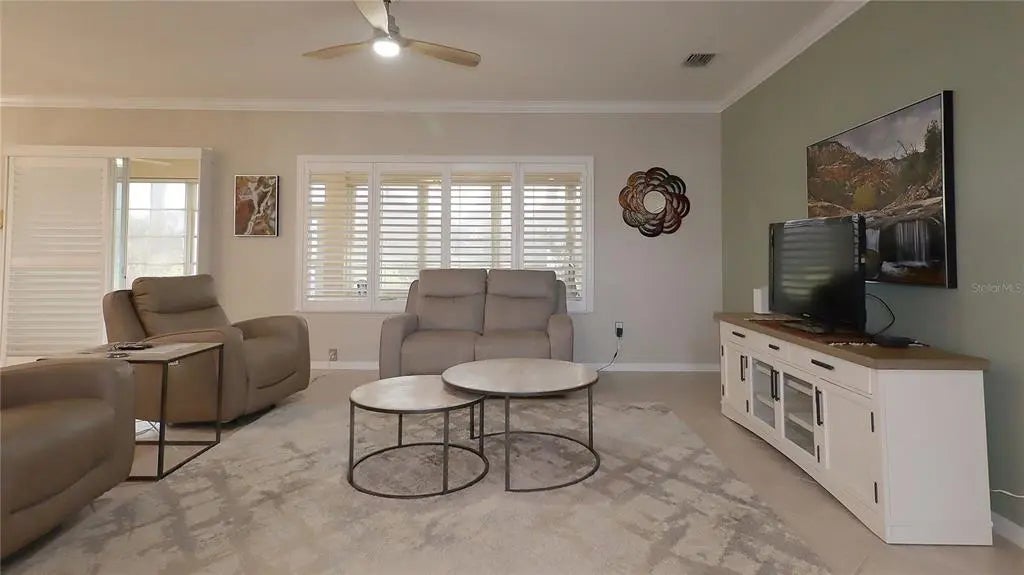 - Ceiling Fan(s), Crown Molding, High Ceilings, Kitchen/Family Room Combo, Open Floorplan, Primary Bedroom Main Floor, Solid Surface Counters, Solid Wood Cabinets, Walk-In Closet(s), Window Treatments