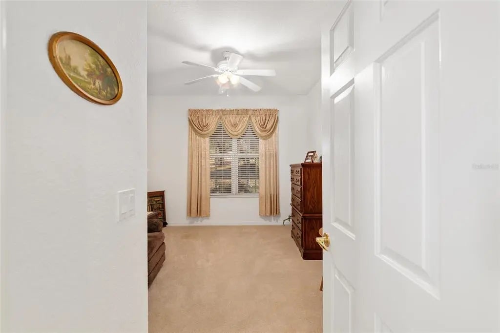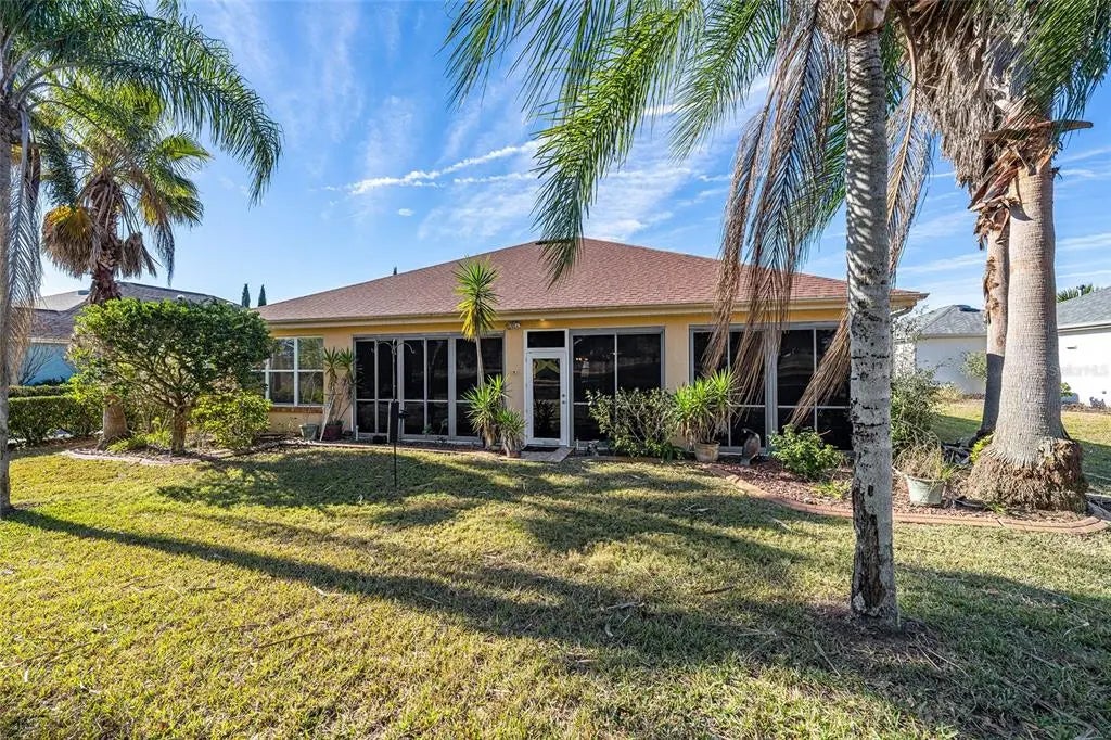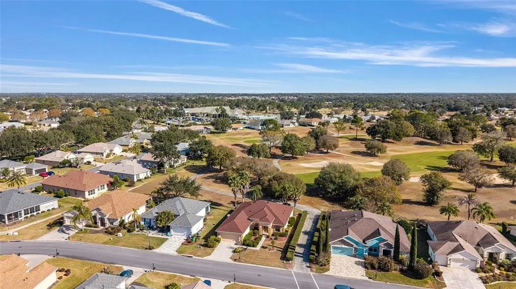 First time on the market! This highly sought-after Johnstown model with 3 bedrooms plus a study/den is beautifully positioned just off the green of the 4th hole on the Masters Golf Course — and less than 100 yards from both a chipping green and a separate putting green to sharpen your game. From the moment you arrive, you’ll appreciate the pavered walkway, curbed rock beds, and elegant leaded glass double entry doors. Inside, the open great room design includes a dedicated dining area, with the kitchen perfectly positioned to remain part of every gathering. The kitchen offers oak cabinetry, an island, breakfast bar, solar tube, and mostly updated appliances, including a French-door refrigerator with bottom freezerReal wood flooring enhances the great room and hallway. The primary bedroom features engineered wood flooring, while the two guest bedrooms and study are comfortably carpeted. Ceiling fans with lights are found throughout the home. The enclosed lanai showcases floor-to-ceiling acrylic windows, creating a bright and relaxing space to enjoy the golf course setting.The primary bath has been updated with new shower walls, glass enclosure, and a bench seat. The extended 28-foot garage includes pull-down attic stairs for extra storage and convenient keyless entry.Major updates include a new roof in 2021 and HVAC in 2018. This home has been meticulously maintained and is truly move-in ready. Some furniture is available for purchase.A rare opportunity to own one of Del Webb’s favorite models in a prime golf course location — this is a home you must see to fully appreciate. Primary bedroom is virtually staged,