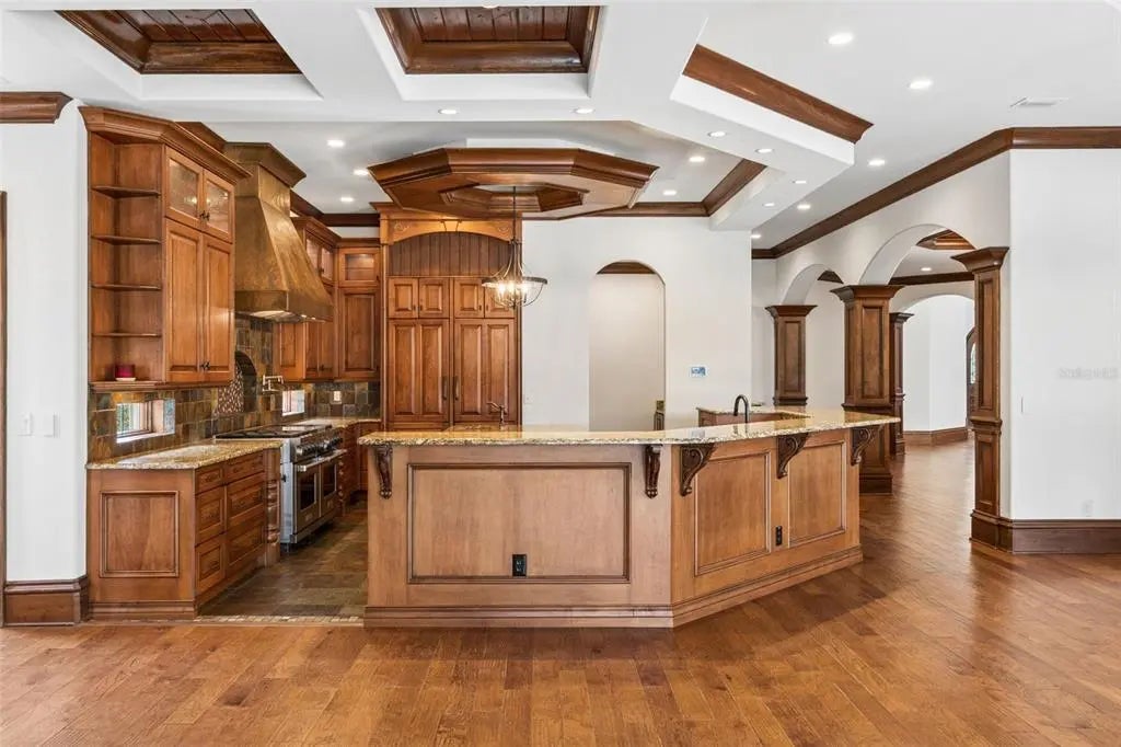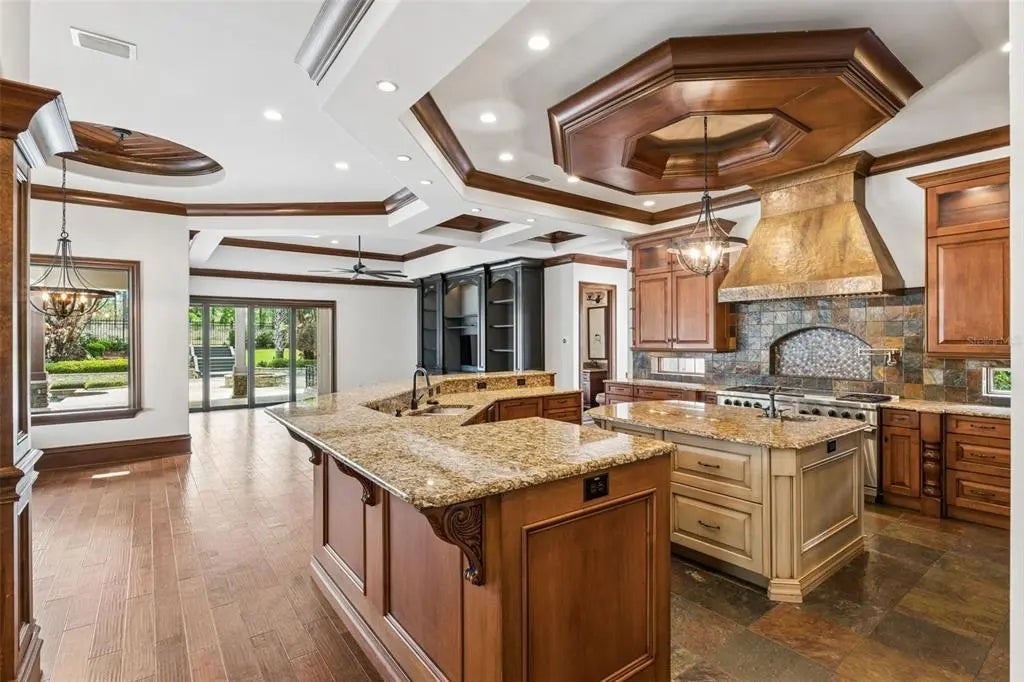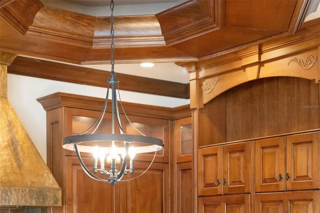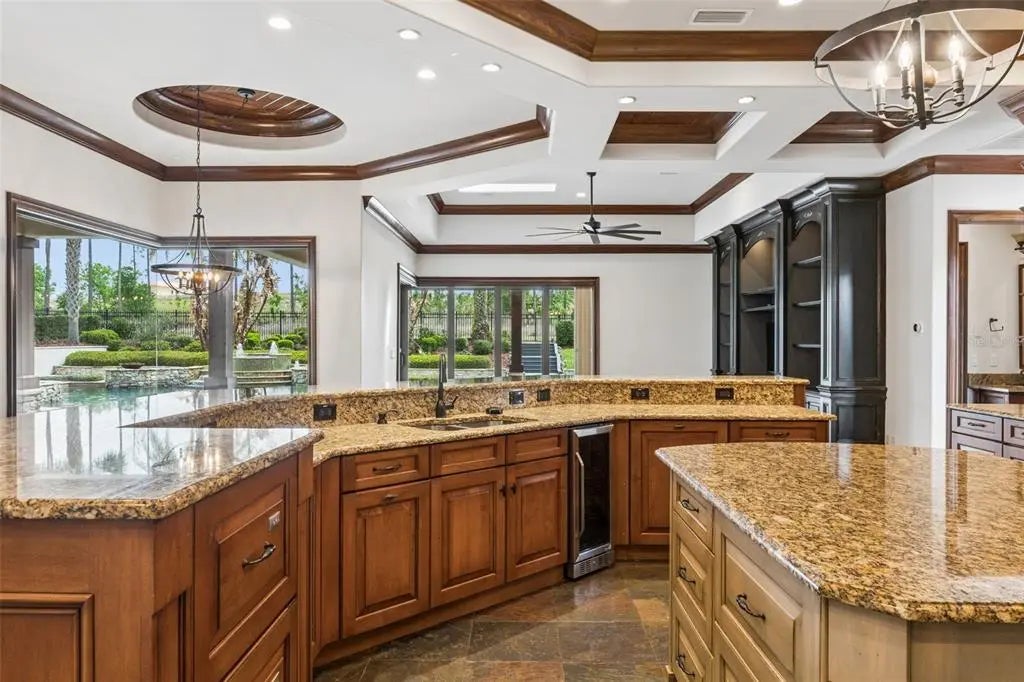 - Built-in Features, Cathedral Ceiling(s), Ceiling Fan(s), Central Vacuum, Coffered Ceiling(s), Crown Molding, Eating Space In Kitchen, Elevator, High Ceilings, Kitchen/Family Room Combo, Open Floorplan, PrimaryBedroom Upstairs, Skylight(s), Smart Home, Solid Wood Cabinets, Stone Counters, Tray Ceiling(s), Vaulted Ceiling(s), Walk-In Closet(s), Wet Bar