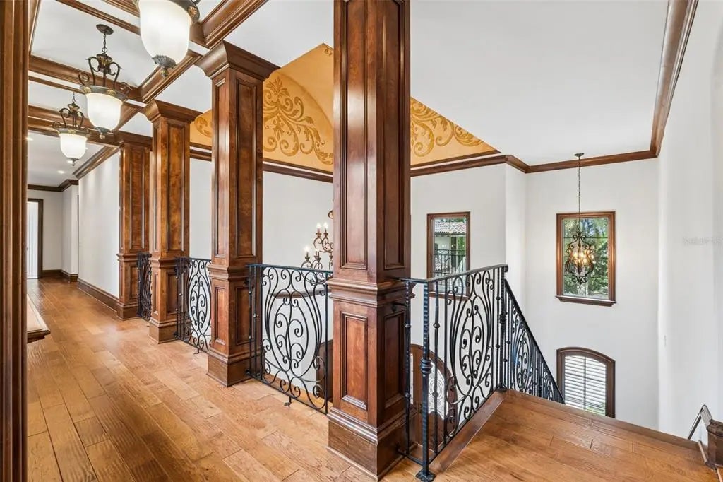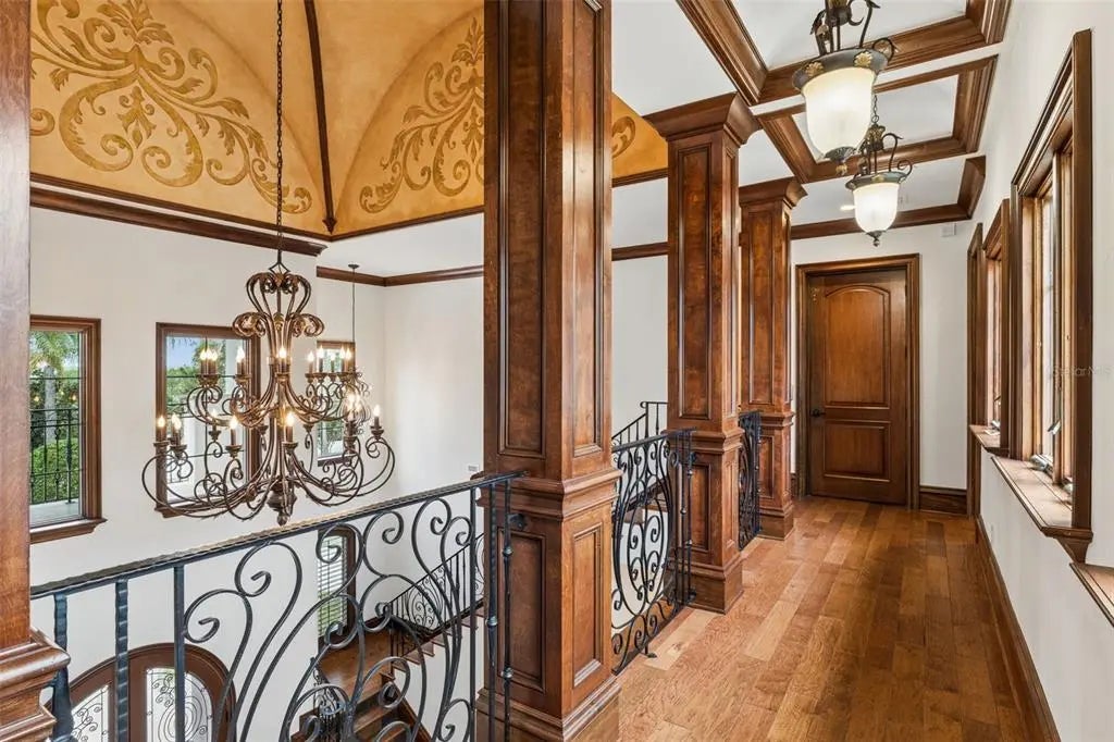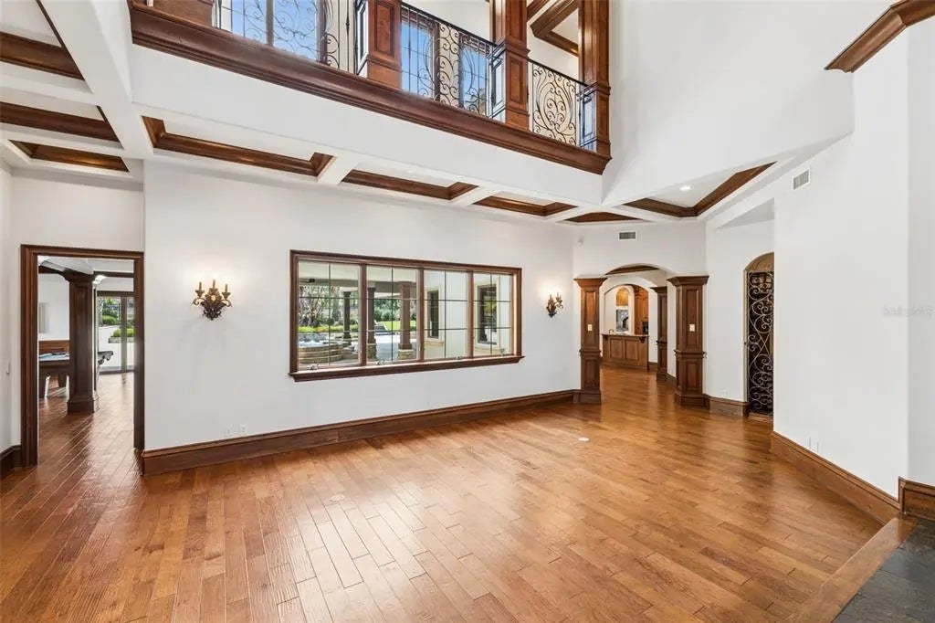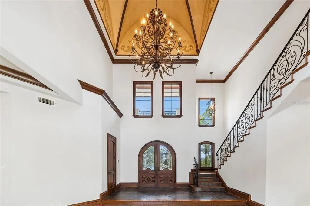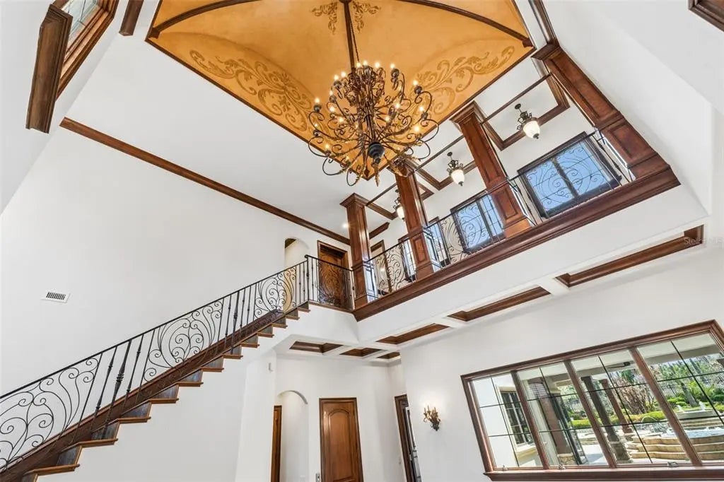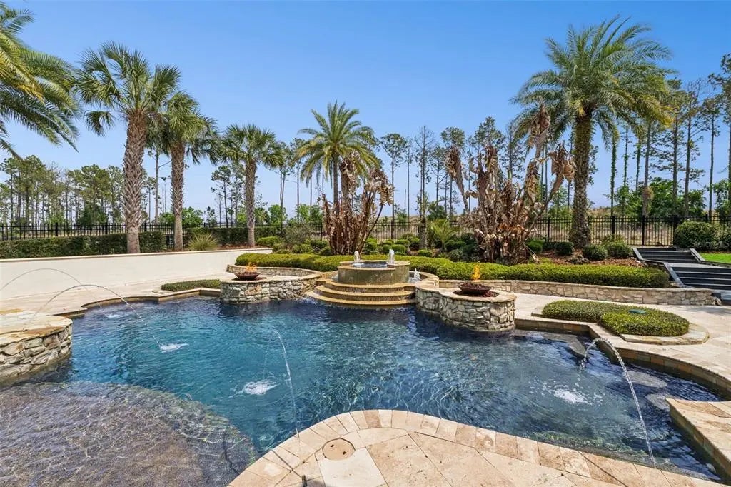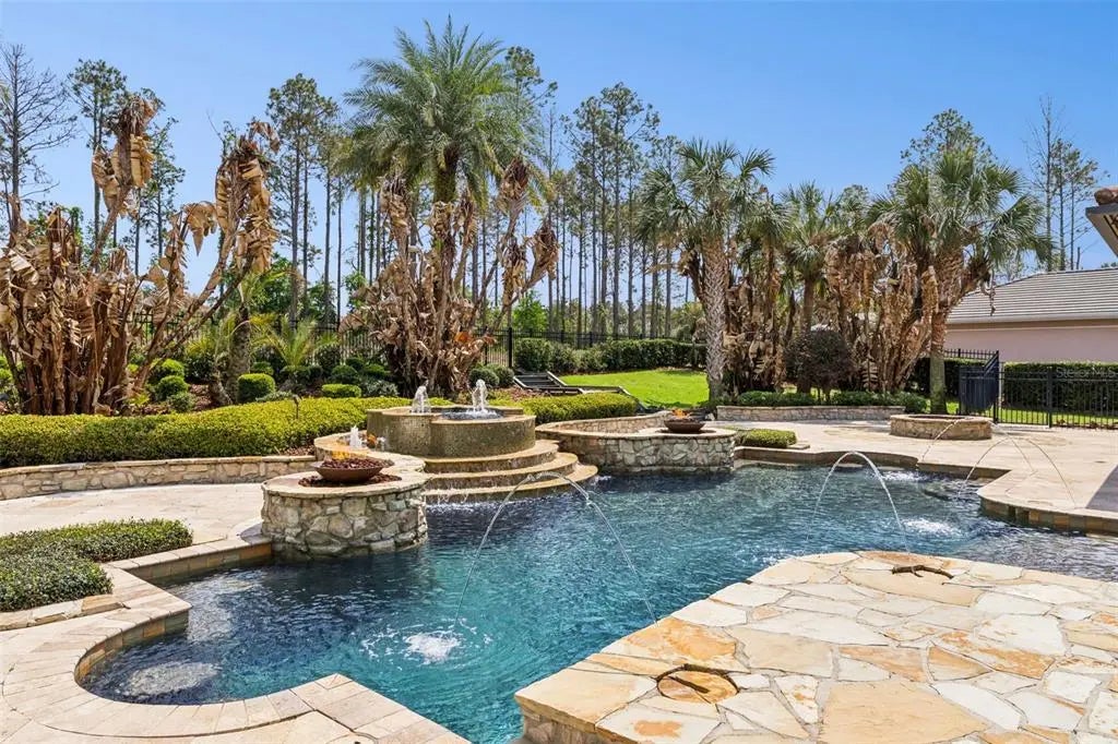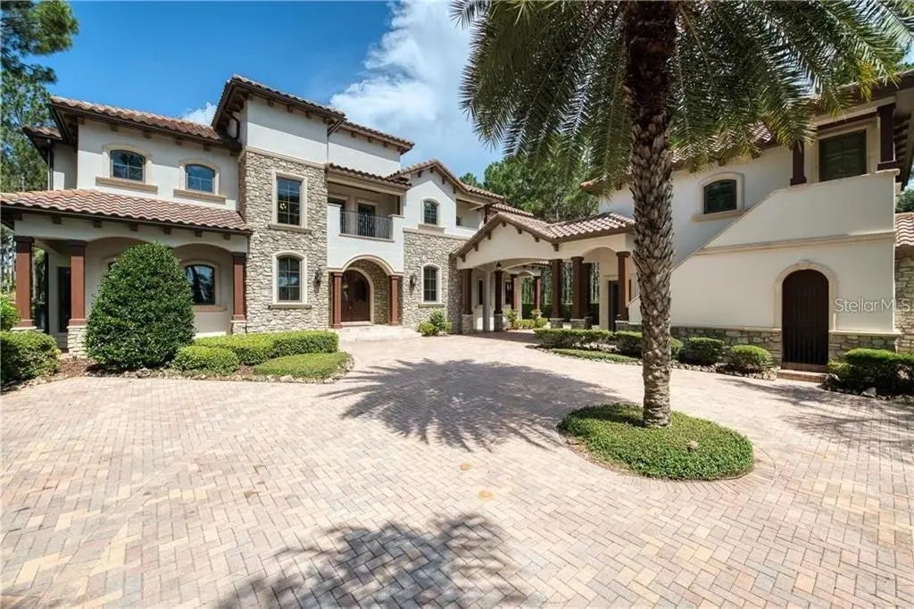 Welcome to this extraordinary custom estate in Bella Collina, Central Florida’s premier private, guard-gated golf community. Perfectly positioned on an expansive homesite framed by mature trees and lush landscaping, this grand residence blends timeless architecture with modern luxury and exceptional privacy. From the moment you arrive, the impressive stone elevation and stately presence set the tone for what awaits inside. Ornate double doors open to a dramatic two-story atrium, introducing oak plank-style flooring throughout the main level and refined architectural details including custom oak panels, pillars, and designer millwork. The expansive chef’s kitchen is a true showpiece, featuring a six-burner Wolf range, dual Sub-Zero refrigerator/freezers, prep bar, hidden butler’s pantry, and adjoining laundry room (the first of two). The kitchen flows seamlessly into the generous living area, where 90-degree mitered sliding glass doors and a massive picture window frame breathtaking views of one of the finest resort-style pool environments in the community. The first floor also offers a guest suite and a fully equipped entertainment/media room with wet bar and direct access to the pool deck—ideal for hosting gatherings of any scale. A full-home Crestron automation system enhances convenience, comfort, and control throughout. Upstairs, accessible by a secondary staircase off the dining area (and elevator service), you’ll find a versatile flex room, private office, two additional guest bedrooms, a second laundry room, and the secluded owner’s retreat. The primary suite is a true sanctuary, featuring exposed beams, tray ceiling detail, custom baseboards, private balcony overlooking the pool, and an expansive spa-inspired bath with separate water closets, spa tub, dual vanities, and custom oak closet systems. Outdoor living rivals the finest luxury resorts. The custom-designed pool showcases travertine pavers, multi-person spa, swim-up seating, sun shelf, and elegant fountain features. All pool equipment has just been completely replaced, offering peace of mind and enhanced efficiency for years to come. A large fire pit gathering space, fully equipped summer kitchen with custom hood, and a private courtyard with pergola, fireplace, and television create multiple venues for entertaining year-round. Additional highlights include: Elevator servicing multiple levels Two double garages with generous parking Above-garage apartment with full kitchen and bath featuring engineered wood flooring. Mature landscaping providing exceptional privacy Residents of Bella Collina enjoy a lifestyle unlike any other, with a Nick Faldo-designed championship golf course, resort-style pool, fitness center with complimentary classes, tennis and pickleball courts, full-service spa, and multiple dining venues - all just minutes from Montverde Academy and major highways. This is a rare opportunity to own a truly grand custom estate designed for luxurious everyday living and unforgettable entertaining. A private showing is highly recommended to fully appreciate everything this exceptional home provides. Seller will Defer $40,000 Sports Membership Deposit at Closing.