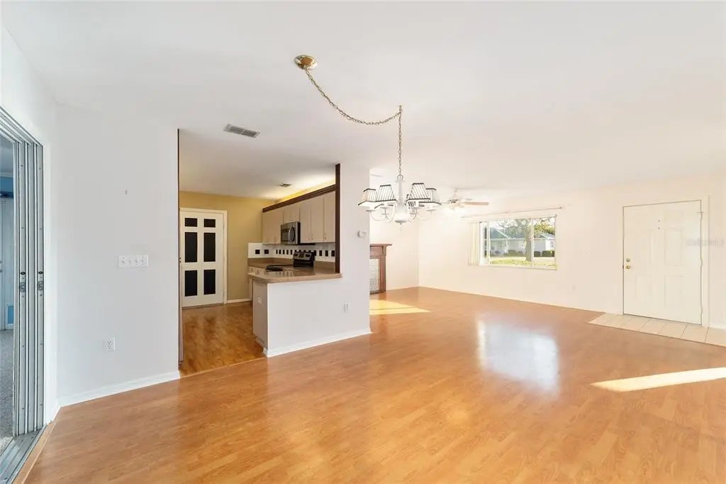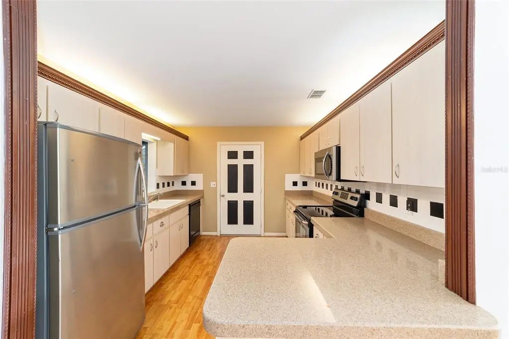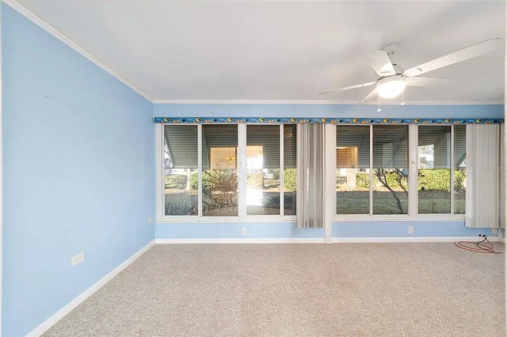 One or more photo(s) has been virtually staged. This charming 2-bedroom, 2-bath Juniper model is vacant and ready for its new owners! With a desirable split-bedroom layout and thoughtful updates, this home offers comfort, functionality, and great value. Laminate flooring flows through the main living areas, including the spacious living room, dining room, and kitchen, while both bedrooms feature comfortable carpeting. The galley-style kitchen is equipped with newer stainless-steel appliances, Corian countertops, and a tiled backsplash, providing both style and practicality. Enjoy year-round relaxation in the climate-controlled Florida room, which opens to a generous 10x18 birdcage—perfect for outdoor living, grilling, and embracing the Florida lifestyle. Both bathrooms feature tile flooring, and the primary bath includes an updated shower. The extended 25-foot garage houses the laundry area and offers convenient pull-down attic stairs for additional storage. Major updates include a new roof in 2014 and HVAC replaced in 2013, offering peace of mind for years to come. Offered at a great price, this is the perfect opportunity to own a well-maintained home that’s move-in ready. See it today! ALL ROOMS SHOWING FURNITURE, PLEASE NOTE, THE FURNITURE IS VIRTUAL