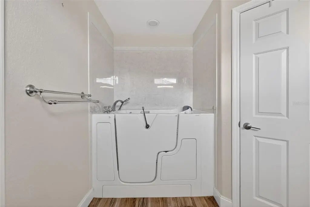 New Port Model 2/2 with a den. This home is in a gated and staffed, 55+ golf community. Light, bright, open, and large spacious rooms with the same laminate flooring throughout...NO CARPET! Large eat in area in the kitchen and a nice size pantry, newer appliances (late 2021/early 2022). This home has an indoor laundry room adjacent to the garage. Recently installed walk-in tub in the primary bath, separate water closet w/newer toilet & bidet, and a walk-in closet to go with your huge primary bedroom suite! Large screened lanai with total privacy in the back as there are no rear neighbors. A/C 2023, Roof 2016, and newer gas water heater. Home is unfurnished, but pieces are available to purchase separately.