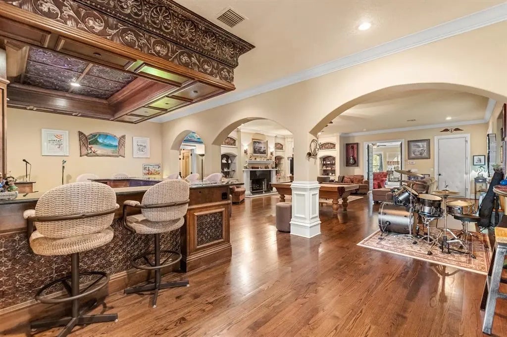 - Built-in Features, Cathedral Ceiling(s), Ceiling Fan(s), Central Vacuum, Coffered Ceiling(s), Crown Molding, Eating Space In Kitchen, Elevator, High Ceilings, Kitchen/Family Room Combo, Other, Primary Bedroom Main Floor, PrimaryBedroom Upstairs, Solid Wood Cabinets, Split Bedroom, Stone Counters, Thermostat, Tray Ceiling(s), Walk-In Closet(s), Wet Bar, Window Treatments