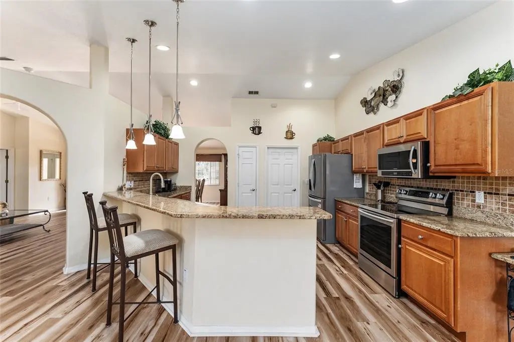 - Cathedral Ceiling(s), Ceiling Fan(s), Eating Space In Kitchen, Kitchen/Family Room Combo, Open Floorplan, Split Bedroom, Stone Counters, Walk-In Closet(s), Window Treatments
