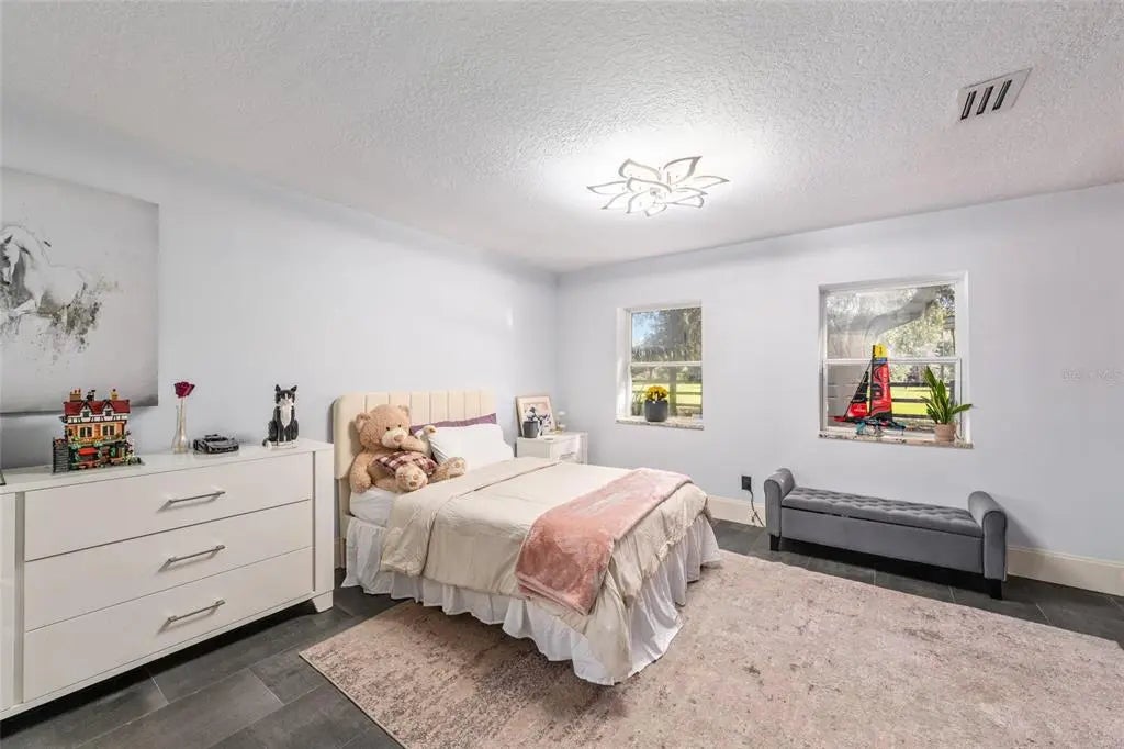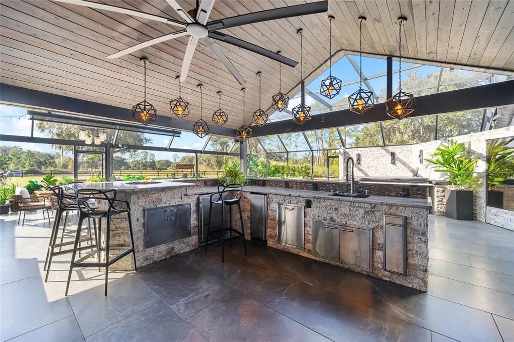 Nestled in the rolling landscape of Howey-in-the Hills, Florida, this exceptional 17+ acre equestrian estate blends refined living with premium horse amenities. Its prime Central Florida location is 30 minutes from downtown Orlando and 45 minutes from the World Equestrian Center in Ocala. Residence: This beautifully updated residence offers 3 spacious bedrooms, each with its own luxurious ensuite bathroom, providing comfort and privacy for family and guests. Every bath features high-end finishes, thoughtful design, and a refined aesthetic that reflects the home's overall quality. At the heart of the home is a chef-inspired kitchen with top-of-the-line appliances including an impressive 48" gas range, premium cabinetry, and sleek quartz countertops. For everyday living or entertaining on a grand scale, this home delivers comfort, style and performance. Outdoor Living: Expansive French doors open to an exceptional screen-enclosed outdoor living and entertainment space designed for year-round enjoyment. This stunning area is anchored by a grand central island with granite countertops and a striking countertop glass fire pit, creating the perfect gathering spot for time with friends and family. The resort-style amenities continue with a 2nd glass fire pit in the sitting area, an 8-person spa, a gorgeous outdoor shower, and the fully-equipped chef's dream kitchen with stainless steel cabinets, soda fridge, beer & wine fridge, 24" warmer, Top Hat ice maker, and 40" Lion grill. Guest House: This spacious 2-bedroom house is a dream lodging for extended family, guests, clients, or use as a lucrative rental or caretakers residence. It's thoughtfully updated and features a stylish bathroom and large open kitchen and living area that creates a warm, comfortable and highly-functional space. There's also a game room/ workout room that adds versatility, making this perfect for recreation, fitness, hobbies, or even a home office. Its size and layout provide exceptional livability while maintaining separation and privacy from the main residence. Equestrian Facilities: A STATE-OF-THE-ART barn with everything possible: 13 oversized European-style stalls with stall mattresses and fans, fly spray system, tack lounge, office, laundry, 2 wash bays, 2 hay/shavings/storage stalls, kitchen, bathroom, convertible bedroom/office/lounge, large feed & supply room, and a beautiful expansive outdoor sitting area overlooking the jump ring. Outside you'll find: 1) an international-size dressage arena and a 115' x 225' show jumping arena, both with GGT footing and full irrigation — ideal for training, clinics, or competition prep; 2) 3-stall barn; 3) 3-stall shed row barn; 4) 4-stall barn set up as 2 stalls with a run-in to a large field, plus a nicely renovated tackroom/flex space; 5) 4 large irrigated paddocks -- excellent for turnout and pasture management; 6) 4 outdoor wash bays; 7) 3 RV hookups. This property is ideal for a professional equestrian, high-style amateur, trainer, breeder, or anyone seeking a quality facility for show jumping, eventing, or multi-use. It is designed for smooth workflow, horse safety, and optimal training conditions year-round. It is a rare combination of location, land, and world-class amenities.