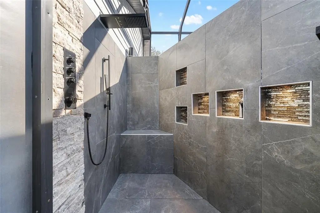 - French Doors, Irrigation System, Lighting, Outdoor Grill, Outdoor Kitchen, Outdoor Shower, Rain Gutters