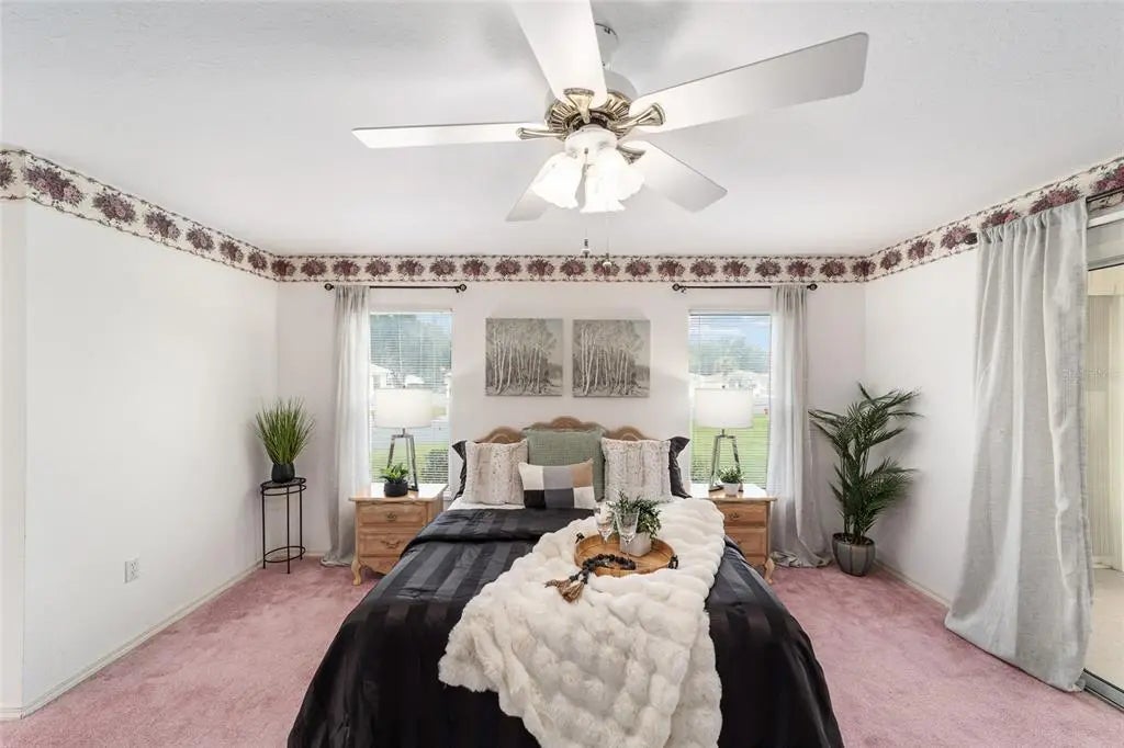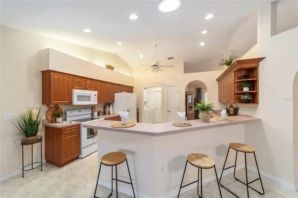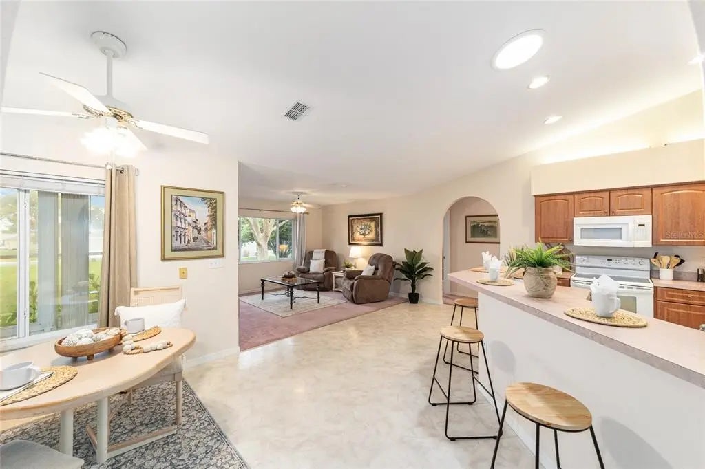Welcome to effortless Florida living in this beautifully designed home located in the premier gated and guarded Spruce Creek Golf and Country Club community—perfectly situated between The Villages and Ocala. Set on a desirable corner lot with a gracious circular driveway, this residence offers comfort, convenience, and an inviting, easy-living layout. Step inside to a warm and welcoming atmosphere for daily living and entertaining. The large kitchen, complete with a breakfast bar and adjoining family room, provides the ideal gathering space. A charming breakfast nook surrounded by glass windows lets you enjoy morning coffee or evening dessert. The enclosed lanai under air extends your living space year-round—perfect for relaxing, reading, or hosting friends. Retreat to the spacious primary suite, featuring his-and-hers separate vanities, a luxurious soaking tub, and a walk-in shower, as well as direct access to the expansive lanai. Two additional guest bedrooms and a second full bath offer space, comfort and privacy for visiting family and friends. All of this is located in a vibrant country-club community offering a wealth of amenities, including a championship golf course, clubhouse, fitness facilities, social activities, and more—ideal for active retirees seeking fun, relaxation, and connection while living the true Florida lifestyle!