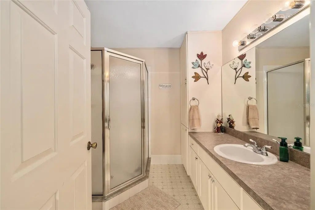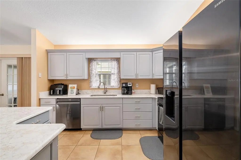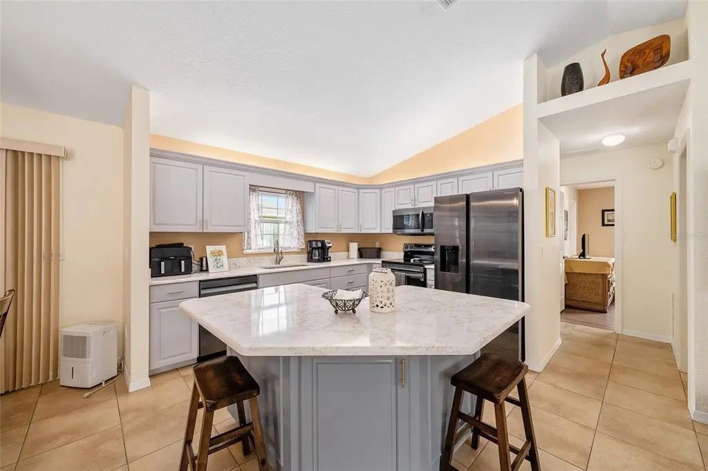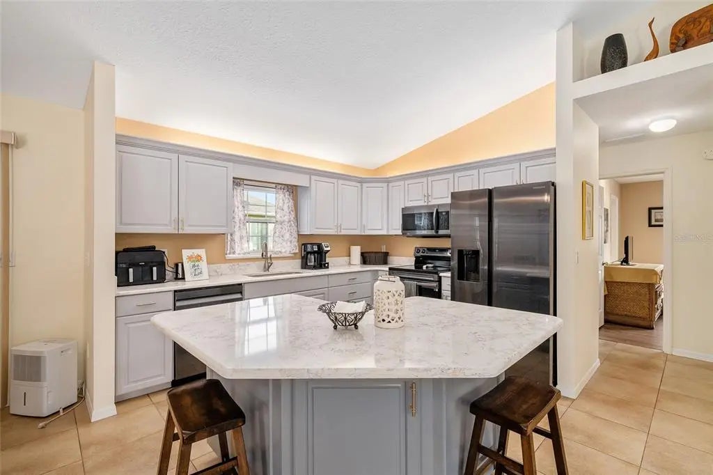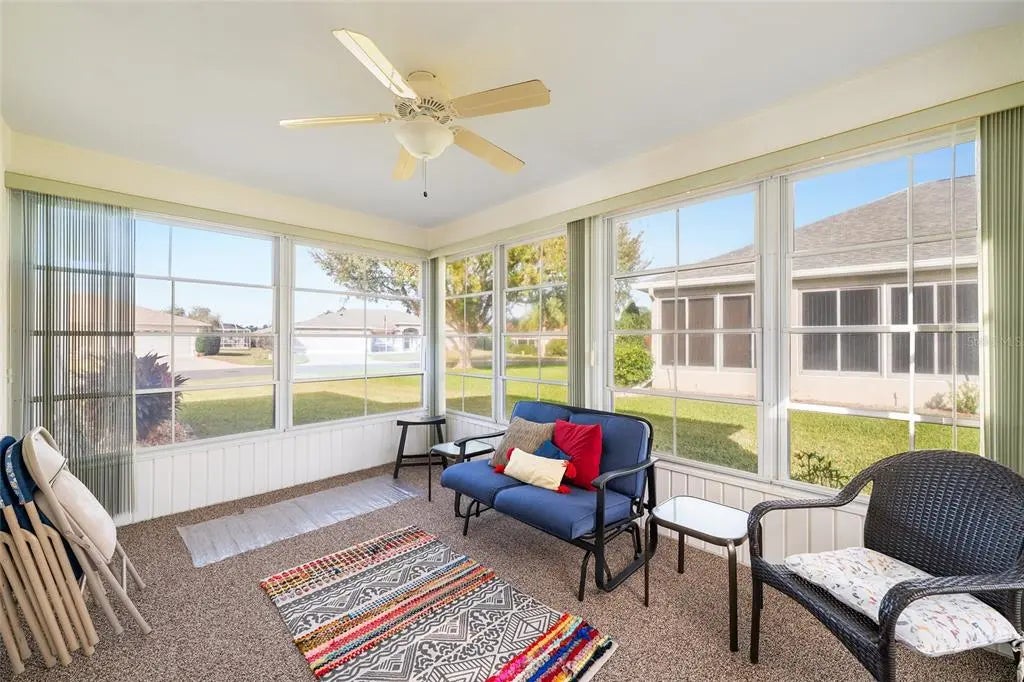 This 2-bedroom, 2-bathroom Chestnut model is situated on a corner lot along a quiet loop. The front porch spans 22 feet and offers an ideal space for enjoying morning coffee, while the private lanai provides an additional tranquil setting. The open floor plan has been enhanced with professionally painted kitchen cabinetry and quartz countertops. The kitchen includes a spacious breakfast bar with storage, stainless steel appliances (installed in 2021), ambient lighting, and recent paint updates. Vaulted ceilings accentuate the living room, dining area, and kitchen, complemented by ceiling fans throughout. Porcelain tile flooring is found in the main living areas, while new water-resistant laminate flooring (2024) has been added to the bedrooms and both walk-in closets. The interior laundry area features upper cabinets for extra storage. The enclosed lanai is finished with vinyl windows, vertical shades, and indoor/outdoor carpeting. The two-car garage includes sliding privacy screens, a utility sink, keyless entry, and a workbench. Notable upgrades include window replacements (2018), HVAC system replacement with humidistat (2012), architectural shingles (2013), and a water heater (2020). A $1200 credit at closing is being provided for the new buyer to purchase a washer and dryer. The seller is also offering a one-year Broward Factory Home Warranty with an acceptable offer. This property invites your consideration—schedule a viewing soon.