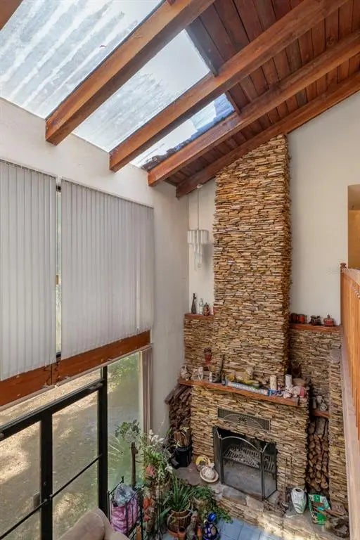 - Built-in Features, Cathedral Ceiling(s), Ceiling Fan(s), Central Vacuum, Eating Space In Kitchen, High Ceilings, PrimaryBedroom Upstairs, Skylight(s), Solid Surface Counters, Stone Counters, Thermostat