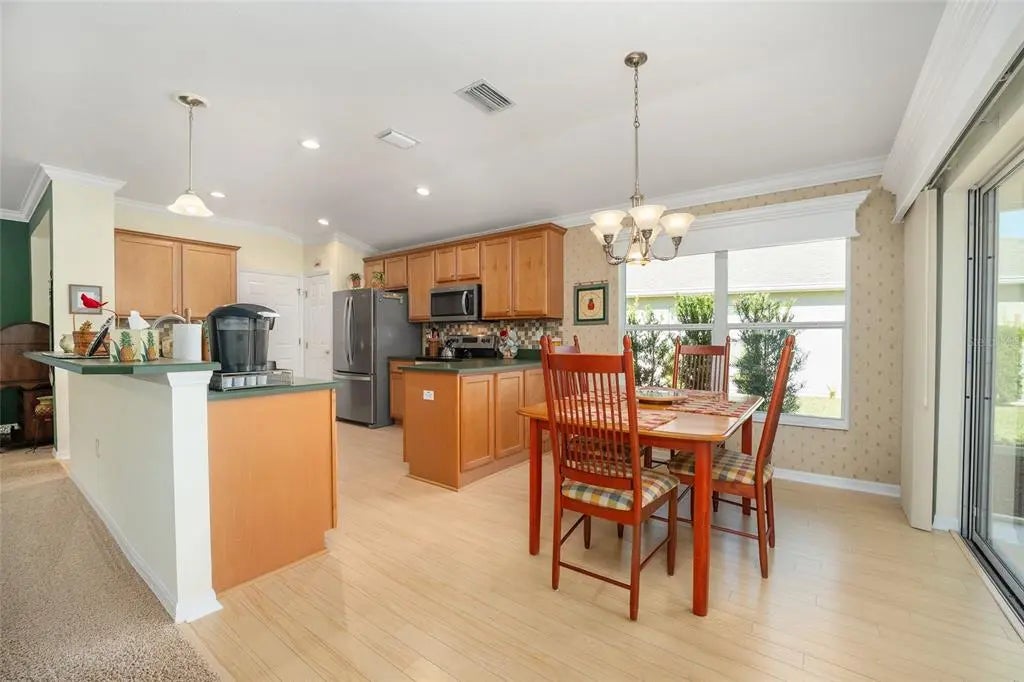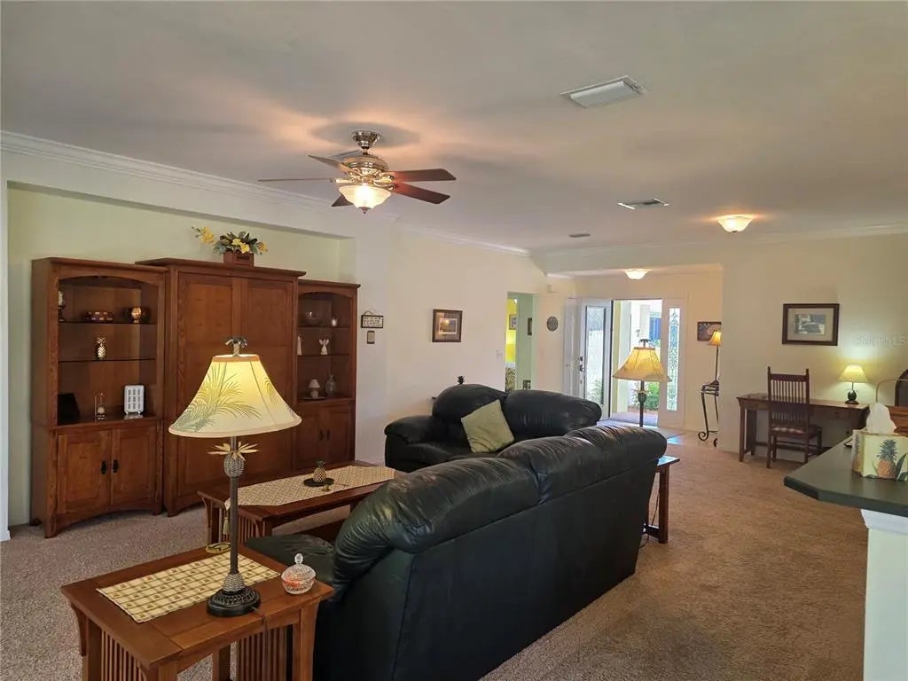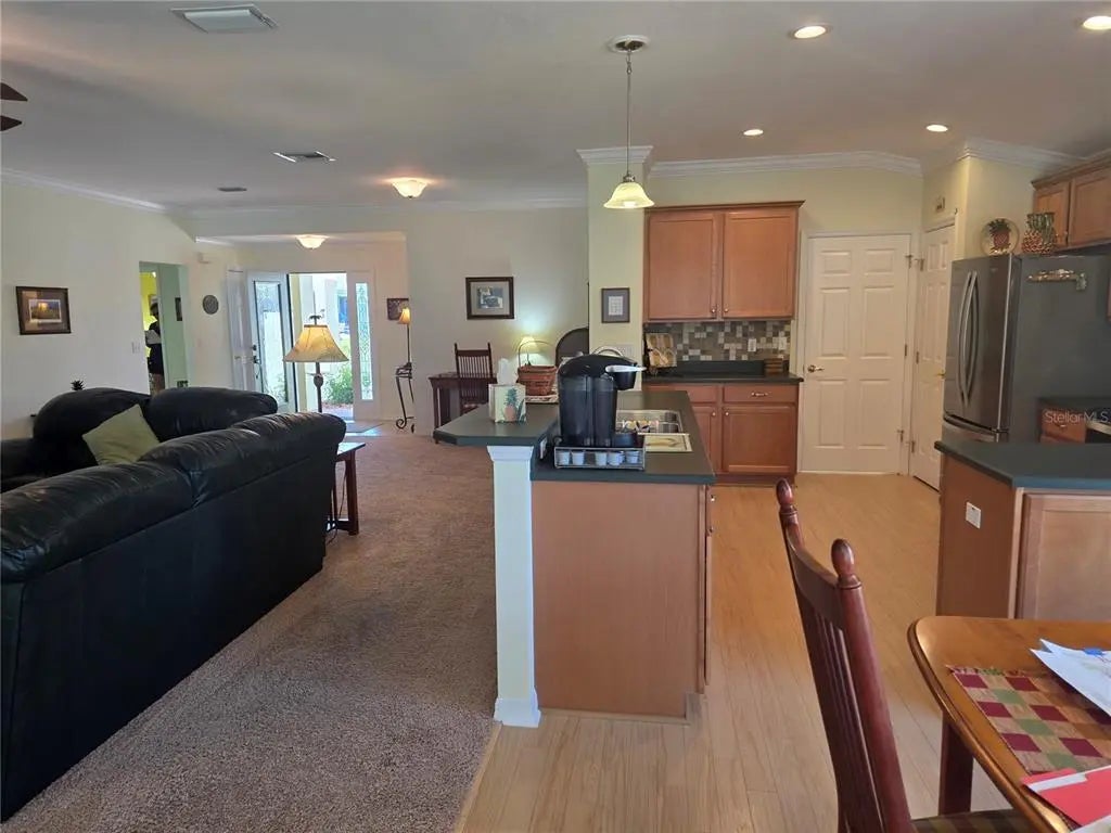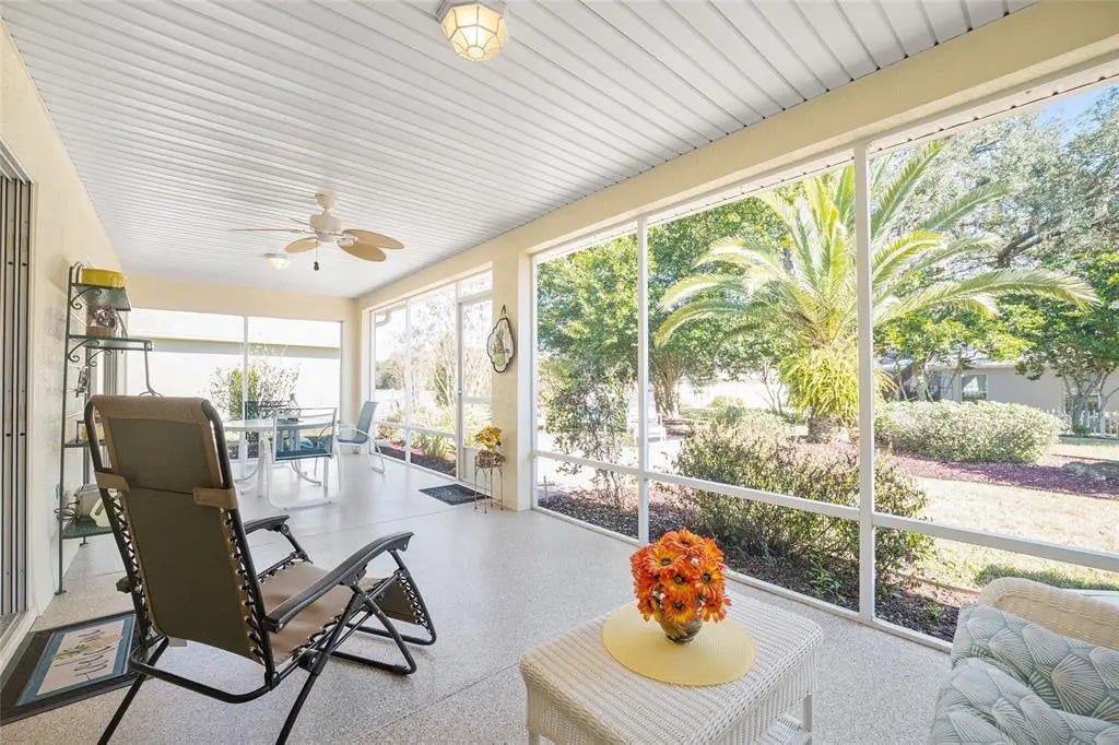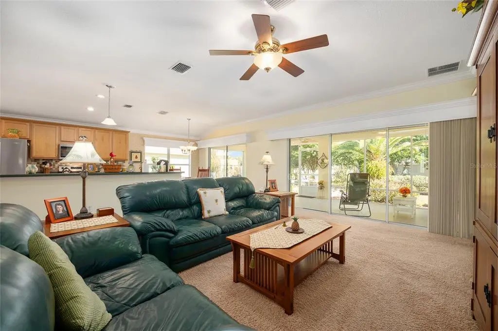 SELLER GIVING $2500 CREDIT AT CLOSING! This popular Elkridge model (3/2/2) is being offered to the market for the first time. The current owner, a seasonal resident, has ensured the home remains well-maintained and gently used. This attractive property features numerous upgrades and updates, including new smoke alarms (2024), a new garage door opener (2024), and a new water heater (2024). Stainless steel appliances were installed (2023), and custom wooden window cornices were added. As a preventative measure, the home was re-piped (2021). A new roof was installed (2019). Crown molding enhances the family room. The front door includes a decorative glass insert and sidelight, while the screened lanai with painted flooring provides a comfortable setting to enjoy the backyard. Outdoor amenities include a circular paver patio and BACKYARD LANDSCAPED GARDENS DESIGNED FOR TRANQUILITY with hacienda landscaping in the front. Additional features comprise a paver driveway, sidewalk, and front porch. The kitchen boasts Tarkett Oak laminate flooring. (The green accent walls have been repainted.) ***This property is offered TURNKEY with limited exceptions.***