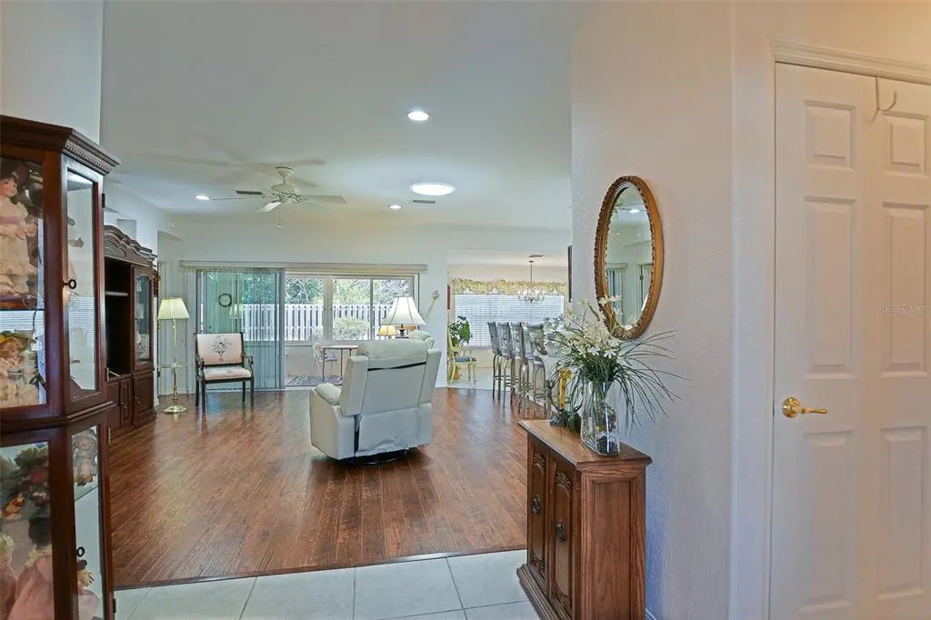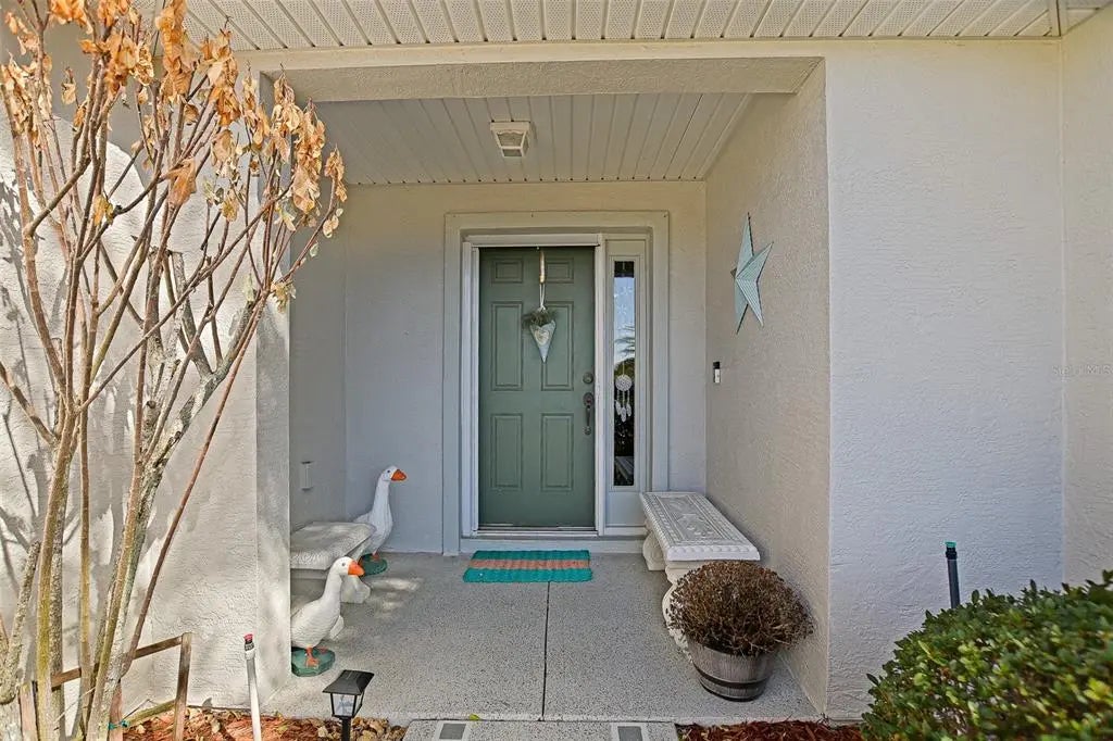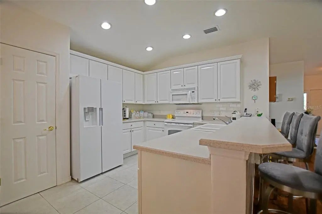 Popular floor plan, not too big and not too small, the Citation model boasts two bedrooms and two baths plus a den with French doors. The home only has carpet in the Primary bedroom and other rooms are tiled or have luxury vinyl laminate. The house has been re-piped. The roof was re-shingled in 2024 and has a new water heater. A plus is a whole house Brita pro water softener. The home is situated on a private lot in an area of the newest homes in the community and close to the North entrance. The second bedroom has a Murphy wall bed and extra storage cabinets that convey. The light kitchen cabinets have 36 in. uppers with crown molding and pull-out shelving and light appliances with newer refrigerator and dishwasher. There is a solar tube between the kitchen and living room for added light. The garage is extended to 25 ft and has pull down attic storage steps, a sink and has a screen enclosure and the screening was recently renewed. A spacious lanai is enclosed with glass windows and leads to an outside open patio. Driveway, sidewalk and lanai have a painted finish. The entertainment center, dining room set and master bedroom furniture can convey with purchase if desired. Don't miss this great home which that has only one owner and is well maintained.