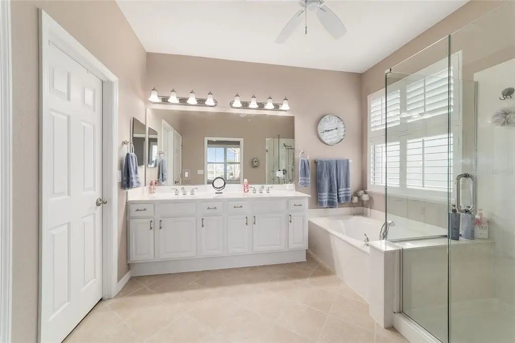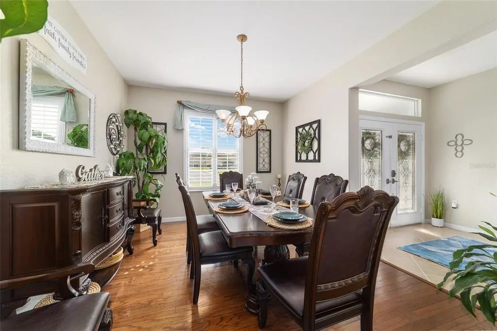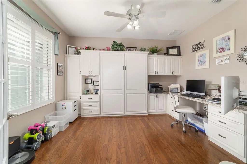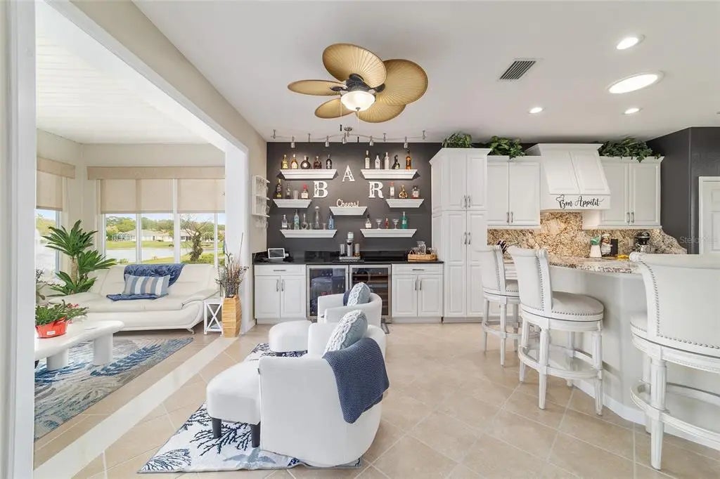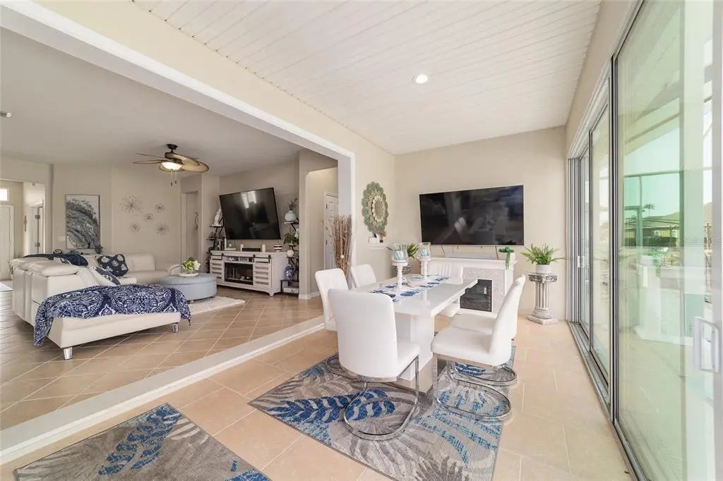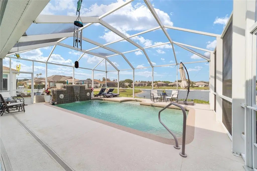 Pool House with Stunning Water Views! Situated in Del Webb’s Spruce Creek Golf & Country Club, an exclusive 55+ community between The Villages and Ocala, this home boasts double beveled-glass entry doors that open to a foyer with tiled floors and water views. The spacious kitchen offers plenty of 42" cabinetry. The primary suite features a water view, engineered hardwood floors, and a large walk-in closet. The den can be used as a third bedroom with the addition of the built-in Murphy Bed. An extended two-car garage, plus a golf cart garage with extra storage, provides ample space. Enjoy a designer-painted driveway and walkway, along with a large, screened lanai overlooking the water—ideal for entertaining guests. Recent updates include a new roof (2023), fresh interior and exterior paint (2023), a whole-house generator and Solar Panels (owned). Well for irrigation , liquid light in pool enclosure.This unique waterfront home is move-in ready and meticulously maintained—don’t miss your chance purchase this beautiful home!