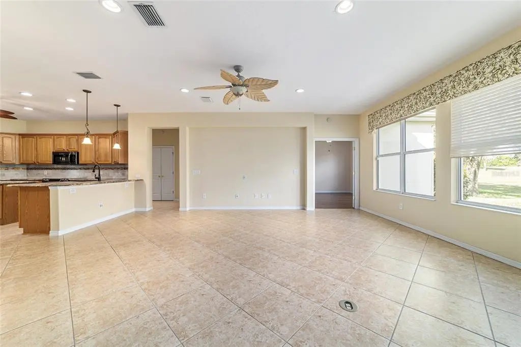 For those seeking exceptional golf course views in a 55+ gated community, this well-appointed Lexington Model (3 bedrooms, 2 baths plus an office) presents a prime opportunity. Situated directly on the fairway, the property showcases expansive panoramic vistas. The elegant double-door entry leads to impressive sightlines across the golf course. A spacious kitchen—complete with backsplash, island, and dedicated desk area—flows seamlessly into the generous family room. Both formal dining and living rooms are ideal for entertaining guests. The split floor plan offers privacy for visitors, while the sizable master suite provides direct access to the enclosed lanai. Additional features include a two-car garage and a separate golf cart garage. Residents can enjoy Spruce Creek GCC's extensive amenities: guard-gated security, three swimming pools, a fitness center, walking trails, baseball field, pickleball and basketball courts, billiards room, clubs, social activities, clubhouse, restaurant, and more. There are no bonds or CDD fees. It is conveniently located near The Villages, lakes, restaurants, shopping, hospitals, and medical facilities. Contact us today to schedule a private showing.