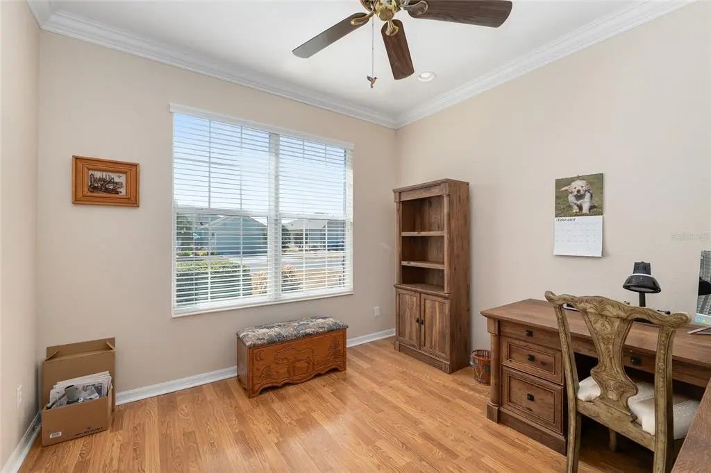 - Ceiling Fan(s), Crown Molding, Primary Bedroom Main Floor, Window Treatments