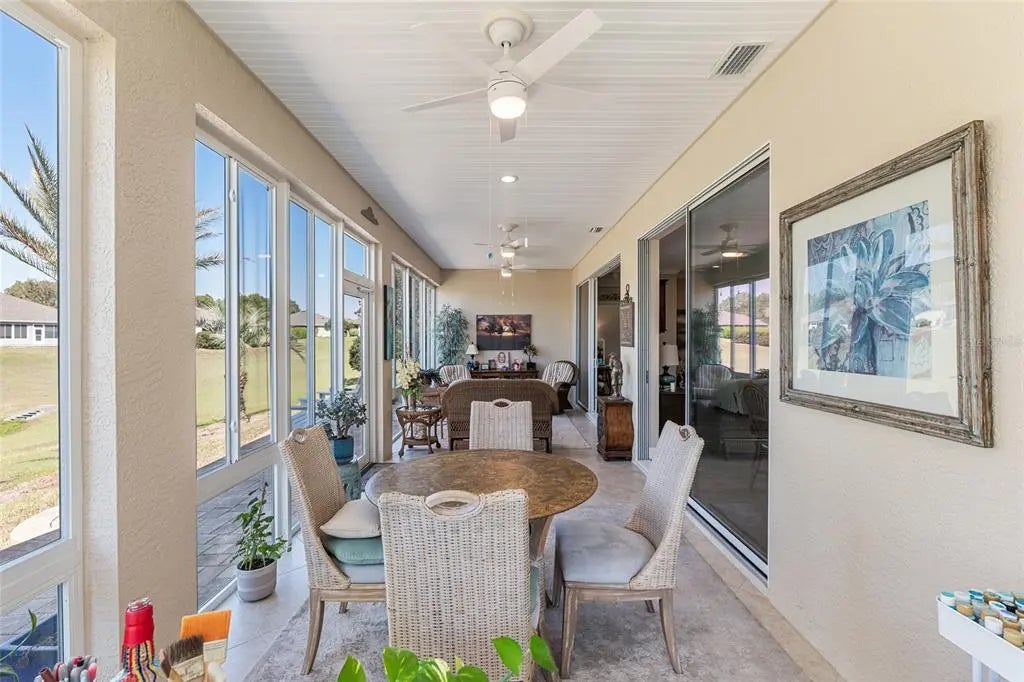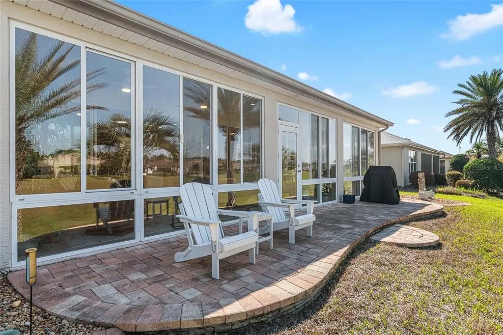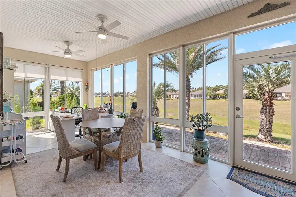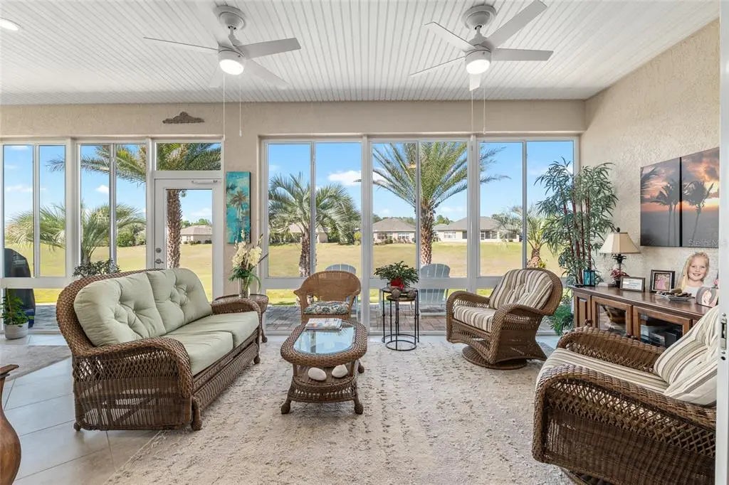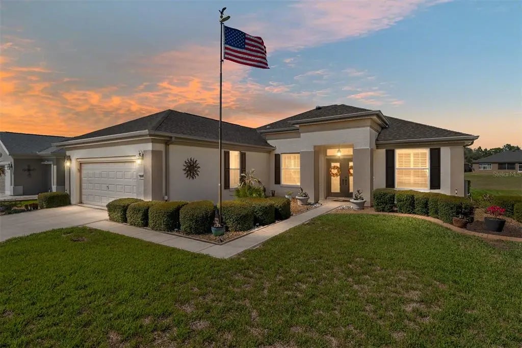 How about a 10-acre backyard that is maintenance free, you do not have to care for?? This beautifully upgraded Johnstown model features a custom-coated driveway and walkway leading to an elegant double-door foyer with decorative cut glass inserts. Inside, you’ll find a private library with French doors, crown molding, and thoughtful finishes throughout. The climate-controlled, north-facing tiled lanai is enclosed with full-length thermal pane glass windows, creating a perfect year-round retreat. Natural light fills the home through two solar tubes, enhancing the bright and airy feel. The kitchen is equipped with granite countertops, white cabinetry, and stainless steel appliances. The primary suite boasts a luxurious custom walk-in Roman shower and upgraded double vanities with quartz countertops. Additional upgrades include new ceiling fans, a remodeled guest bath with a granite countertop, and NEW durable vinyl plank flooring throughout the home. The extended garage features an epoxy-coated floor and overhead storage racks for added convenience. Outdoor living shines with a beautiful paver patio accented by a palm tree island, easy-care stone landscaping, concrete curbing, and even a flagpole. Energy-efficient features such as a solar attic fan and whole-house water filtration system add even more value. ROOF – 2020 HVAC - 2016 AWARD-WINNING Del Webb Spruce Creek Golf & Country Club is a GATED, 3,250 home, +55 Community with over 70 clubs, 3 pools, 3 spas, a Clubhouse, a Fitness Center, Bocce Ball, Shuffleboard, 12 Pickle ball Courts, 7 Tennis Courts, Sand Volleyball, Water Volleyball, Lake Vista Gazebo, Pavilions, Walking Paths and so much more! Come see this beautiful community with a GORGEOUS Tree Canopy on the Boulevard and its Restaurant, Liberty Grille. Come, enjoy the four (4) 9-hole Golf Courses today and begin living your BEST LIFE! DON'T WAIT TO SEE THIS SHOW QUALITY HOME! This is a very special home…Don’t miss it!