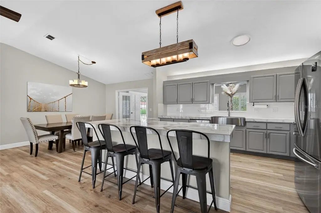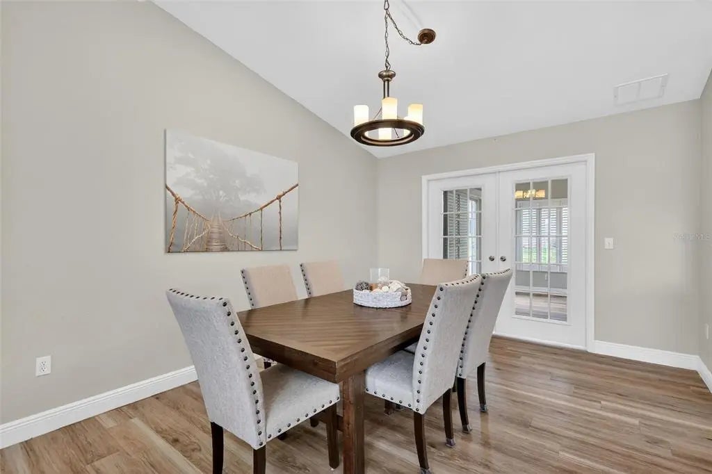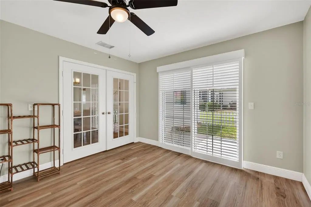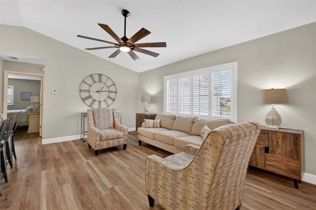 Beautifully updated 3 bedroom, 2 bath Holly on a well-maintained corner lot, in Del Webb Golf & Country Club. The home features a totally redone interior with an inviting open floor plan. Freshly painted, LVT flooring and plantation shutters throughout, no carpet. The upgraded kitchen has modern finishes, solar tube, tiled countertops and SS appliances give style and function, perfect for everyday living and entertaining. Enjoy the added living space of a large enclosed Florida room, under air and heat, is ideal for relaxing or gathering with friends. Outside the sliding glass door is a fenced area perfect for your small pet(s). Extended garage with side entry for golf cart. Quality updates throughout and exceptional care inside and out, this home combines comfort and charm. Every detail reflects pride of ownership and meticulous care throughout. This move-in ready home, combines comfort, style and functionality making it a true standout. The home is just not move-in ready, it's ready to be lived in and loved. HVAC 2016, water heater 2023, roof 2013. Furnishings available.