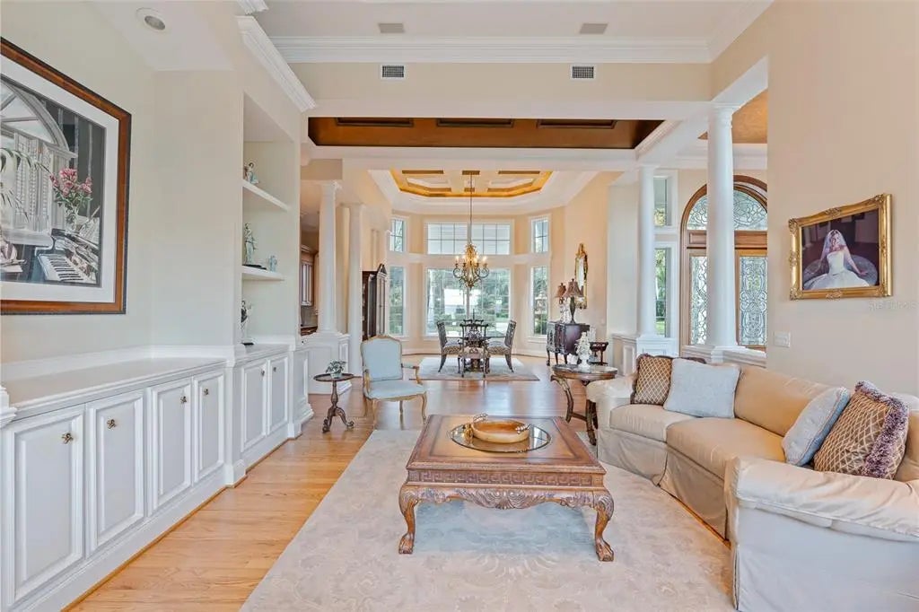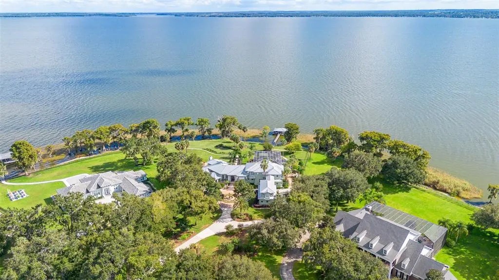 Experience a rare blend of serenity, sophistication, and lakefront living on the pristine shores of Lake Harris, part of Central Florida’s famed Harris Chain of Lakes. Tucked behind a private gated drive, this extraordinary property spans 3.06 acres with the added benefit of 46± acres of protected conservation land, creating a sense of unrivaled privacy and natural beauty. Inside the 8,596-square-foot custom residence, craftsmanship takes center stage. Walls of windows capture shimmering water views from nearly every room, while rich design details, from diagonal-laid hardwood floors and porcelain tile to tongue-and-groove, barrel, coffered, and tray ceilings, set an elegant tone. Handcrafted millwork, a stunning leaded glass entry, granite surfaces, multiple fireplaces, and upscale finishes add warmth and timeless appeal. The home was designed for both quiet moments and unforgettable gatherings. An open chef’s kitchen flows into welcoming dining and living areas, perfect for entertaining. Additional spaces include a first-floor game room with its own chilled wine room, a private office with custom woodwork, a dedicated homework station, and a versatile bonus room over the garage, ideal for a theater, guest suite, fitness area, or creative retreat. Each bedroom features a private ensuite bath, offering comfort and privacy for family and guests alike. Step outside to an outdoor haven where you can wander a serene path to a lakeside firepit, relax by the pool, or enjoy your private boathouse with dual lifts for effortless days on the water. The expansive, beautifully landscaped grounds have even hosted picturesque weddings, making this estate as enchanting for events as it is for everyday living. All this tranquility comes with surprising convenience. You’re moments from charming downtown Leesburg and Mount Dora, with nearby golf, shopping, dining, and healthcare options such as UF Health and AdventHealth. Leesburg International Airport is close at hand, while Disney and Orlando International Airport are less than an hour away. This is more than a home, it’s a private lakeside retreat designed for refined living, effortless entertaining, and unforgettable memories.