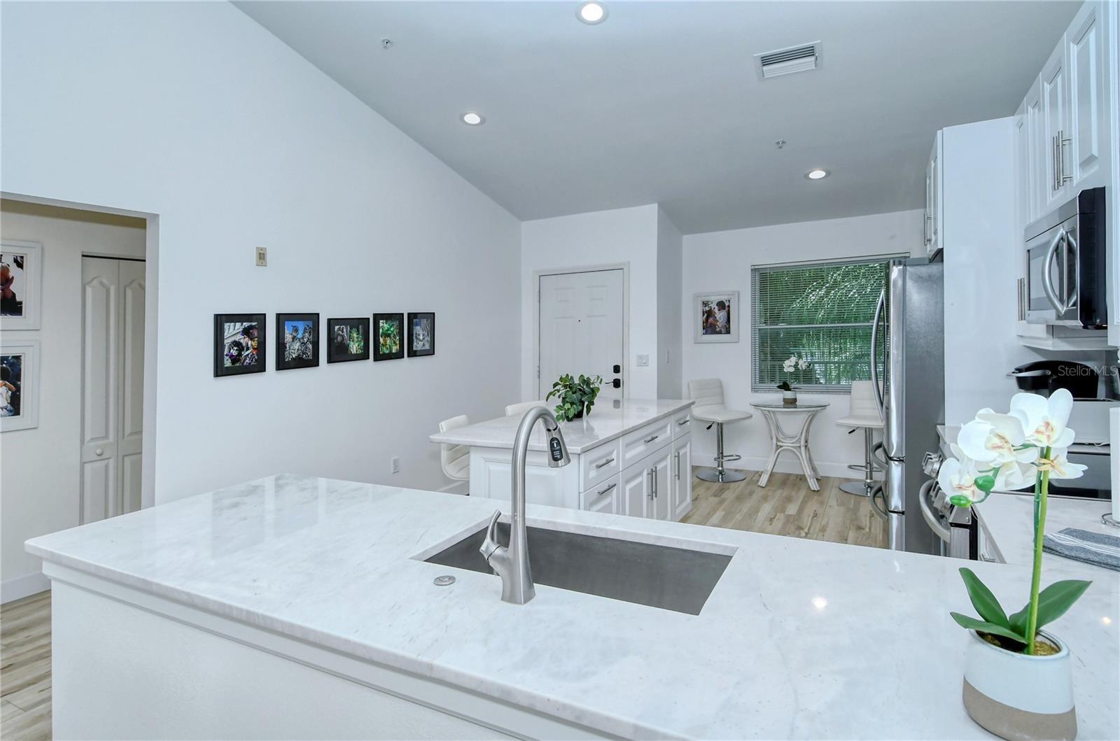 RENTED JAN., FEB., MARCH, 2026 - available APRIL THRU DECEMBER 2026: BEAUTIFULLY UPDATED: Enjoy the view across the golf course from the screened lanai of this exceptional 3rd-floor vacation condo at the Terraces of Stoneybrook, NEW KITCHEN, NEW APPLIANCES, NEWLY REMODELED BATHROOMS, NEW FLOORING - It's stunning. Play golf, hit the tennis courts, take a dip in the crystal clear heated pool or enjoy a game of pickleball, it's all here waiting for you. The large master suite with sliding glass doors out onto the lanai has a king-sized bed and en-suite has been upgraded and has walk-in shower. The guest bedroom has twin beds and an adjacent guest bathroom. This bright and cheerful interior with spacious high ceilings offers over 1200 sq. ft. of living space. The condo is well furnished and is equipped with flat-screen smart TVs and internet access. Stoneybrook Golf & Country Club has undergone a Kipp Schultes designed golf modernization, and is said to be one of the best courses on the West Coast of Florida. Enjoy Har-Tru tennis courts, bocce ball, fitness center, pro shop, full-service restaurant, bar, and outdoor patio and is centrally located in Palmer Ranch close to area beaches, shopping, restaurants, and Costco and the Legacy walking and biking trail are nearby. The golf membership transfers (inquire about the new fee schedule) if desired or you can take out a social membership for a nominal fee and enjoy all the country club has to offer without golf.