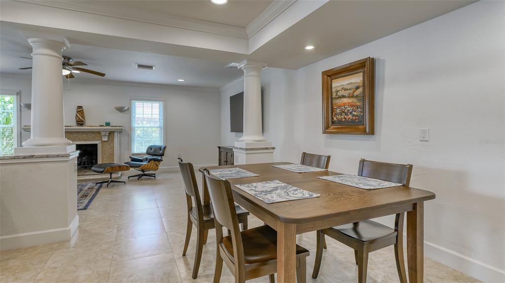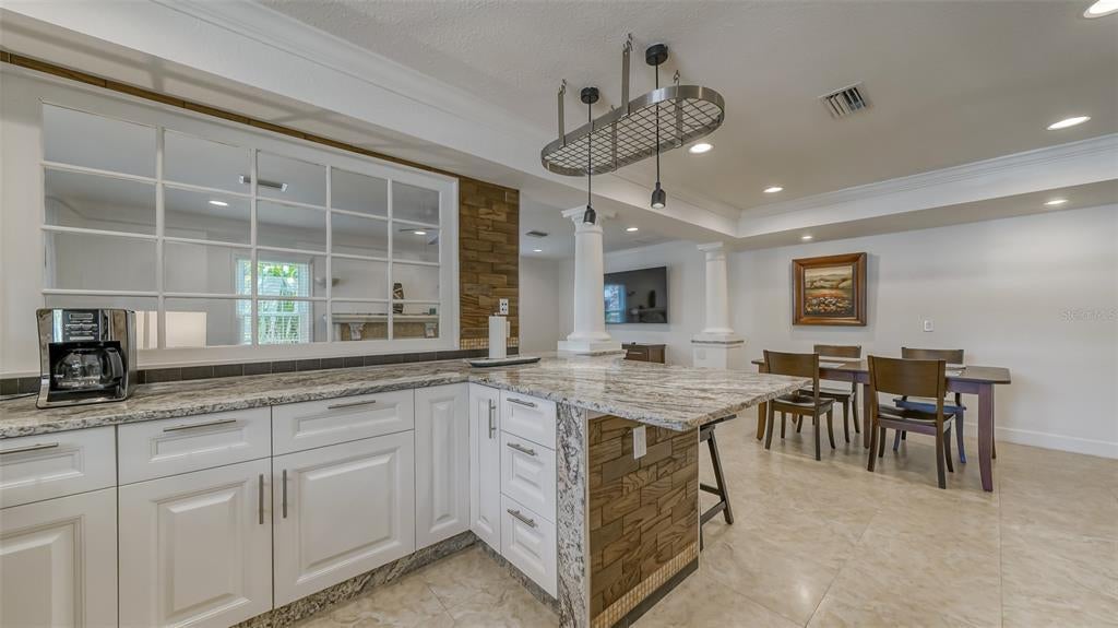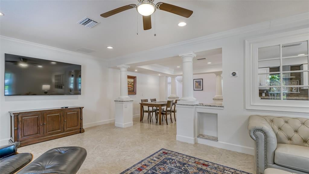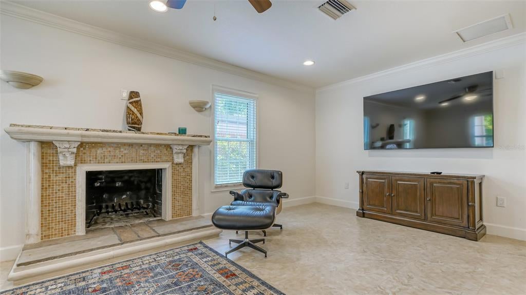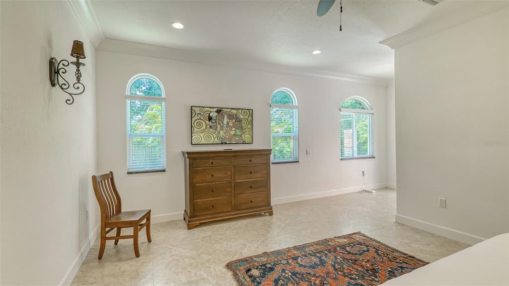 - Built-in Features, Ceiling Fans(s), Crown Molding, Kitchen/Family Room Combo, Primary Bedroom Main Floor, Stone Counters, Walk-In Closet(s)