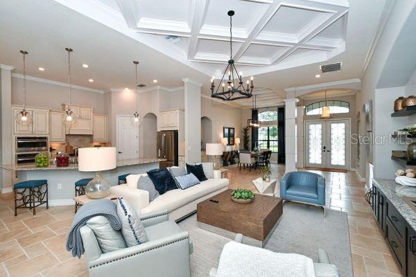 - Built-in Features, Ceiling Fans(s), Coffered Ceiling(s), Crown Molding, Dry Bar, Eat-in Kitchen, High Ceilings, Kitchen/Family Room Combo, Primary Bedroom Main Floor, Open Floorplan, Solid Wood Cabinets, Split Bedroom, Stone Counters, Walk-In Closet(s), Window Treatments