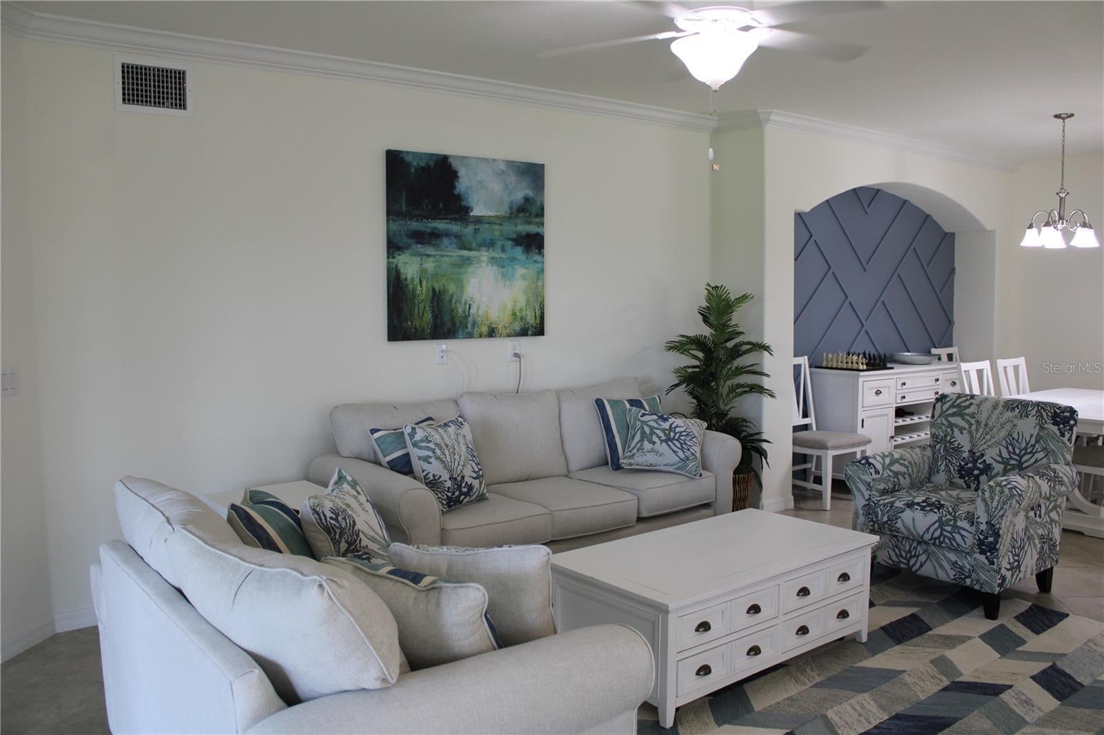 - Ceiling Fans(s), Crown Molding, High Ceilings, Kitchen/Family Room Combo, Living Room/Dining Room Combo, Primary Bedroom Main Floor, Open Floorplan, Split Bedroom, Stone Counters, Thermostat, Walk-In Closet(s), Window Treatments