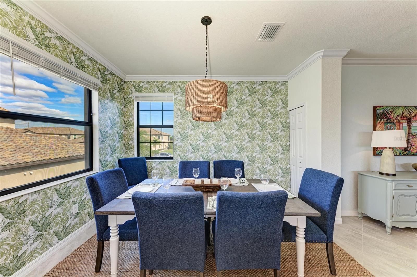 - Ceiling Fans(s), Crown Molding, Eat-in Kitchen, Kitchen/Family Room Combo, Open Floorplan, PrimaryBedroom Upstairs, Smart Home, Solid Wood Cabinets, Split Bedroom, Stone Counters, Thermostat, Walk-In Closet(s), Window Treatments