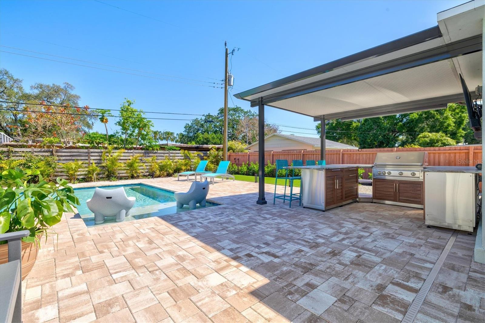 Welcome to the Ringling Retreat, a luxurious family compound in the heart of downtown Sarasota. The property sits just a few blocks from the East end of Main Street downtown and is perfectly walkable to the Legacy Trail, Payne Park, & a number of shops & restaurants. A screened entryway in the front greets you before stepping through the front door into a light and bright living area with views out to the new heated pool & generous seating including a queen sleeper sofa & two club chairs. A 65 inch mounted tv in this room w/ complimentary streaming services is accessible from the living room as well as the 3 stools at the breakfast bar separating the living space from the designer kitchen. The kitchen offers SS appliances & European style cabinets that are all labeled for your convenience & offer soft close hardware. Adjacent to the kitchen is a large dining area with seating for up to 12. The main house offers 3 large bedrooms & 2 well appointed bathrooms. The bed configuration is as follows: Bedroom 1 is just off the living room and is separated by french doors with privacy curtains. This room offers sleeping for up to 4 guests w/ two stand alone twin beds as well a twin over twin bunk bed. An open shelf closet, nightstand and mounted tv complete the set up. Bedroom 2 is located on the Master wing of the house with good separation from the Master bedroom and with easy access to the guest bathroom. This room offers a queen bed with two nightstands, a dresser and a large reach in closet. A large flat screen tv sits on top of the dresser. The Master bedroom is huge and offers a king bed with two nightstands, a dresser and a mounted tv on one of two shiplap accent walls. The Master has a zen feel and offers a large walk in closet, separate water closet/toilet area, and a recently remodeled spa-like bathroom with tiled shower, and double vanity sinks. Access to the courtyard & pool area is available from the Master. Step beyond the kitchen & dining area to an exterior covered breezeway to find a laundry closet to the right as well as a beach essentials closet to the left. The keypad enabled door between both closets grants access to the guest house which features a full living room w/ two large sofas including a queen pullout sleeper sofa as well as two club chairs. Adjacent to the living area is a full kitchen & eat-in kitchen area as well as a 2nd washer & dryer. Beyond the living space is a large bedroom w/ King bed, 2 night stands & mounted flat screen. This 2nd Master offers a walk in closet & full en suite bathroom. Beyond the breezeway & into the courtyard you'll find a large glistening pebble tec heated saltwater pool w/ an in-ground heated spa and large sun shelf that allows you to stay dry with your toes in the water. Two in-pool club chairs offer cupholders for your cold beverages as you soak up the Sarasota sunshine. Need some shade? We installed a Miami Dade hurricane rated patio with covered roof and an outdoor kitchen and bar area offering ample counter space and cabinetry, a mini fridge, and a premium 40" propane grill. 4 stools face the mounted TV so you can watch the game while your loved ones play nearby. Outdoor dining can be had either at the outdoor kitchen bar or the dining table with seating for 8 under a teal Sunbrella. On the far side of the pool you'll find a gorgeous putting area for golf enthusiasts and children alike. New landscaping and landscape lighting make this feel like a resort at night.