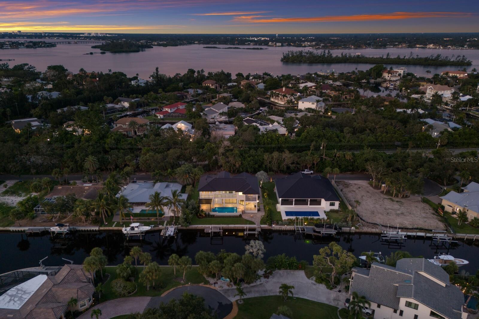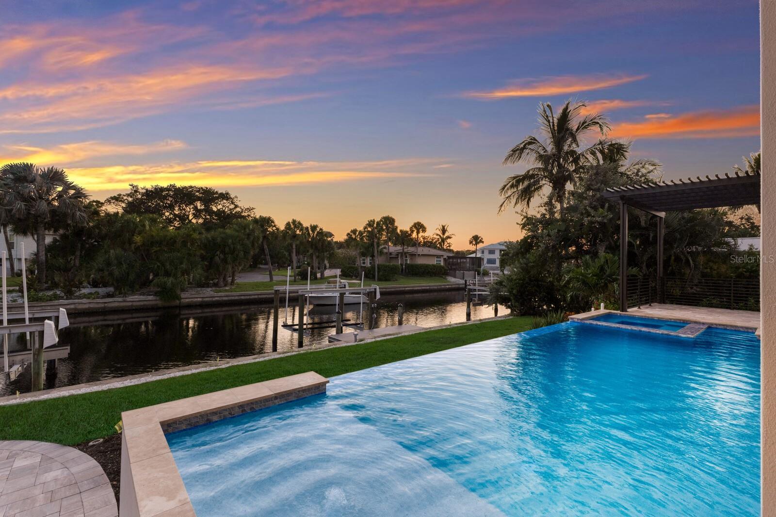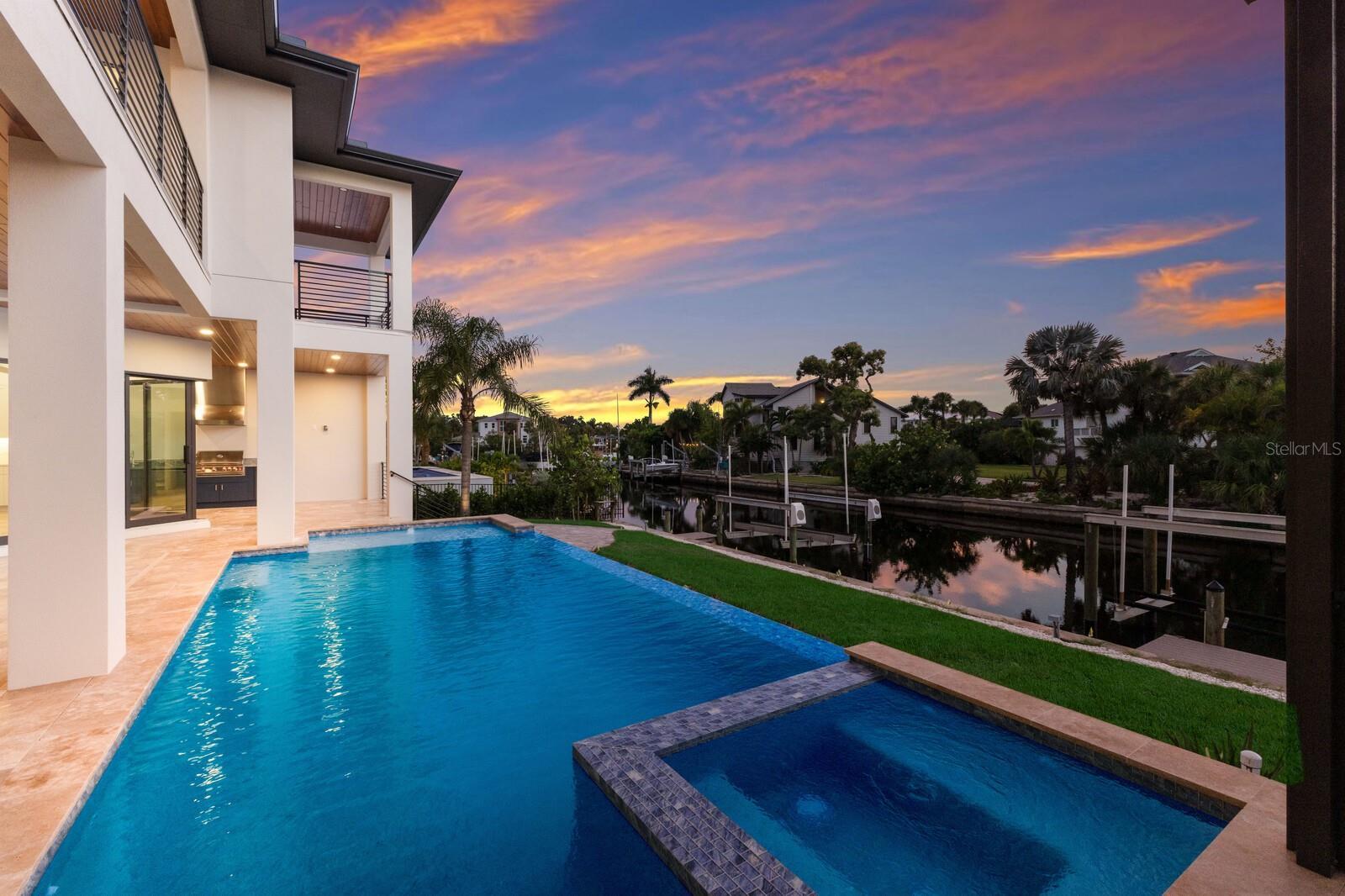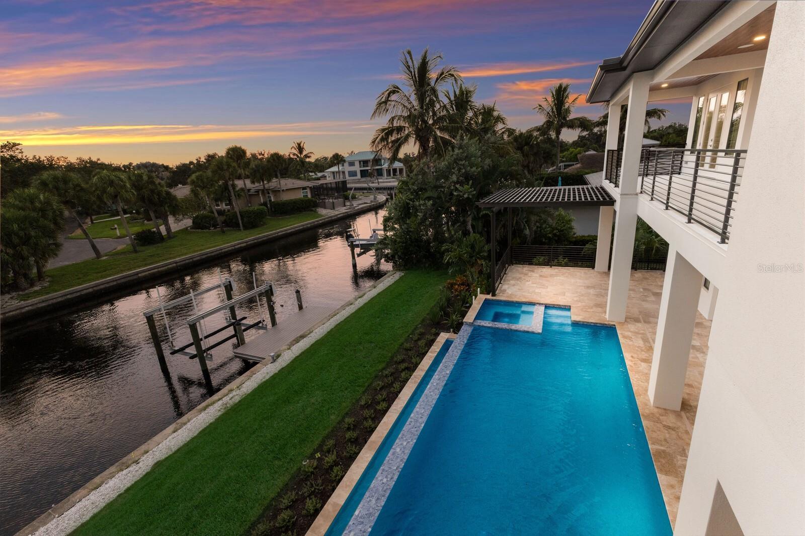 Under contract-accepting backup offers. One or more photo(s) has been virtually staged. Welcome to a brand-new coastal masterpiece that redefines luxury living on world-renowned Siesta Key. Designed with both sophistication and comfort in mind, this waterfront retreat blends timeless architecture with modern amenities, all just moments from Siesta Village and the powdery sands of Siesta Beach. Inside, soaring ceilings and walls of glass bathe the home in natural light, while light wood floors bring warmth and elegance throughout. The heart of the home is a double-island chef’s kitchen, complete with premium appliances, custom cabinetry, and a generous walk-in pantry—perfect for both intimate family meals and grand entertaining. This residence offers four en suite bedrooms, including two primary suites (one upstairs and one downstairs), providing flexibility and privacy for family or guests. An additional private office and 600± SF of unfinished space above the garage present endless possibilities for customization. Seamlessly integrated indoor and outdoor living spaces create a true resort-style atmosphere. Step outside to enjoy multiple balconies, a pool and spa overlooking the water, a fully equipped outdoor kitchen, and a dedicated pool bath. For the boating enthusiast, this property features two boat lifts and quick access—just five minutes by water to the open bay. The location at the end of a quiet dead-end street ensures both serenity and privacy, with the added bonus of no homes directly across the canal, offering wide and peaceful views. This is more than a home; it’s a statement of waterfront luxury and the perfect canvas for your Siesta Key lifestyle. Days on market shows from pre construction. Certificate of occupancy issued September 2025.