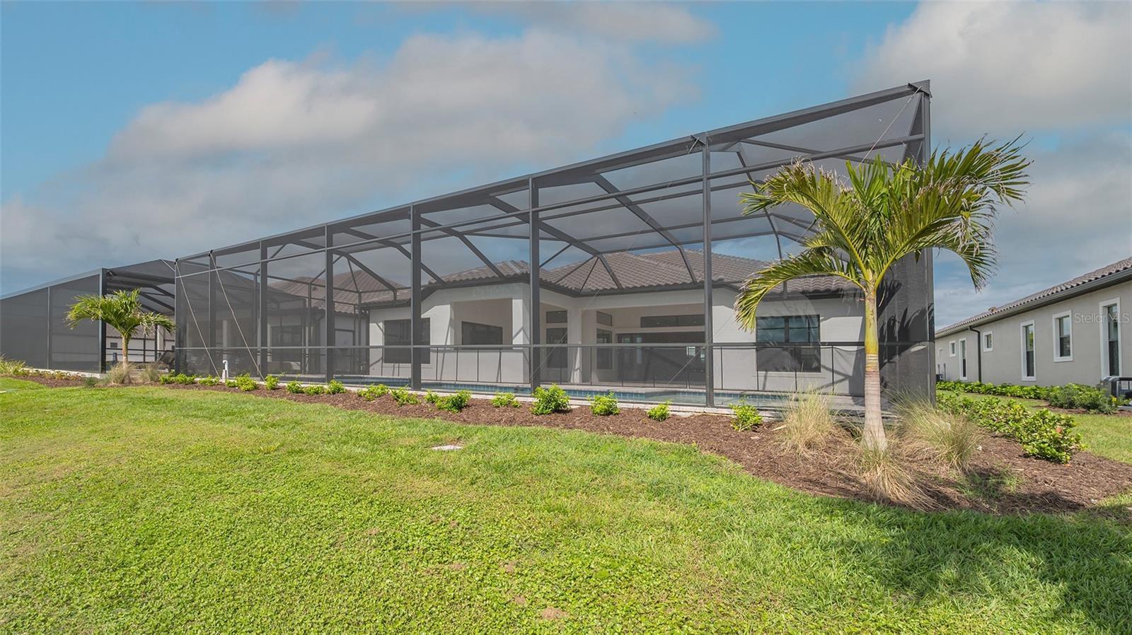 This beautiful semi-custom 2726 sq. ft. open floor plan by Neal Signature Homes has 3 bedrooms and 3 baths and a 3-car courtyard garage. It includes two bathrooms and a full pool bath. The kitchen is equipped with all the latest features and design and overlooks the large great room. With 12 ft. ceilings and oversize doors and windows, the entire home is light and bright. The master bedroom has two large walk-in closets that lead into the Master Bath area. With a soaking tub, step in glass shower and double vanities it feels like a spa retreat. The large lanai/pool area features a pool/spa combination and clear view screen creating a seamless transition from the inside of the home to the outside entertainment area. This beautiful new floor plan has a stunning water view and a golf course across the street.