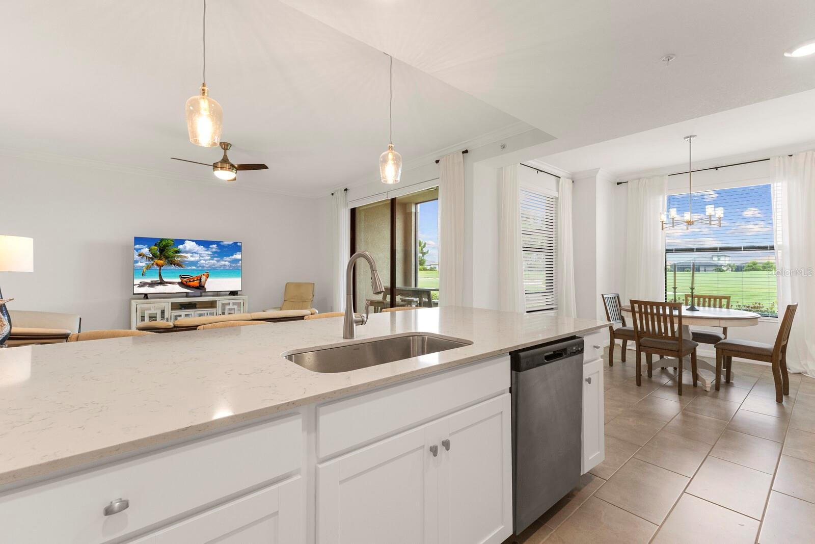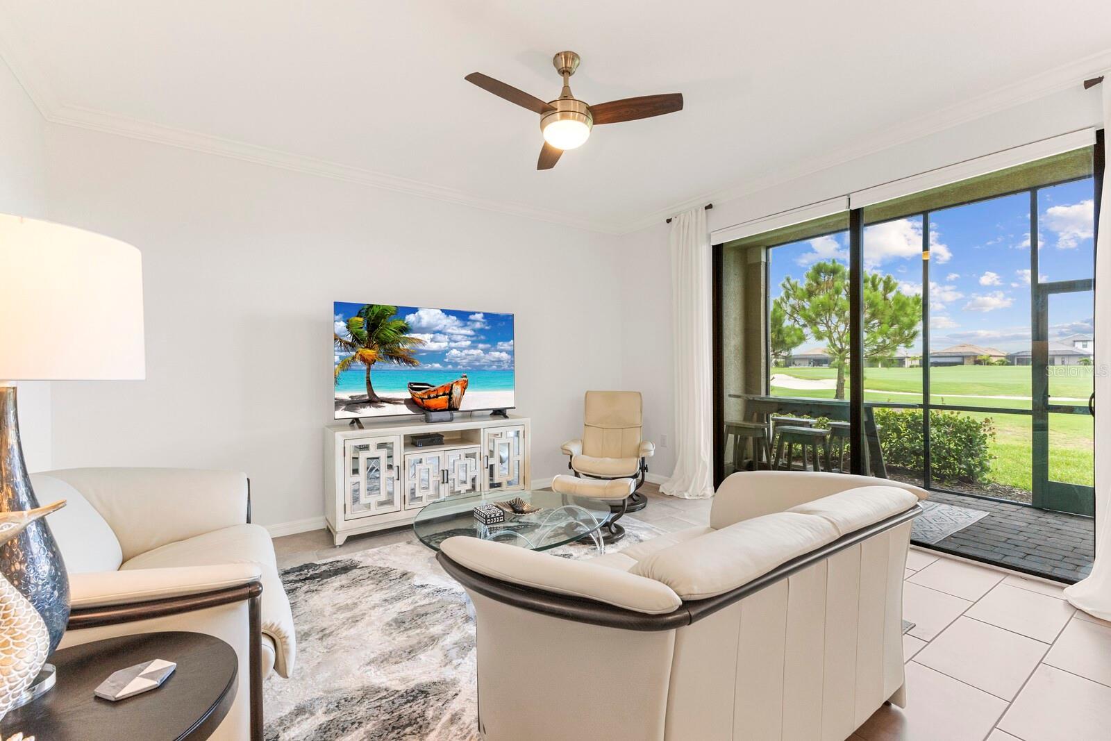 Available April 2026. Beautifully Furnished 2-Bedroom + Den First-Floor Veranda Overlooking the 9th Hole – Lakewood National Golf Resort. Relax and unwind in this stunning first-floor Diangelo II model veranda, fully furnished and tastefully decorated, located in the sought-after Golf Resort Community of Lakewood National. This spacious 2-bedroom, 2-bath condo with a separate den/study offers an open floor plan, providing a well-appointed kitchen with stone countertops, a large island, breakfast bar, and stainless-steel appliances — all opening seamlessly to the living and dining areas, perfect for entertaining or simply enjoying serene golf course views. The primary suite is a true retreat, featuring a King-size bed, flat-screen smart TV, two walk-in closets, and a luxurious attached bathroom. The guest bedroom also offers a King-size bed, smart TV, and convenient access to the second full bath. The den serves as an ideal home office with a dedicated desk space, providing flexibility for work or additional guest accommodations. Enjoy nightly sunsets from your private, screened lanai overlooking the impeccably maintained Arnold Palmer-designed golf course. Additional features include an in-unit laundry room with full-size washer and dryer, high-speed Wi-Fi, Spectrum Cable, and smart TVs in all bedrooms and living spaces for modern convenience. A one-car detached garage provides extra storage for your golf clubs, tennis or pickleball gear, and more. Located directly across from the golf range, putting greens, clubhouse, and main resort pool, this unit offers unmatched convenience for enjoying all of Lakewood National’s world-class amenities. Experience luxury living and the ultimate Florida resort lifestyle. The Lakewood National amenities offer an exceptional resort lifestyle you and your family are sure to enjoy. Incredible amenities include; not one, but two 18-hole golf courses, full service tiki bar at the resort pool, full service spa, 8 clay tennis courts and 4 pickle ball courts, staffed fitness center, 2 bocce ball courts, full-time lifestyle director, and the new Grand Clubhouse is open! There is always something to do! Close to the Gulf beaches, shopping and dining, with easy access to I75 and all of Lakewood Ranch. Life is what you live, style is how you live it! Monthly rentals less than 6 months include utilities and are subject to sales and Resort Taxes (13%). * Monthly Rate December - April is $6,750.00.*