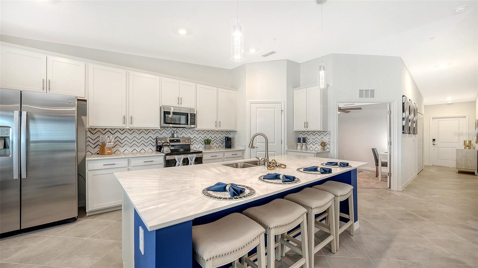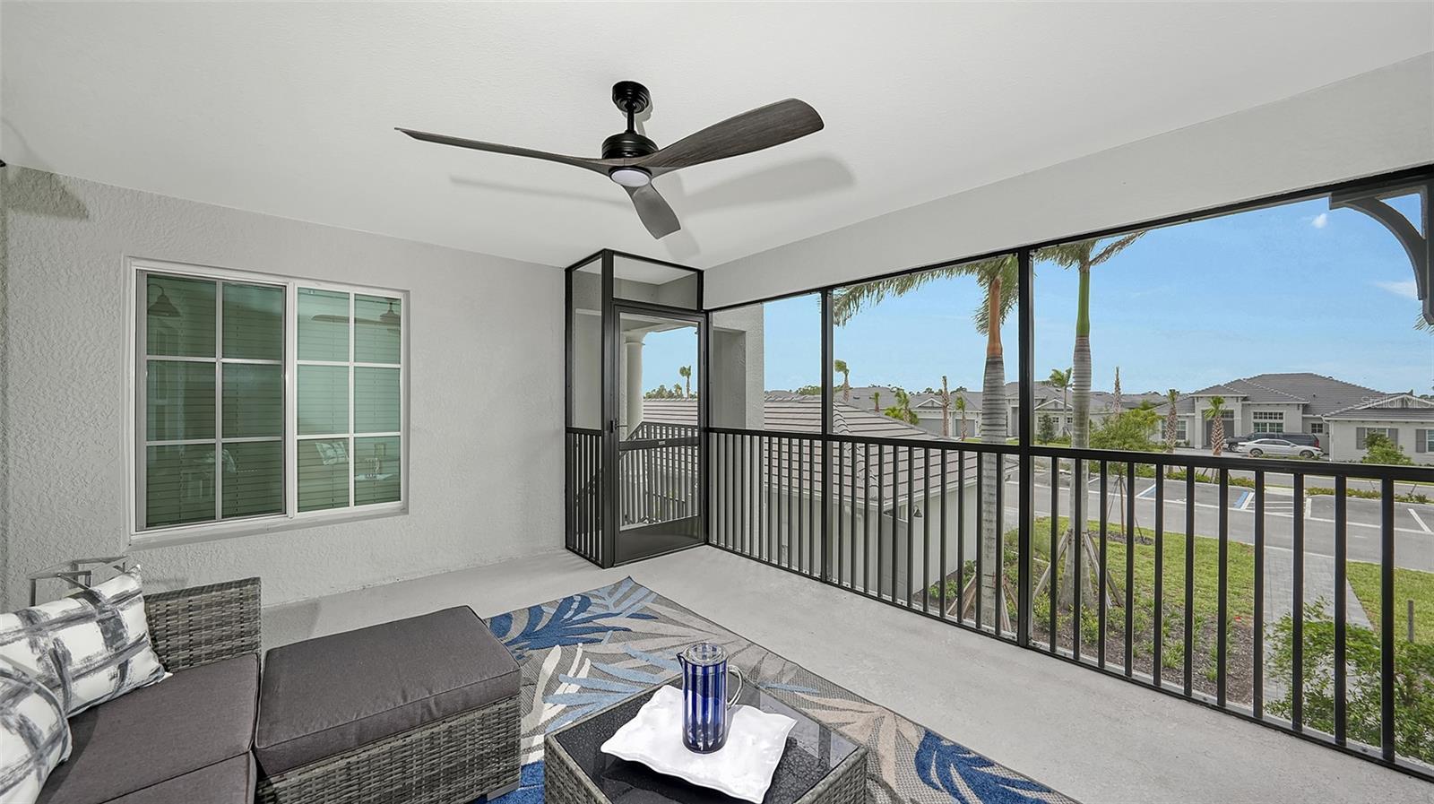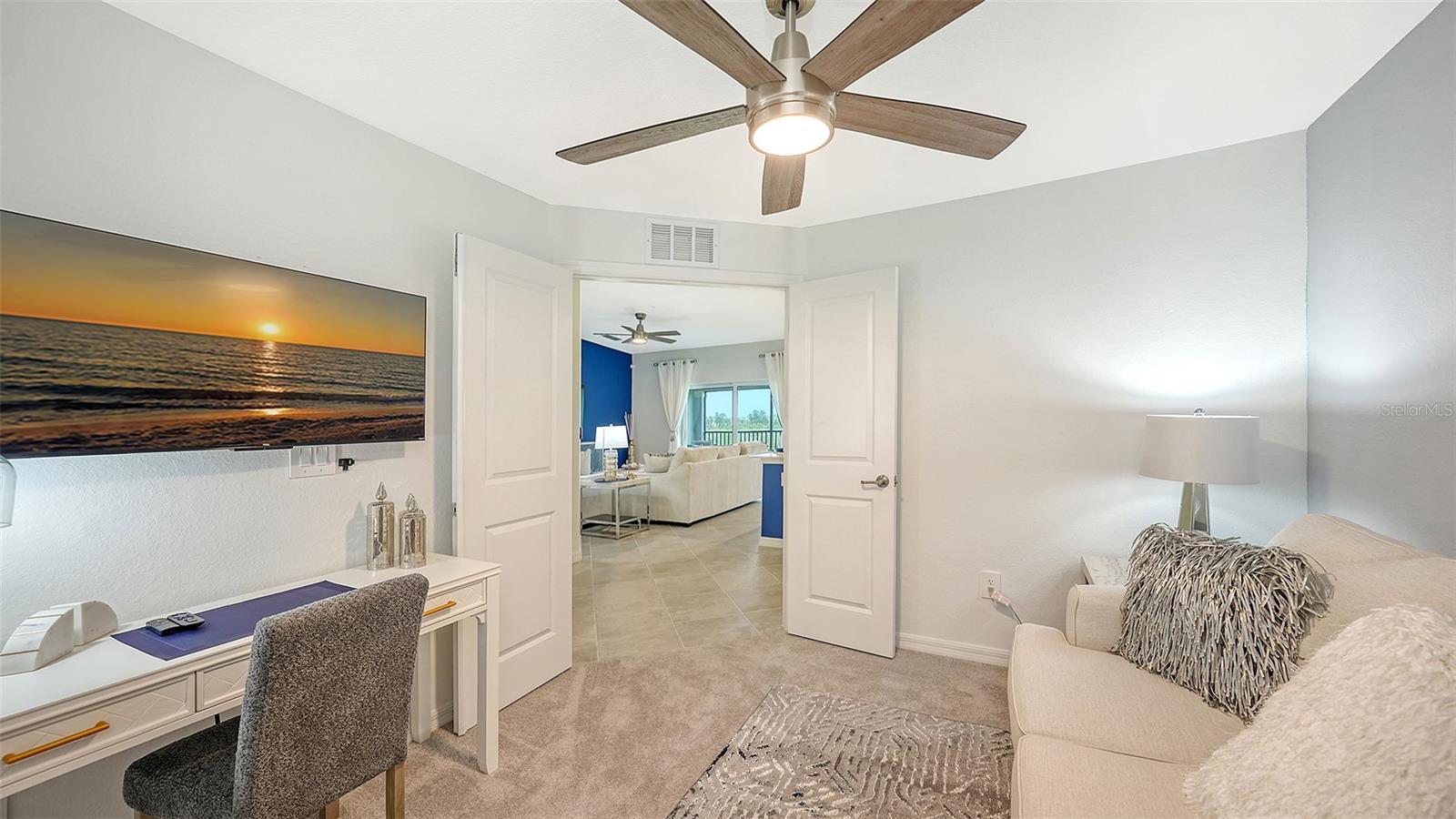 Stunning second floor 2-bedroom 2-bathroom condo with a den has stunning view of the fairway! This turnkey property has been professionally decorated with chic modern flair and upgrades galore which include a custom back splash and a built-in bar with wine refrigerator and upgraded lighting. Enjoy gorgeous sunny days and cross breezes on your very own front and back lanai. Functional open floor plan lends itself to Florida style living and entertaining. Nicely appointed kitchen boasts stainless steel appliances and granite counter tops. Master has king size bed and ensuite bathroom with double sinks and large tile walk in shower. Plenty of room for guests and family. Queen bed in the second bedroom. Third flex room has a pull-out sofa with a desk for additional sleeping quarters or working space. Separate detached 1 car garage for your car, golf clubs and beach gear. Entertain guests and enjoy meals as you watch the golfers navigate this new 18-hole Gordon Lewis designed course from your very own lanai! Amenities include TIKI BAR/RESTAURANT, FITNESS CENTER, RESORT STYLE SWIMMING POOL, POOLSIDE SERVICE, THREE SATELLITE POOLS, TENNIS COURTS, PICKLE BALL, BOCCE BALL AND MORE! Golf membership transfer available for purchase. $65.00 monthly minimum expenditure is required at the on-site Tiki- Bar/Restaurant (Alcohol Excluded). Easy access to I-75, downtown Wellen Park, Atlanta Braves Training stadium and local shopping and dining, minutes to Gulf Beaches and all Wellen Park has to offer. ***HIGH SEASON (DEC-APRIL) RATE~ $6,500.00 PER MONTH*** LOW SEASON (MAY-NOV.)
