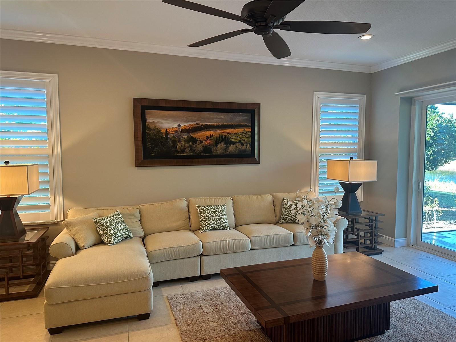 - Ceiling Fans(s), Crown Molding, High Ceilings, Living Room/Dining Room Combo, Open Floorplan, Solid Surface Counters, Solid Wood Cabinets, Thermostat, Walk-In Closet(s), Window Treatments