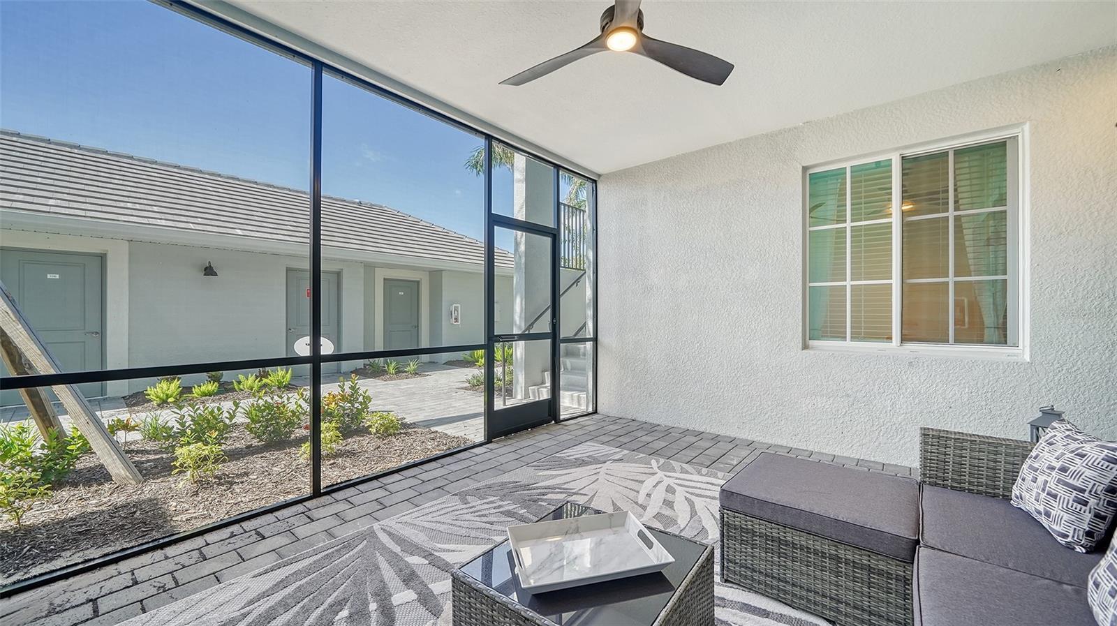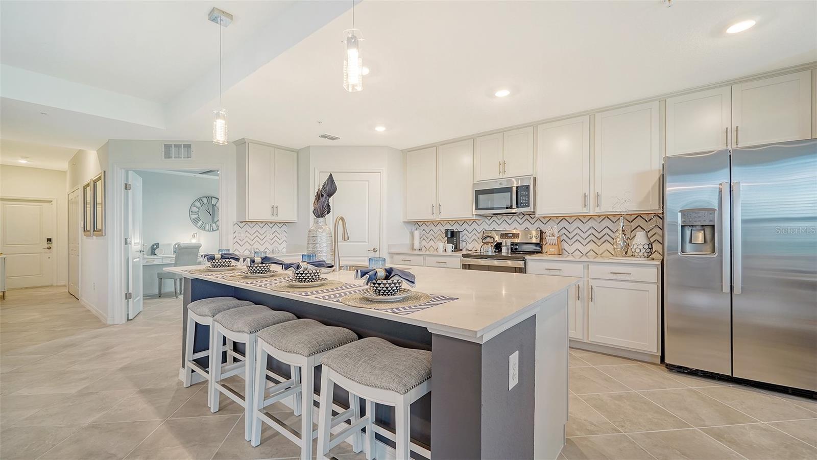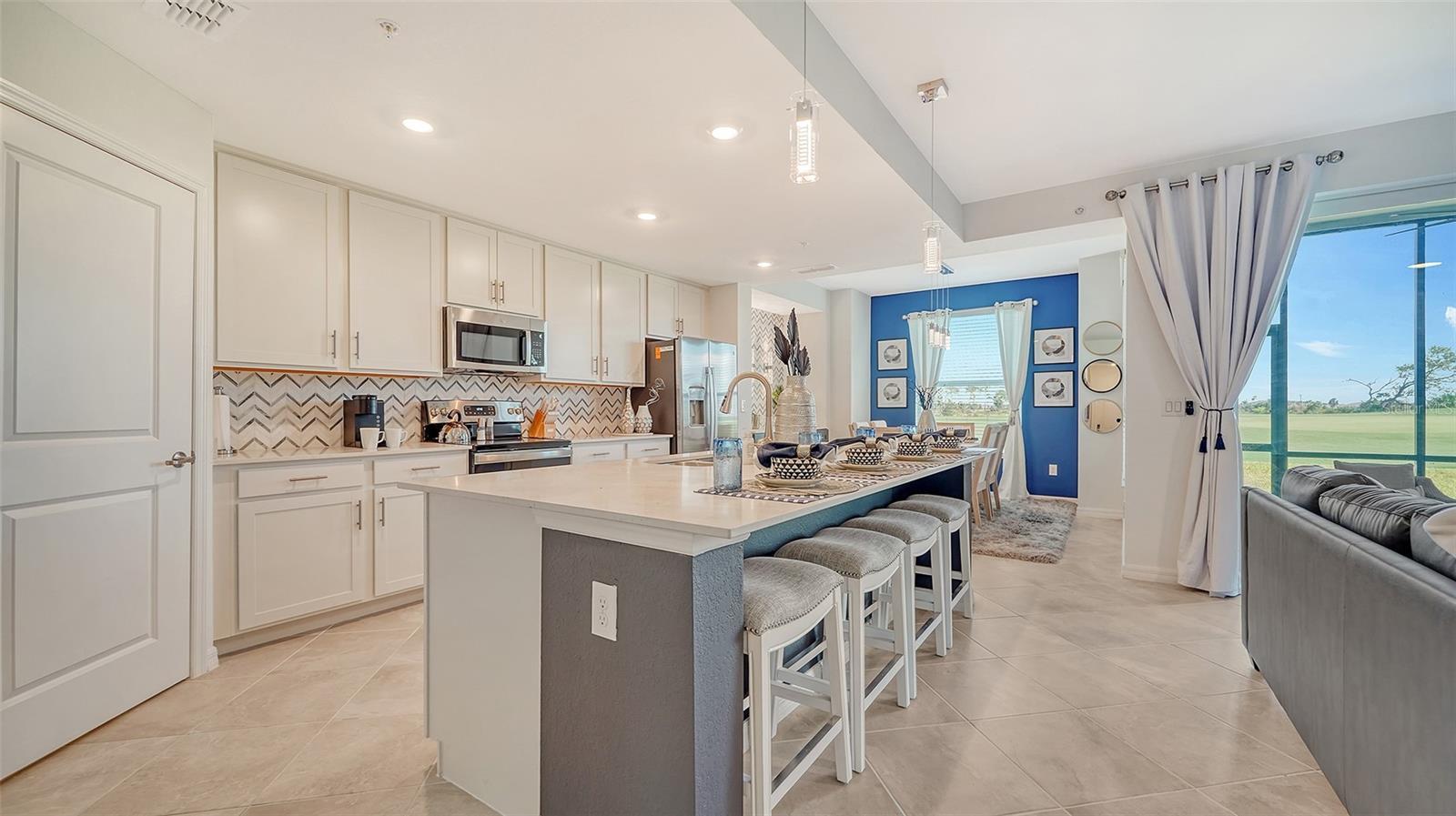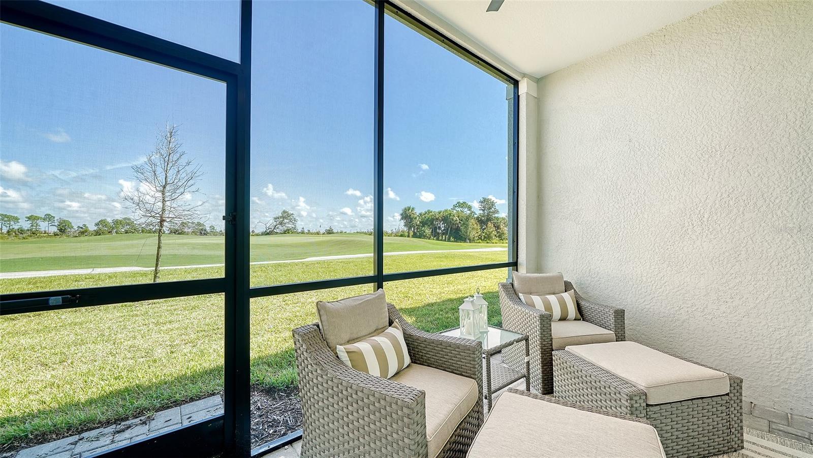 Beautiful brand-new 2- bedroom, 2-bathroom first floor Veranda offers chic coastal furnishings in soothing color palette, upgraded lighting, ceiling fans and kitchen backsplash. Stunning fairway and preserve views greet you as you enter the condo which is located within the sought after gated community of Wellen Park Golf and Country club. This newly decorated, condo features 1,680 square feet of well thought out living space and features a screened in front and rear lanai for enjoying gorgeous sunny days and cross breezes and entertaining guests. Master suite boasts walk in closets, en-suite bath with double sinks and large walk-in shower. Second bedroom and den share a full size second bathroom with bathtub/shower combo, quartz countertops and vanity. Nicely appointed kitchen features large island, quartz counter tops, wood cabinets and stainless-steel appliances with functional pantry that shares space with living and dining areas. Dining room offers upgraded wet bar with wine refrigerator. This clever floor plan features den with pocket doors, offering a multi-functional space for additional guest quarters or office/working space. A detached one car garage is located conveniently in front of the condominium and offers easy access, just steps from the front door of this ground floor unit. All bedrooms have a television as well as the living room and lanai. King bed in master, queen bed in second bedroom and pull- out sofa in the den. Hurricane impact resistant windows and doors are featured. Take your love of the game to the next level on the newest Gordon Lewis championship golf course. Property is being offered with golf membership as well as access to resort style amenities such as main resort style pool, 3 satellite pools, fitness center, tiki bar, pickle ball, tennis courts, bocce ball and a dog park. This community is located in close proximity to downtown Wellen Park, which offers an array of shops, music events, restaurants, lake, walking trails, kayak and paddle board rentals, farmers market, and more. Nearby Gulf beaches, downtown Venice and Atlanta Braves spring training facility. ***HIGH SEASON (DEC-APRIL) RATE~ $6,500.00 PER MONTH*** LOW SEASON (MAY-NOV.) RATE~ 2,500.00*** Immediate occupancy.