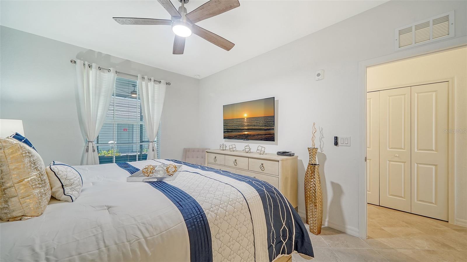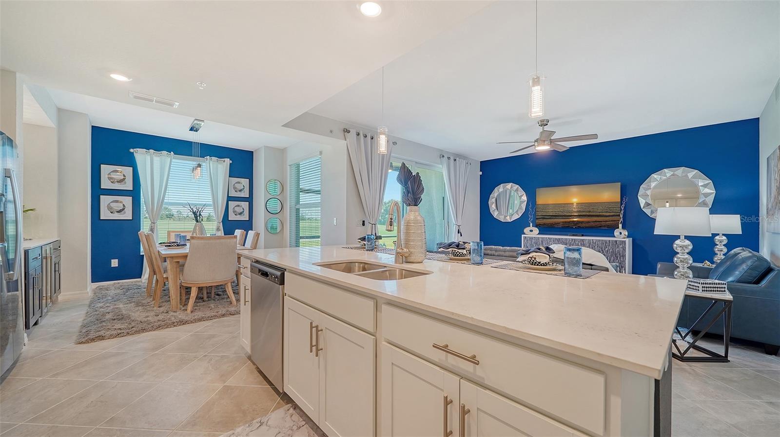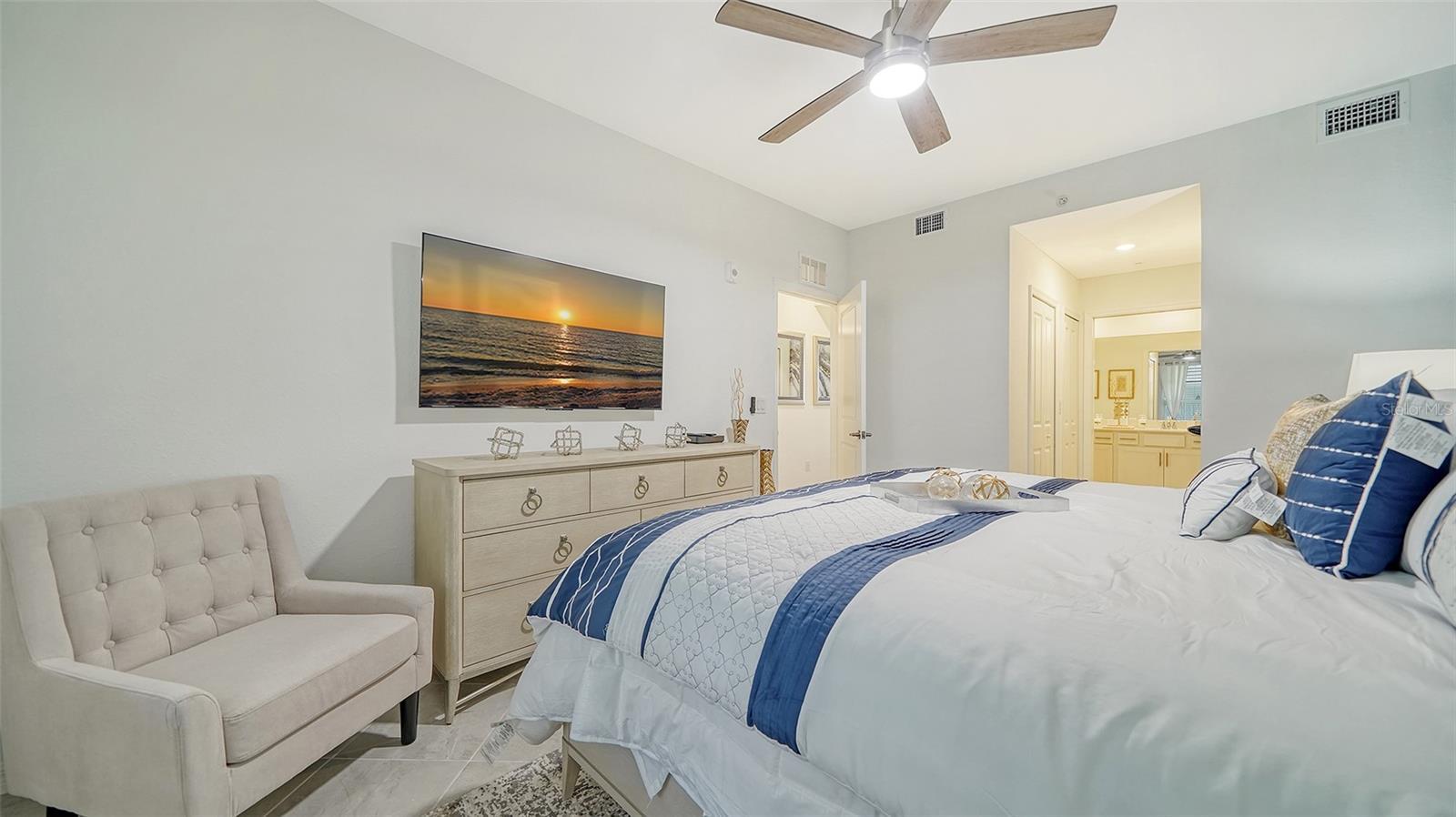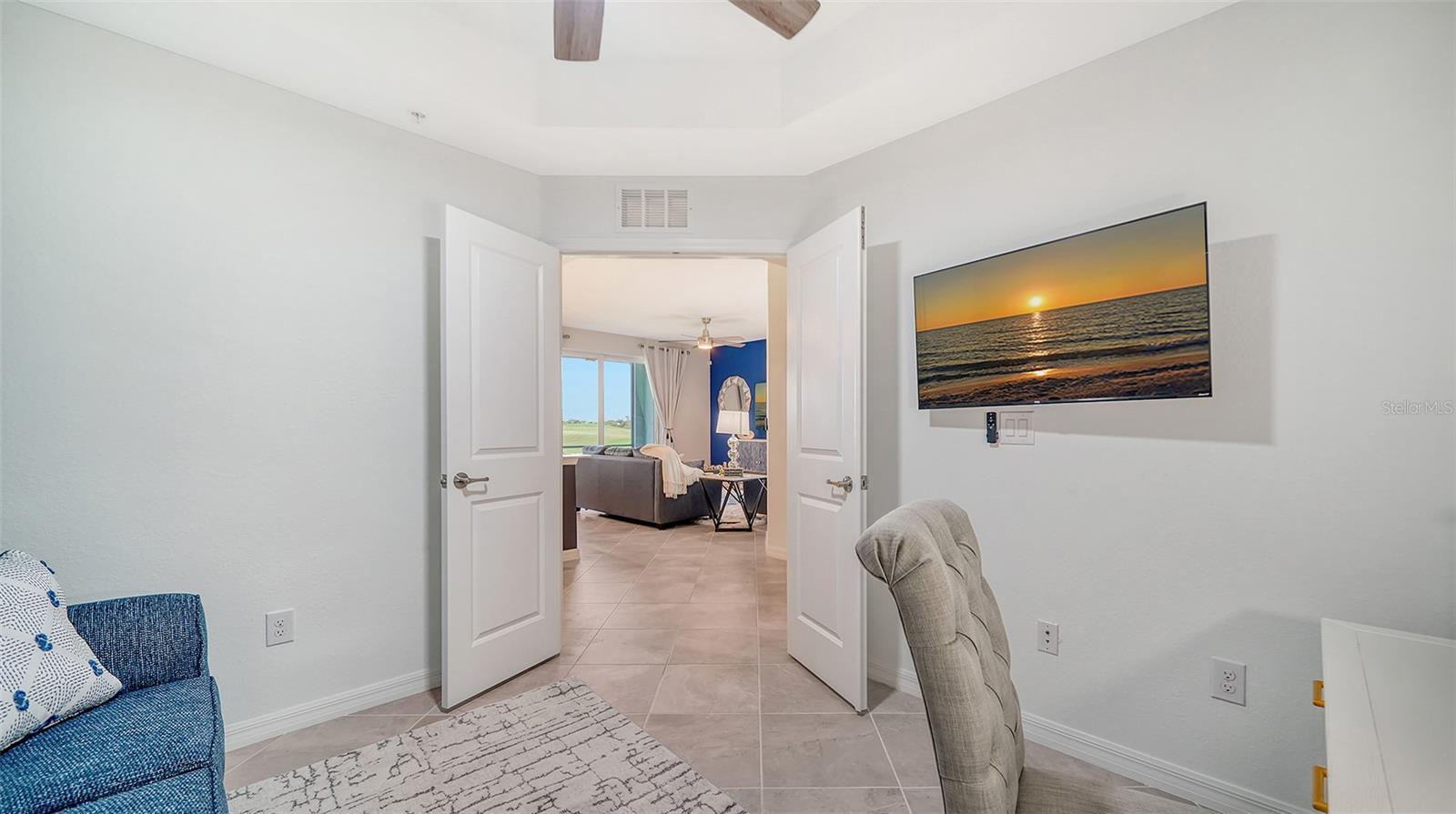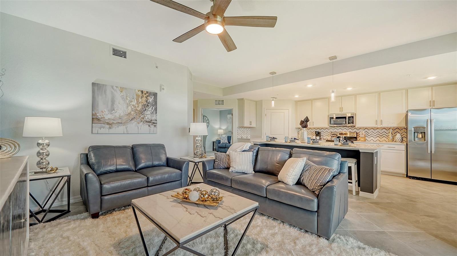 Beautiful brand-new 2- bedroom, 2-bathroom first floor Veranda offers chic coastal furnishings in soothing color palette, upgraded lighting, ceiling fans and kitchen backsplash. Stunning fairway and preserve views greet you as you enter the condo which is located within the sought after gated community of Wellen Park Golf and Country club. This newly decorated, condo features 1,680 square feet of well thought out living space and features a screened in front and rear lanai for enjoying gorgeous sunny days and cross breezes and entertaining guests. Master suite boasts walk in closets, en-suite bath with double sinks and large walk-in shower. Second bedroom and den share a full size second bathroom with bathtub/shower combo, quartz countertops and vanity. Nicely appointed kitchen features large island, quartz counter tops, wood cabinets and stainless-steel appliances with functional pantry that shares space with living and dining areas. Dining room offers upgraded wet bar with wine refrigerator. This clever floor plan features den with pocket doors, offering a multi-functional space for additional guest quarters or office/working space. A detached one car garage is located conveniently in front of the condominium and offers easy access, just steps from the front door of this ground floor unit. All bedrooms have a television as well as the living room and lanai. King bed in master, queen bed in second bedroom and pull- out sofa in the den. Hurricane impact resistant windows and doors are featured. Take your love of the game to the next level on the newest Gordon Lewis championship golf course. Property is being offered with golf membership as well as access to resort style amenities such as main resort style pool, 3 satellite pools, fitness center, tiki bar, pickle ball, tennis courts, bocce ball and a dog park. This community is located in close proximity to downtown Wellen Park, which offers an array of shops, music events, restaurants, lake, walking trails, kayak and paddle board rentals, farmers market, and more. Nearby Gulf beaches, downtown Venice and Atlanta Braves spring training facility. ***HIGH SEASON (DEC-APRIL) RATE~ $6,500.00 PER MONTH*** LOW SEASON (MAY-NOV.) RATE~ 2,500.00*** Immediate occupancy.