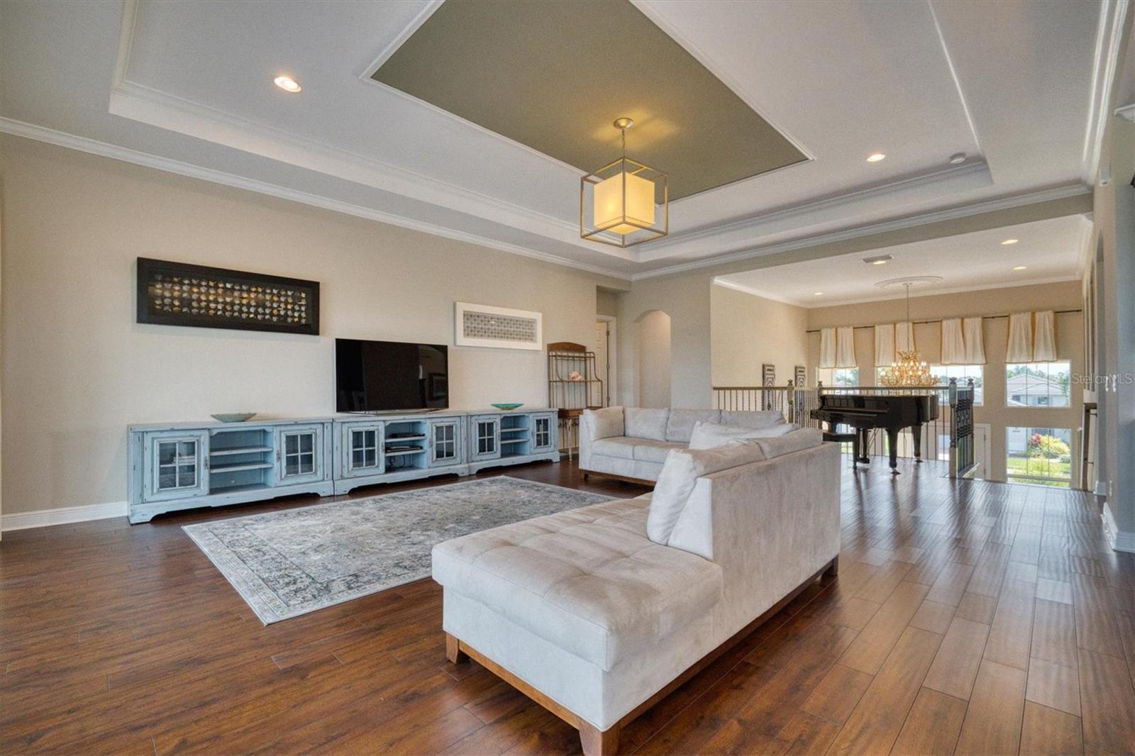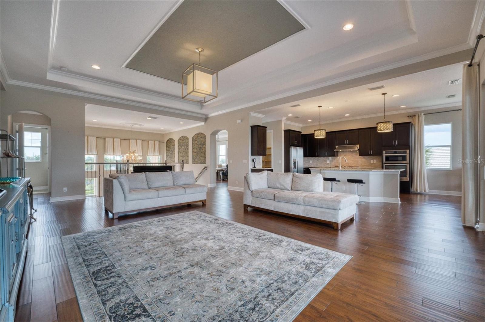 - Built-in Features, Ceiling Fans(s), Crown Molding, High Ceilings, Kitchen/Family Room Combo, Living Room/Dining Room Combo, Open Floorplan, PrimaryBedroom Upstairs, Solid Wood Cabinets, Split Bedroom, Stone Counters, Thermostat, Tray Ceiling(s), Walk-In Closet(s), Window Treatments