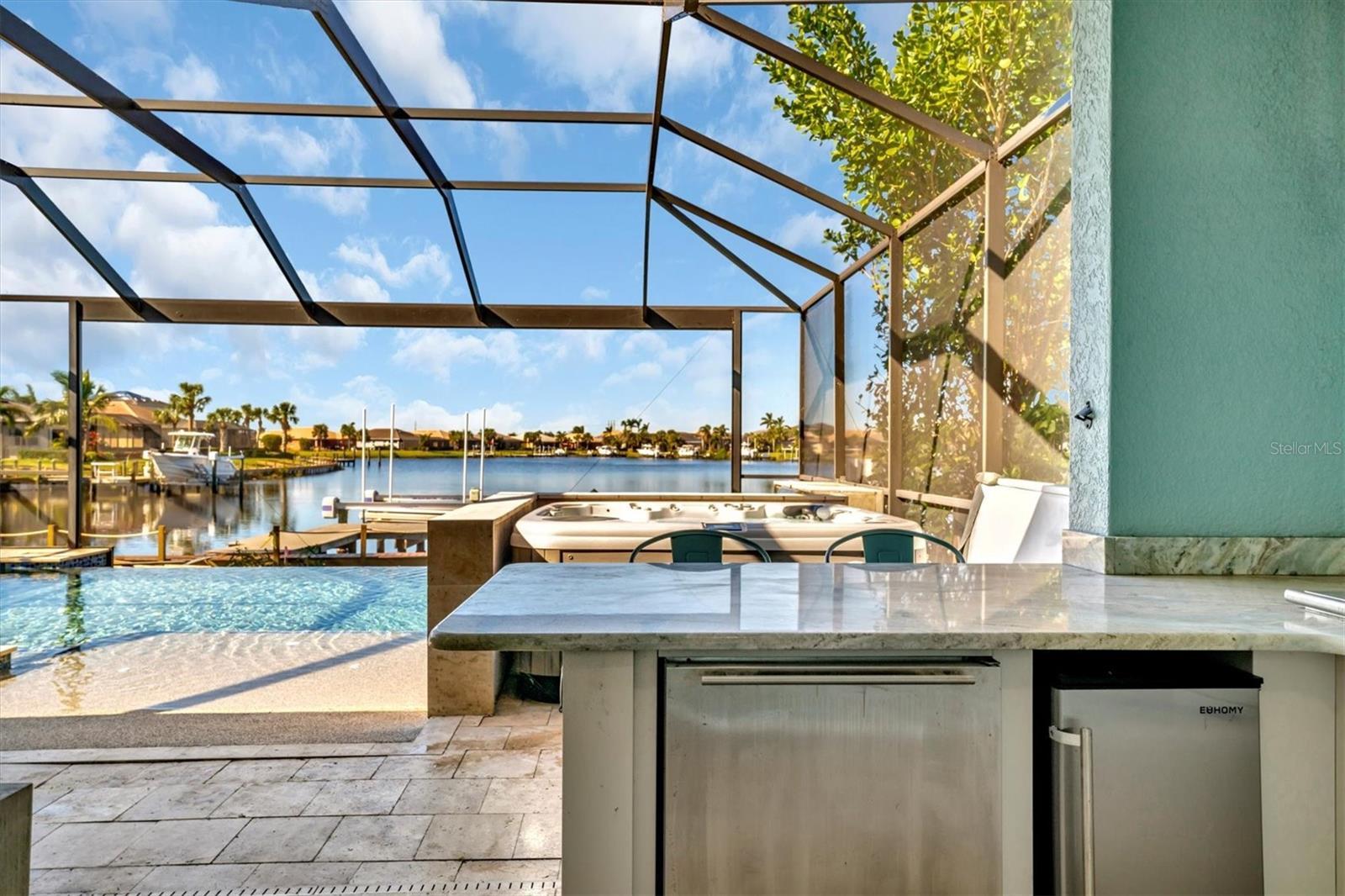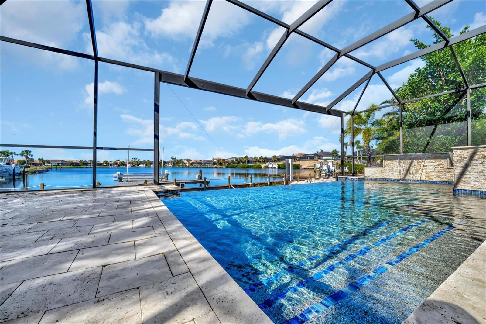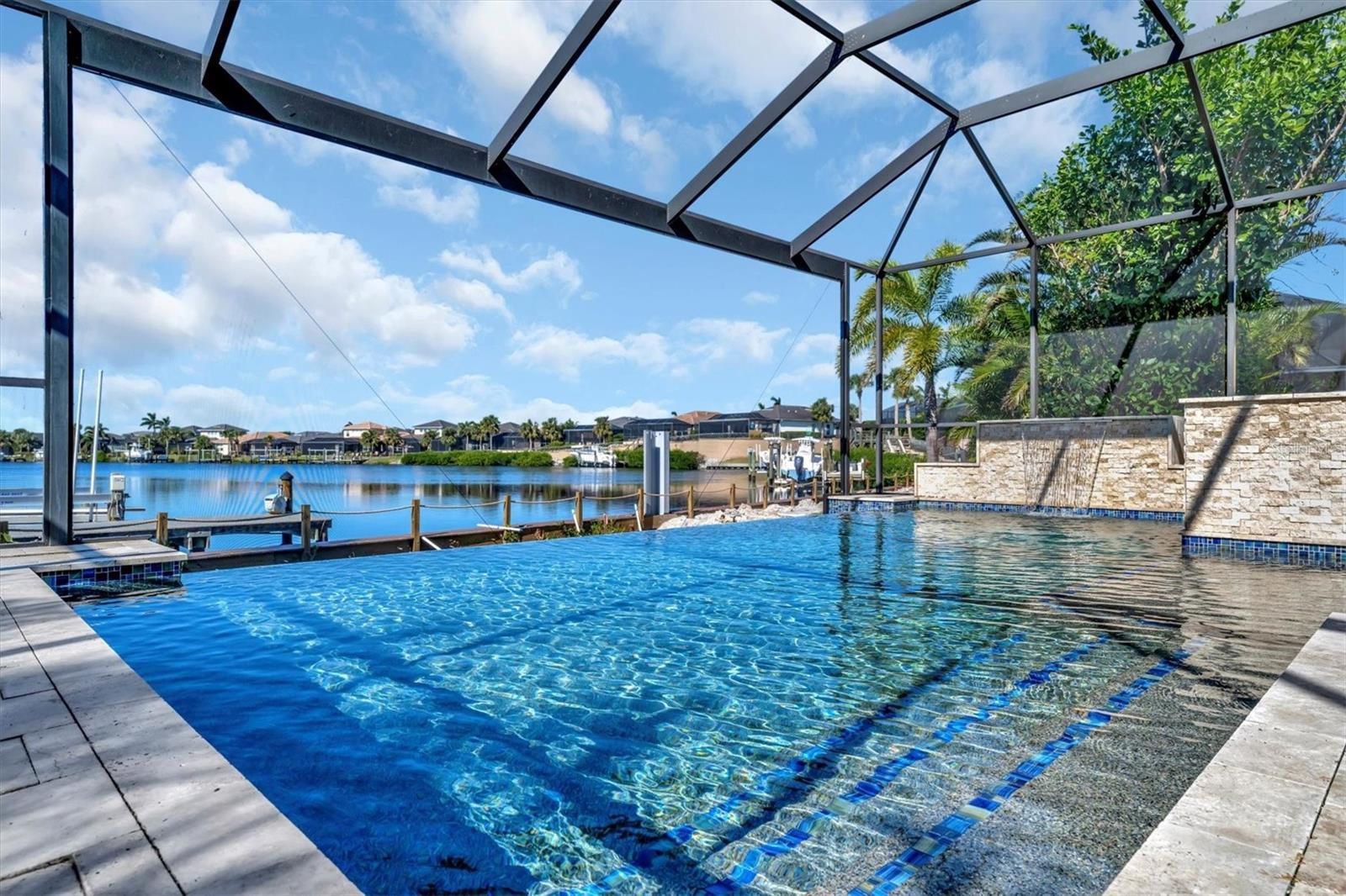 Under contract-accepting backup offers. One or more photo(s) has been virtually staged. Savor captivating water views and breathtaking nightly sunsets from this stunning WCI-built home in Tidewater Preserve. Experience luxury living in Bradenton’s premier boating community along the scenic Manatee River. Step into this stunning open-concept home featuring 4 spacious ensuite bedrooms, a versatile den, and 4.5 baths. Designed for comfort and elegance, the home boasts tile flooring and engineered wood flooring throughout, crown molding, Hunter Douglas blinds, and 9-foot doors. The gourmet kitchen is a chef's dream, equipped with stainless steel appliances, granite countertops, a 5-burner gas stove, wood cabinets with under-cabinet lighting, soft-close drawers, a pantry, and a butler's kitchen/bar pre-wired for a wine fridge. The inviting master suite offers serene views of the pool and lagoon, accented by elegant crown molding. The spa-like master bath features a walk-in shower, a relaxing soaking tub, a double vanity, and a spacious walk-in closet with custom-built shelving and drawers for ultimate organization. Escape to your private oasis, complete with a stunning infinity pool, travertine decking, and a picturesque screened enclosure overlooking a serene lagoon. Relax by the stone waterfall and spa, or take advantage of the dock with a custom lift, equipped with electric and water. This home also features an impressive outdoor gas stone fireplace, perfect for cozy evenings, and a fully-equipped outdoor kitchen. The outdoor kitchen boasts a 36-inch grill, sink, side burner, refrigerator, icemaker with an osmosis water line, and an oversized granite countertop, ideal for entertaining family and friends. The 2nd bedroom features its own private bathroom, while the 3rd bedroom is equipped with a space-saving Murphy bed and an attached bathroom, offering comfort and versatility for guests or family. The upstairs loft, which can serve as a 4th bedroom or bonus room, features its own full-size bath and a spacious walk-in closet, offering comfort and privacy for guests or additional living space. Additional upgrades include custom-made accordion hurricane shutters for the second floor, a remote-controlled hurricane privacy/security screen for the lanai and loft windows, a whole-house water filtration and reverse osmosis system, and a state-of-the-art Vitex alarm system for enhanced safety and convenience. The 2-car garage, complemented by a widened driveway, features built-in storage, and a recently installed transfer switch ready for a generator, adding both functionality and convenience Tidewater Preserve has NO CDD, it's own full time event coordinator and lots of amenities features 2 clubhouses, Gym, 3 community pool, tennis courts, marina, dog park, walking trail & a kayak launch. Very convenient to I-75, beaches, shopping, restaurants, & airports.