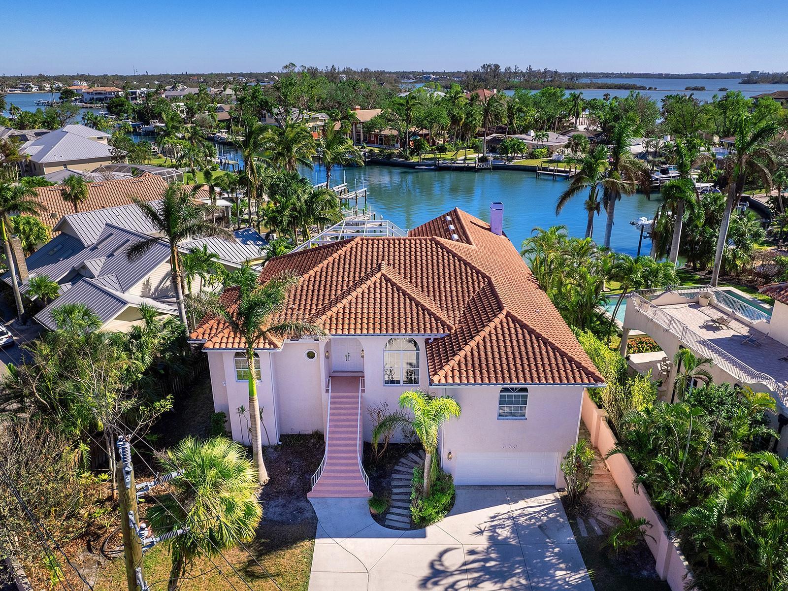 One or more photo(s) has been virtually staged. Experience the ultimate in coastal living with this two-story residence in the highly desirable Bay Island Shores on the world-renowned Siesta Key. Located in a prime waterfront setting, this all-concrete block home boasts a new tile roof in 2016 and offers unparalleled access to deep water and sailboat-friendly waters, making it the perfect haven for boating enthusiasts. The property, set on over a .35-acre lot, is nestled in a protected basin and features a newer dock with composite decking, complete with two boat lifts (12,000 and 4,500 pounds), installed in 2018—truly a boater’s paradise.The home’s elevated design places all living spaces on the second floor, ensuring captivating water views and privacy. A secure, walled gated entrance leads to a spacious garage area of nearly 3,000 square feet, offering abundant storage for vehicles, watercraft, outdoor equipment, just off the pool and spa. With room for multiple cars, golf carts, motorcycles, and kayaks, this area can also be transformed into a game room, home theater, fitness space, or sauna—catering to a variety of lifestyles and interests.Perfectly suited for both relaxation and entertaining, the home features high ceilings, crown molding, an elevator, and expansive living areas that flow effortlessly into the outdoors. A wraparound balcony, accessible from nearly every room, allows you to enjoy the island breeze and scenic surroundings, while multiple indoor and outdoor spaces provide plenty of room to host family and friends.Located on the desirable north end of Siesta Key, this property is just moments from the renowned Siesta Key Beach and the vibrant downtown Sarasota area. Additionally, being within the city of Sarasota, the property offers the flexibility of weekly rentals, making it an excellent investment opportunity. This exceptional home combines the best of island living with modern amenities—your coastal dream awaits.