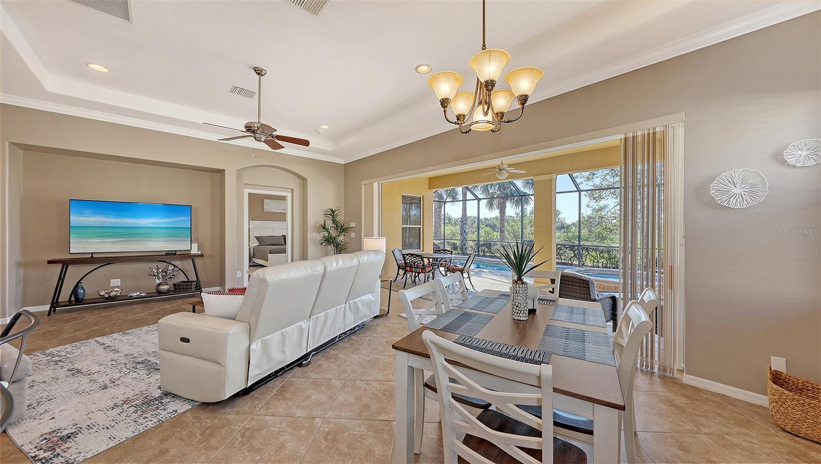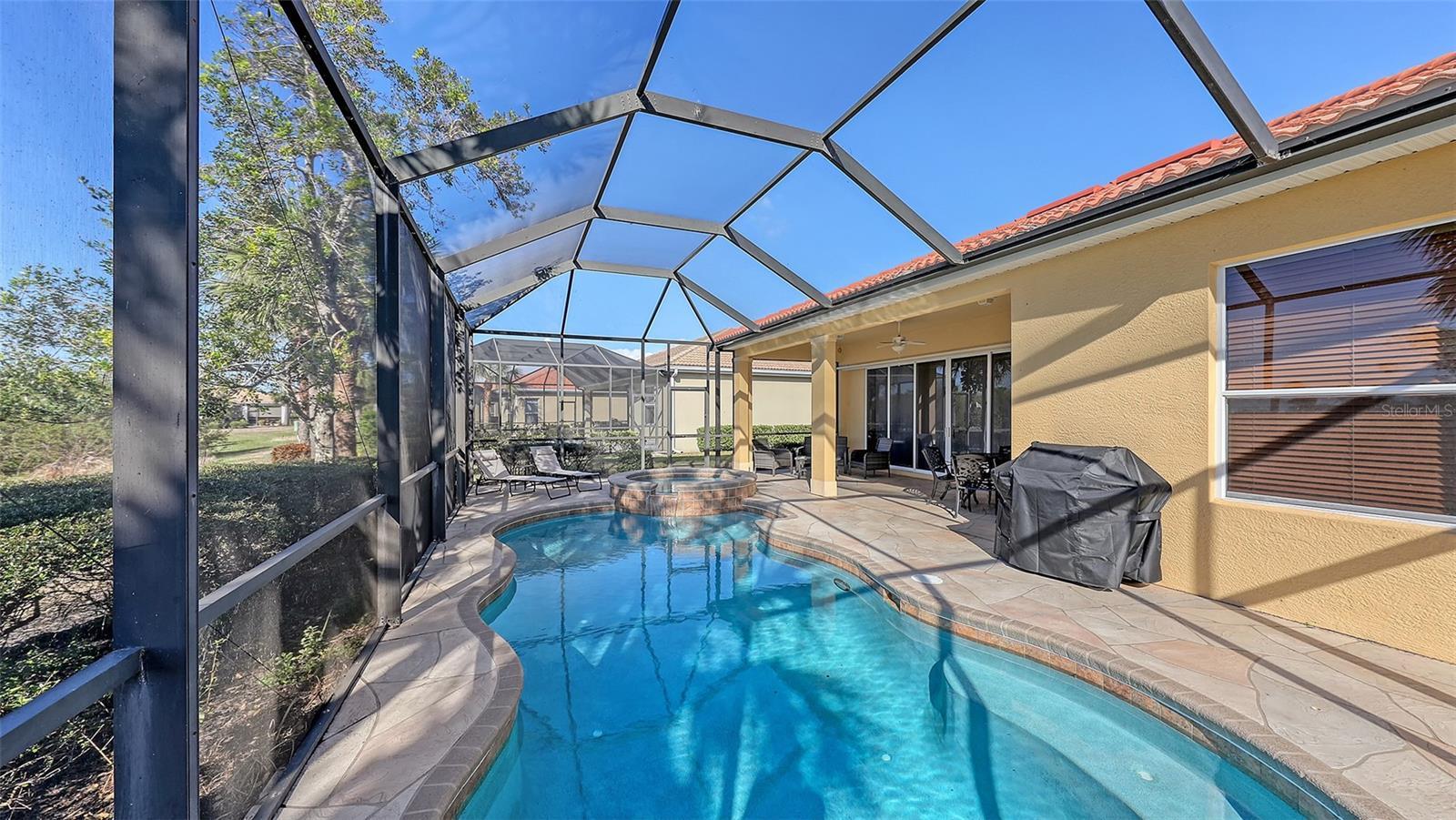 VENETIAN GOLF AND RIVER CLUB..Postcard views! This single family home boasts 3 bedrooms, 2 bathrooms with indoor/outdoor living. Enjoy stunning views of the Sunset, Water and Golf views as you unwind in your own screened in patio with a private pool and hot tub after a round of golf at The Venetian Golf and River Club. The ensuite primary bedroom, conveniently located on the main-floor, (King size bed) it is expansive and luxurious with a separate sitting area. In addition to the convenience of the private bathroom (walk-in shower), you will find ample closet space to let your wardrobe breathe. After any local excursions, you can return to the comforting appeal of your perfect home, in the place where the low-traffic streets are lined by sidewalks. Indulge in an abundance of world-class amenities for residents of this community, including a fitness center, tennis courts, pickelball courts, tiki bar, 24/7 security, and fine dining. Take a refreshing dip in the resort-sized pool/spa, lap pool, or delight in the 70-acre nature preserve and the boardwalk leading to the Myakka River. If golf is your passion, you will have plenty of time to take the opportunity to join a championship 18-hole golf course all set in an unbeatable location just minutes from pristine beaches and downtown Venice Island shopping. Call Today!!