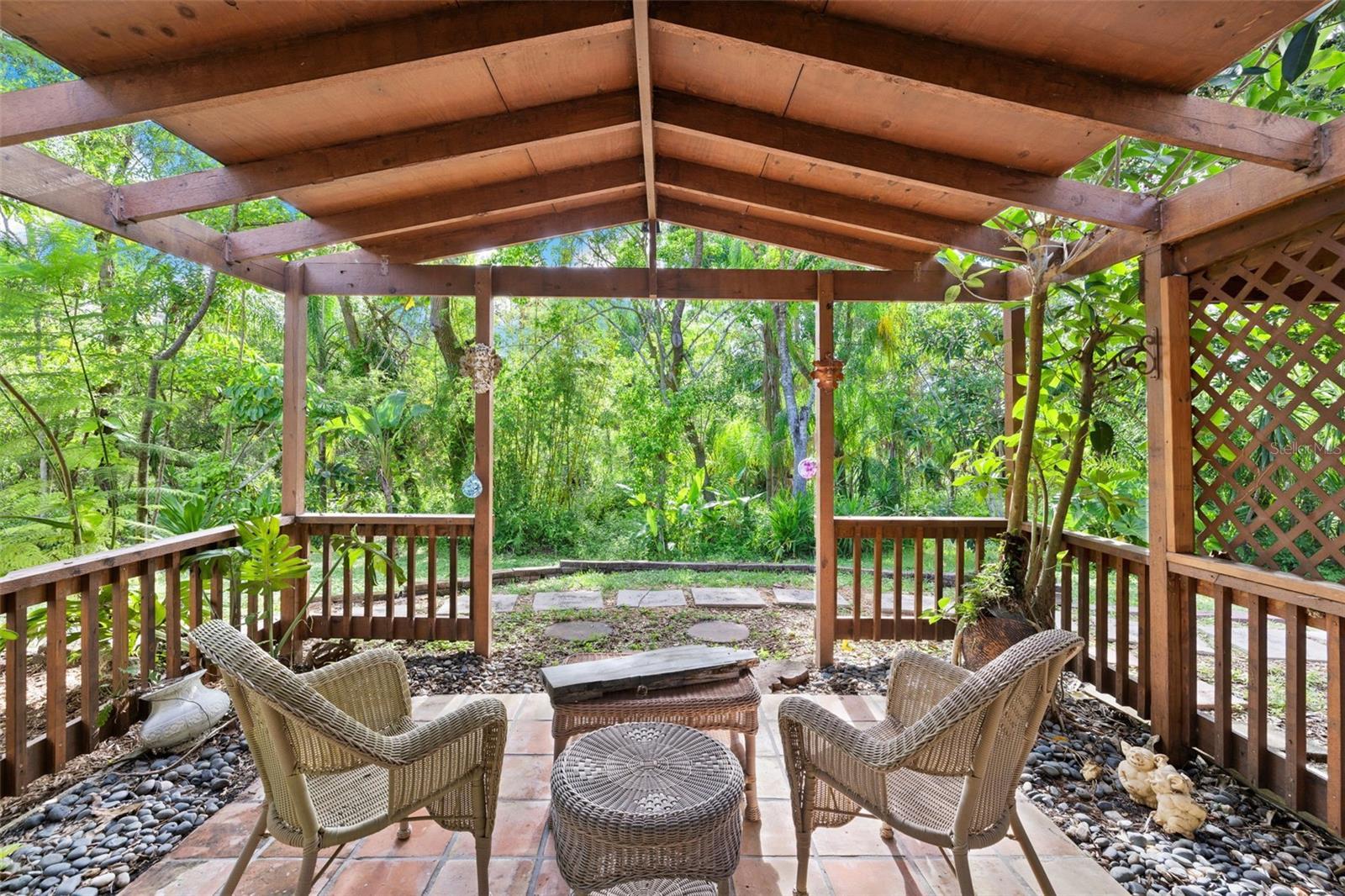 RARELY AVAILABLE. EXPANSIVE LOT. CONVENIENT LOCATION. PRIVATE AND SECURE. This hard-to-find lot creates a prime opportunity to tailor this custom-built Arthur Rutenberg residence into the perfect home for you and your family for years to come. Welcome to the exclusive community of Pine Valley Ranches, where the convenience of location and privacy meet natural beauty on this stunning 5.5-acre estate. If you love the serenity of Selby Botanical Gardens, this property will captivate you. Nestled among 414 mature oak trees, 174 palm trees, and an array of exotic foliage, the grounds feel like a private botanical oasis. Lush landscaping and thoughtfully designed built-in walking trails weave throughout the property, creating a peaceful, garden-like experience. A double-gated entrance and winding paver driveway lead you through dappled sunlight beneath a majestic tree canopy, setting the tone for the serene lifestyle. With no neighbors in sight, privacy is absolute, and one can feel secure on this property. This custom-built residence spans approximately 7,000 total square feet with a brand new roof and features 4 bedrooms, plus a den/office, and a remarkable three-story, Class 5 hurricane-rated safe structure—complete with a rooftop deck. Step inside through grand double doors into a spacious foyer that opens to a formal living area filled with natural light, 12-foot ceilings, and a skylight. A custom wet bar with a green onyx countertop and copper sink adds a touch of sophistication. Expansive double sliders open to a screened outdoor living area with an oversized pool area for grilling and an oversized patio ideal for entertaining. The triple-split floor plan offers spaciousness and functionality, enhanced by aquarium-style transom windows and octagon architectural accents. The expansive primary suite boasts two double sliders with direct access to the pool and outdoor lounge area. At the heart of the home, the recently renovated kitchen offers style and substance with custom wood ceiling insets, Samsung appliances, custom wood cabinetry, granite countertops, an extra-large pantry, and a large center island with comfortable seating. It flows seamlessly into a cozy family room with built-in shelving, an oversized marble fireplace, and a handcrafted wood mantle. Designed with versatility in mind, it serves beautifully as a guest suite, art studio, man cave, or entertainment space. Constructed with double steel-reinforced concrete, fireproof and hurricane-rated windows, handcrafted walnut doors, this structure features floating maple floors, skip-trowel plaster walls and ceiling, custom lighting, and hand-painted cedar crown molding. A spiral staircase connects to a second-floor studio or workshop, while the third level offers a rooftop deck with artificial turf—perfect for sunbathing, sunset watching, or a rooftop bar escape. Outdoors, immerse yourself in the peaceful surroundings. Meandering trails invite you through your private woods to explore the natural beauty of the property, which also features a koi pond and a detached concrete 400 sq ft garage—ideal for housing custom cars, tracker, golf carts, kayaks, paddleboards, and more. This unique estate is a nature lover’s dream, blending luxury living with the peace and serenity of a private botanical paradise. With its exceptional privacy and ample acreage, the property offers the opportunity to add a second residence (3rd structure). Horses and farm animals allowed!