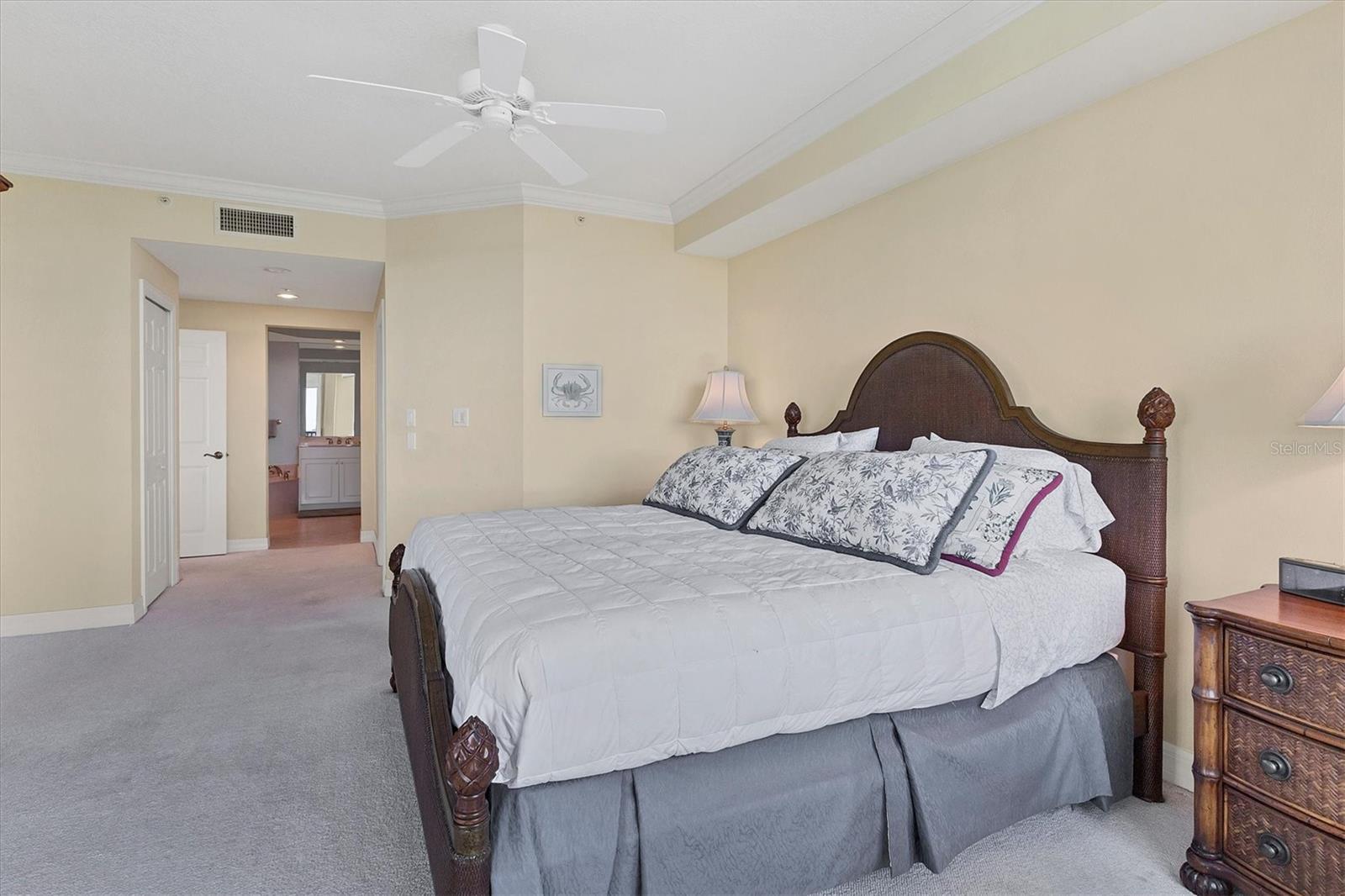 - Crown Molding, High Ceilings, Kitchen/Family Room Combo, Open Floorplan, Primary Bedroom Main Floor, Solid Surface Counters, Solid Wood Cabinets, Split Bedroom, Stone Counters, Walk-In Closet(s), Window Treatments