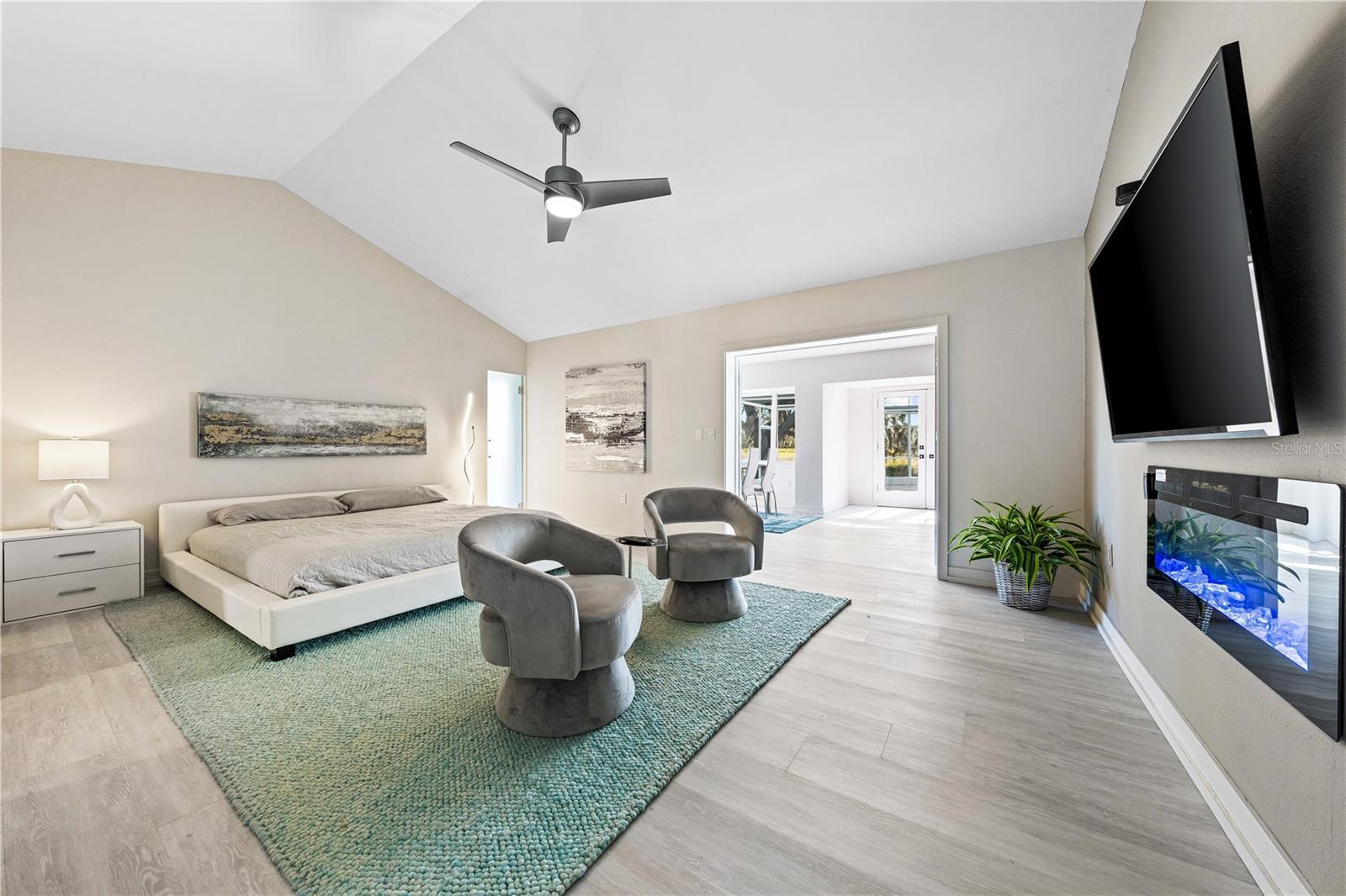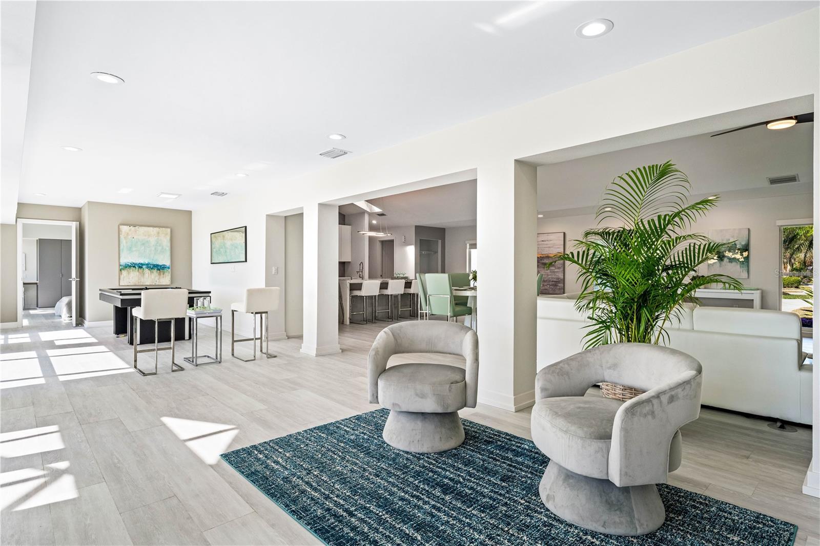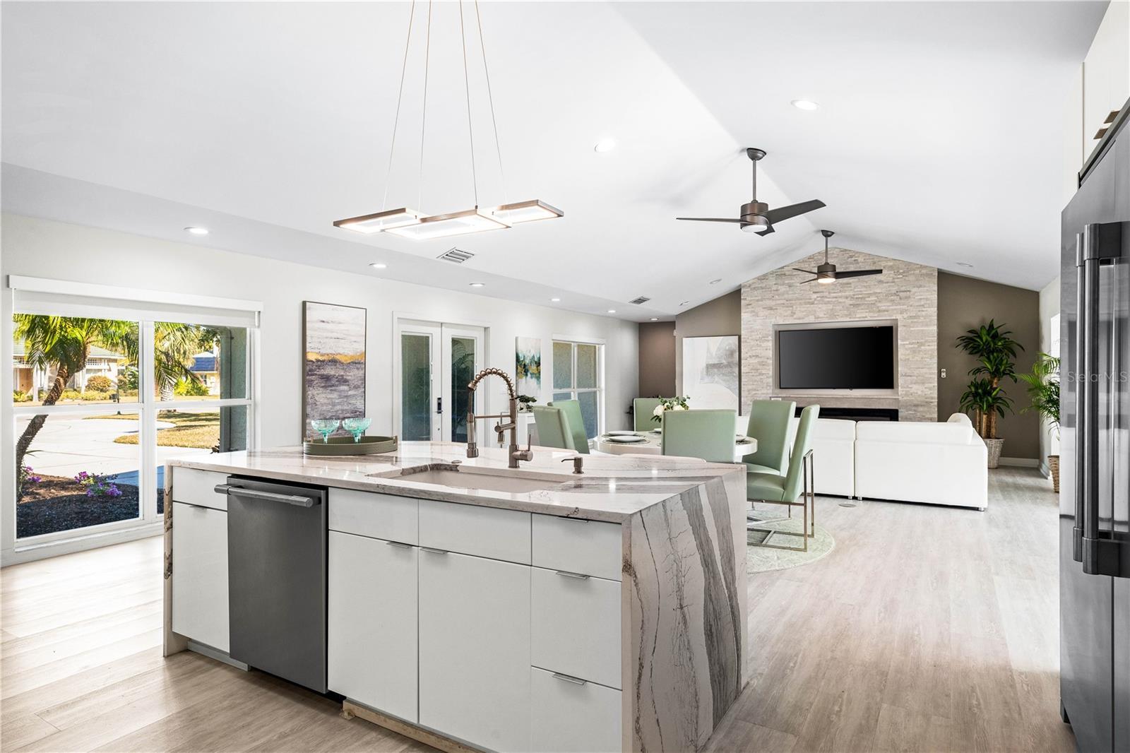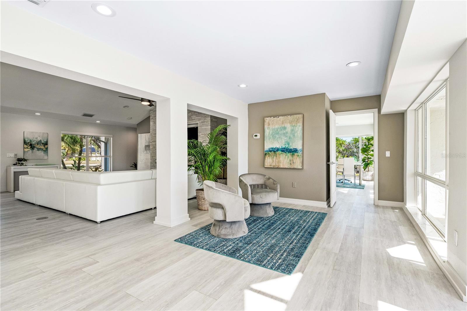 Seller Motivated! Exquisitely remodeled 4/3.5 contemporary on a spacious golf course lot in the popular Club at River Wilderness. A totally open floor plan featuring extensive windows and a cathedral ceiling create a bright, airy feeling, highlighting the stunningly luxurious, designer finishes throughout. The huge 800sf great room-dining-kitchen area features a floor to ceiling quartzite stone fireplace on one end, with electric fireplace and 72” tv niche, and a chef’s dream kitchen on the opposite end, making this the perfect home for entertaining. The incredible kitchen features glossy white European style cabinetry with premium Cambria counter tops and an impressive waterfalled center island with a composite sink, extremely quiet SS dishwasher and seating for four. Top of the line Frigidaire Professional SS appliances include a 66" twin column frig and freezer, built-in dual wall ovens with a convection microwave, a 36” natural gas cooktop with SS chimney vent. Beyond the great room is a more intimate seating area overlooking the serene golf course and a game room leading out to the expansive, screened in lanai. The spacious master suite boasts a cathedral ceiling, ample room for a king size bed that overlooks an intimate seating area with a built-in electric fireplace to warm cooler evenings after relaxing in the opulent master bath’s whirlpool jet tub. Bathroom also features a large, walk-in glass lined porcelain shower, his and hers vanities with lighted & fog proof mirrors and a separate toilet room. An immense walk-in closet will surprise you with its spacious “California” closet design, it’s convenient second laundry room featuring Bosch under counter washer and dryer, storage cabinets, sink and quartz counter perfect for your morning coffee or expresso machine! Completing the owner’s wing is a large office area with tons of naturel light and a beautiful view overlooking the golf course. The "other wing" of this magnificent home features 3 spacious bedrooms with built-in desks, plenty of closet space and 2 baths en-suite both completely updated with lighted mirrors, porcelain tile and wall hung vanities. The spacious main laundry room in located off the kitchen and leads to a unique 220sf multi-functional workshop/craft room/golf cart room with laundry tub and slatted walls for convenient storage and direct access to the 2.5 car attached garage. Additional upgrades include a new roof and air conditioning systems, all new landscaping, quartzite brick enhanced facias for curb appeal, a circular drive for plenty of guest parking, all new hardware, lighting and plumbing fixtures, freshly painted walls and ceilings and new luxury vinyl plank for porcelain tile floors throughout. You will love the privacy and serenity from your screened in patio with pond/golf course view and room for a pool or hot tub. This community has many amenities including a 18 hole championship golf course, clubhouse with dining, Olympic sized pool, fully equipped fitness center, lighted har-tru tennis courts and pickle ball as well as community ramp with boating access to the Manatee River! The club has many optional memberships for golf, tennis, and social. This incredible community is conveniently located to shopping, restaurants and schools. Call me today for a private tour while this masterpiece is still available.