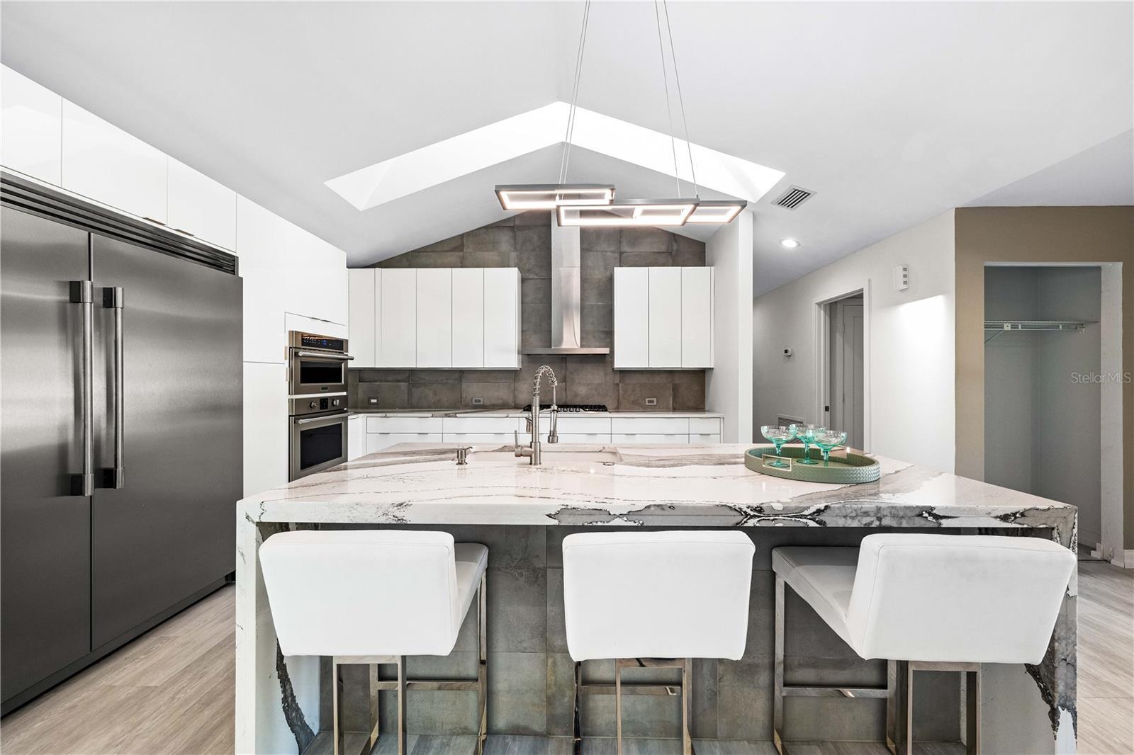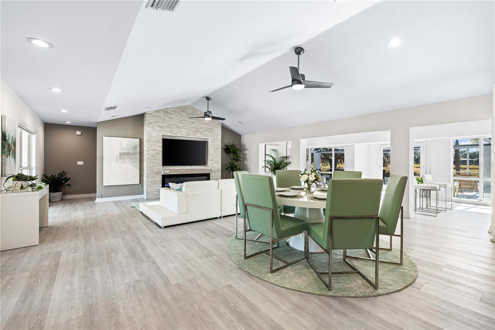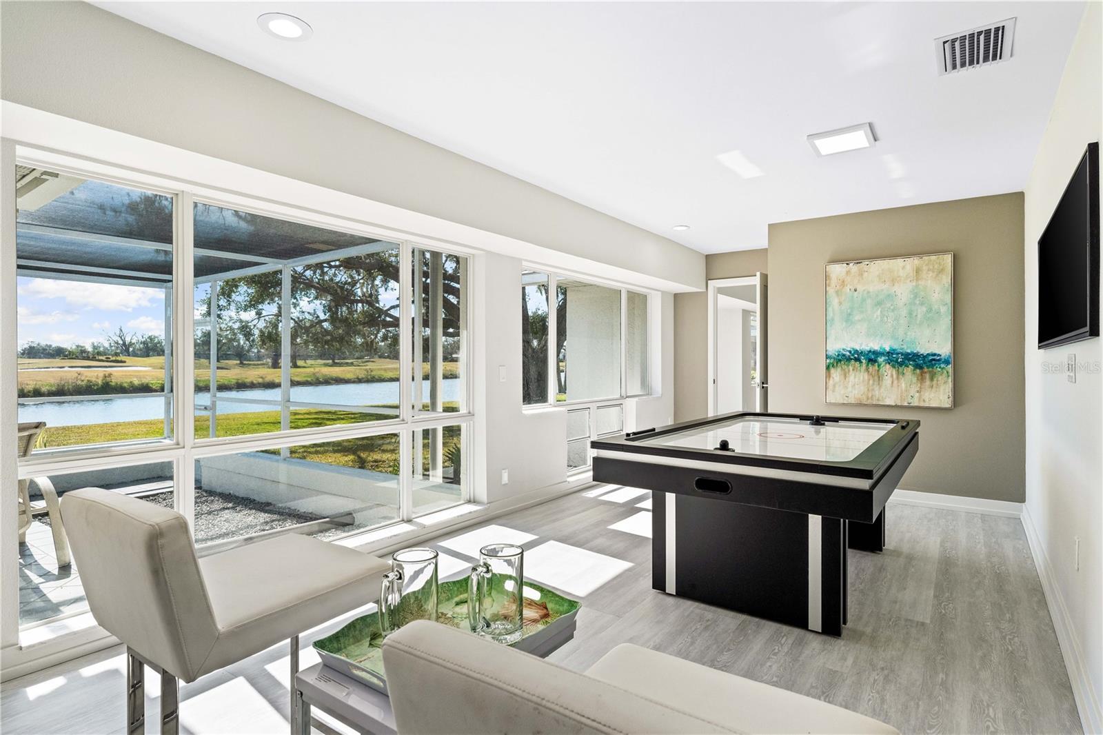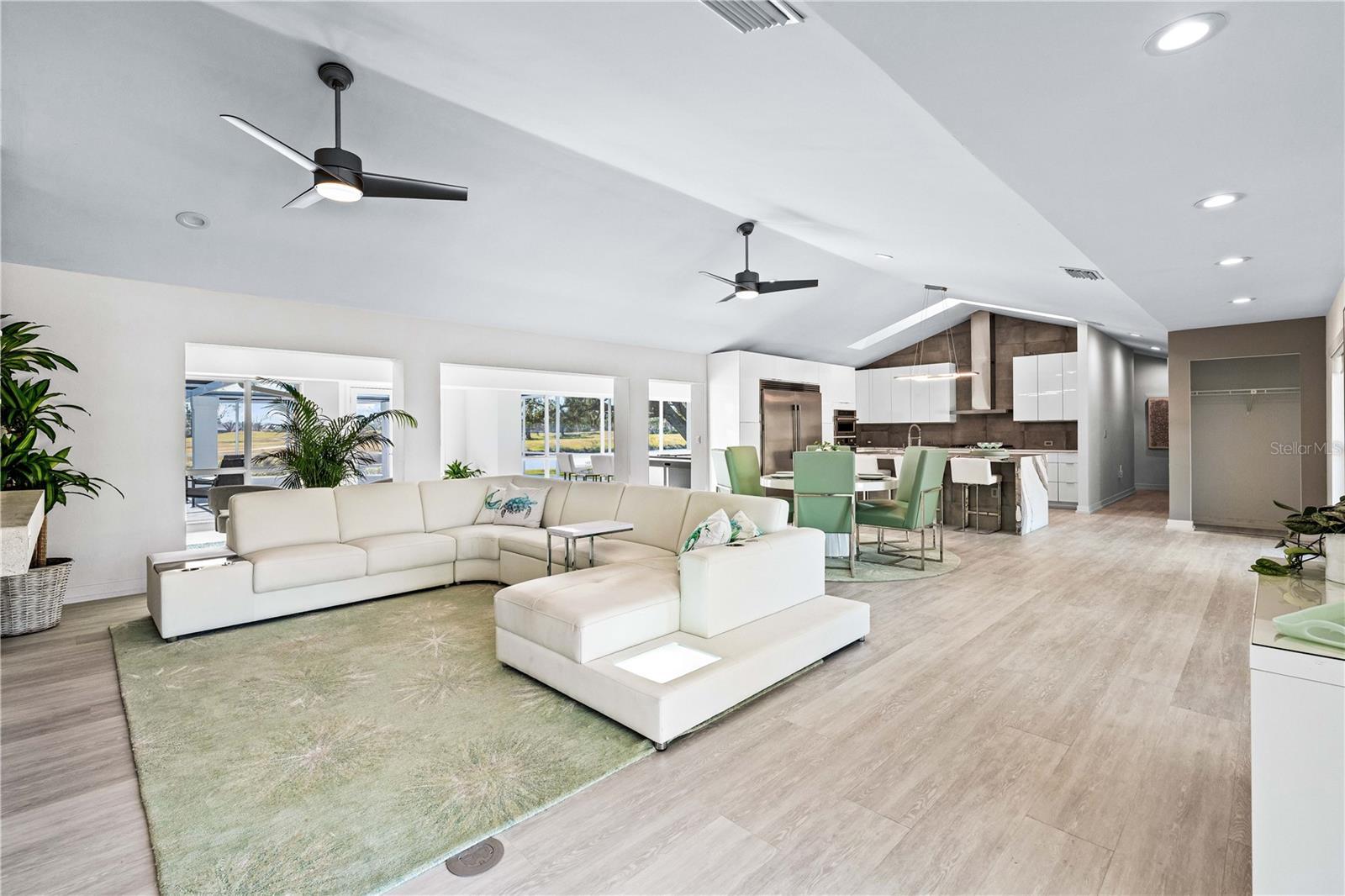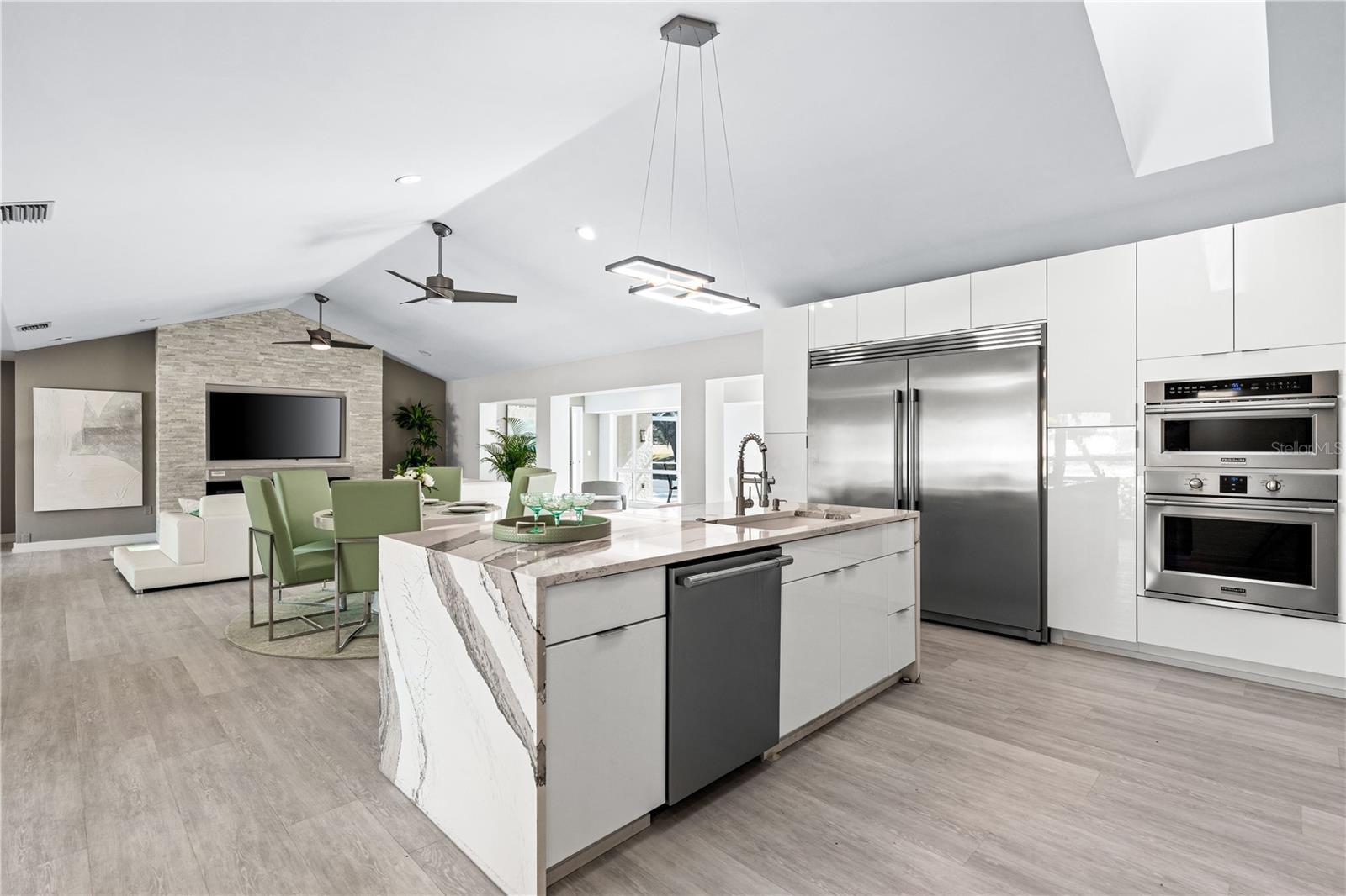 Seller Motivated! Exquisitely remodeled 4/3.5 contemporary on a spacious golf course lot in the popular Club at River Wilderness. A totally open floor plan featuring extensive windows and a cathedral ceiling create a bright, airy feeling, highlighting the stunningly luxurious, designer finishes throughout. The huge 800sf great room-dining-kitchen area features a floor to ceiling quartzite stone fireplace on one end, with electric fireplace and 72” tv niche, and a chef’s dream kitchen on the opposite end, making this the perfect home for entertaining. The incredible kitchen features glossy white European style cabinetry with premium Cambria counter tops and an impressive waterfalled center island with a composite sink, extremely quiet SS dishwasher and seating for four. Top of the line Frigidaire Professional SS appliances include a 66" twin column frig and freezer, built-in dual wall ovens with a convection microwave, a 36” natural gas cooktop with SS chimney vent. Beyond the great room is a more intimate seating area overlooking the serene golf course and a game room leading out to the expansive, screened in lanai. The spacious master suite boasts a cathedral ceiling, ample room for a king size bed that overlooks an intimate seating area with a built-in electric fireplace to warm cooler evenings after relaxing in the opulent master bath’s whirlpool jet tub. Bathroom also features a large, walk-in glass lined porcelain shower, his and hers vanities with lighted & fog proof mirrors and a separate toilet room. An immense walk-in closet will surprise you with its spacious “California” closet design, it’s convenient second laundry room featuring Bosch under counter washer and dryer, storage cabinets, sink and quartz counter perfect for your morning coffee or expresso machine! Completing the owner’s wing is a large office area with tons of naturel light and a beautiful view overlooking the golf course. The "other wing" of this magnificent home features 3 spacious bedrooms with built-in desks, plenty of closet space and 2 baths en-suite both completely updated with lighted mirrors, porcelain tile and wall hung vanities. The spacious main laundry room in located off the kitchen and leads to a unique 220sf multi-functional workshop/craft room/golf cart room with laundry tub and slatted walls for convenient storage and direct access to the 2.5 car attached garage. Additional upgrades include a new roof and air conditioning systems, all new landscaping, quartzite brick enhanced facias for curb appeal, a circular drive for plenty of guest parking, all new hardware, lighting and plumbing fixtures, freshly painted walls and ceilings and new luxury vinyl plank for porcelain tile floors throughout. You will love the privacy and serenity from your screened in patio with pond/golf course view and room for a pool or hot tub. This community has many amenities including a 18 hole championship golf course, clubhouse with dining, Olympic sized pool, fully equipped fitness center, lighted har-tru tennis courts and pickle ball as well as community ramp with boating access to the Manatee River! The club has many optional memberships for golf, tennis, and social. This incredible community is conveniently located to shopping, restaurants and schools. Call me today for a private tour while this masterpiece is still available.