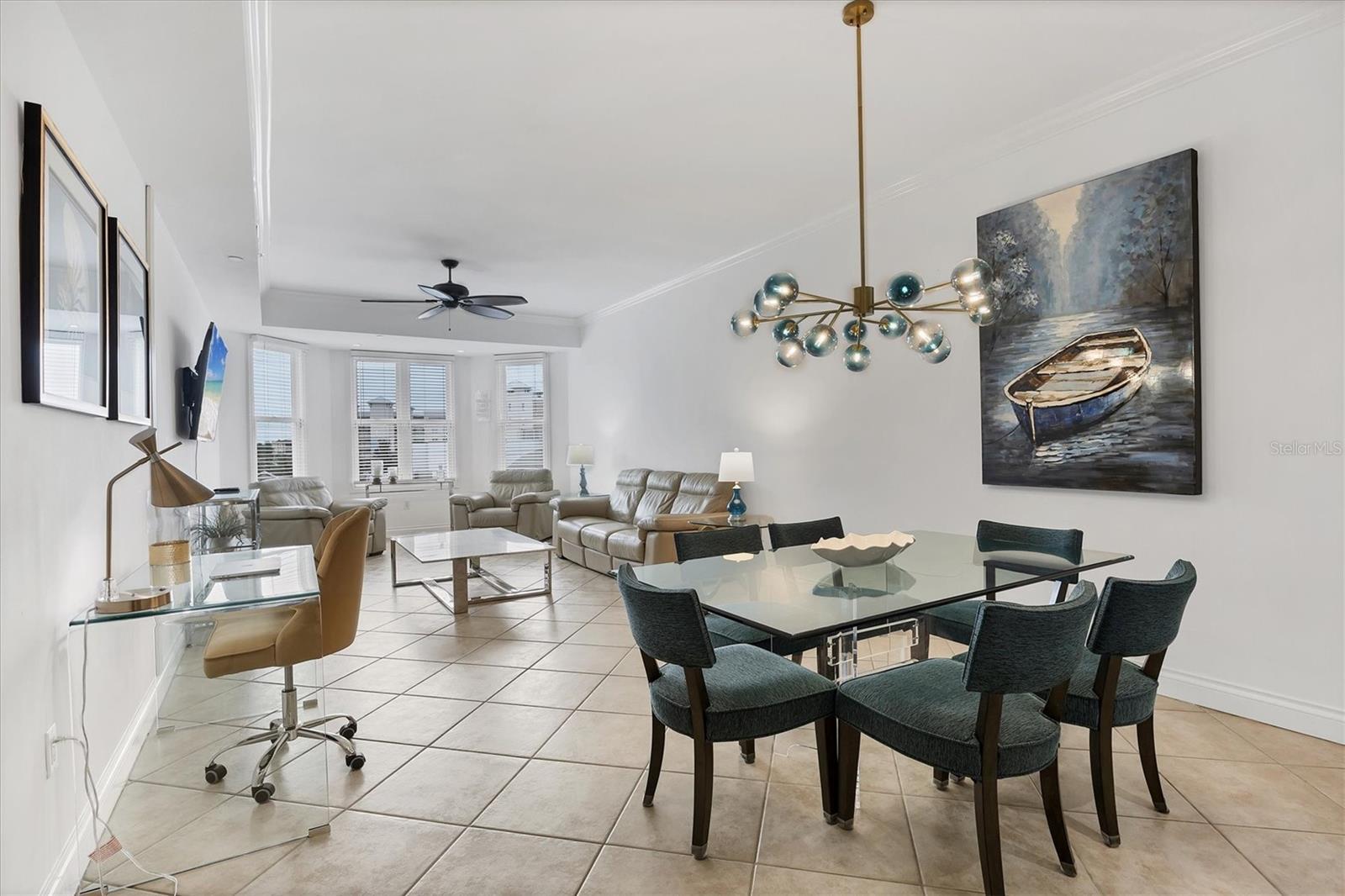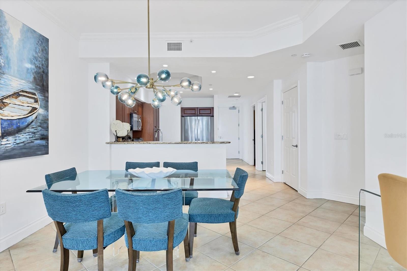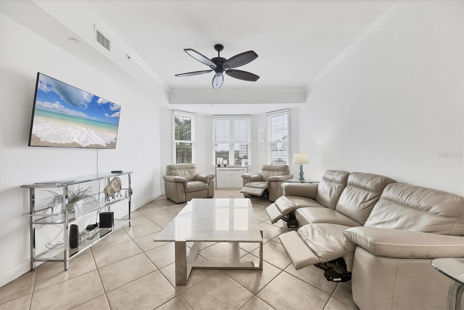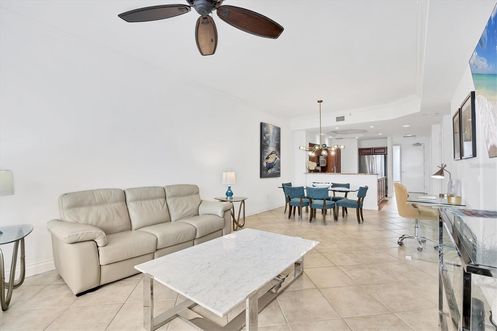 TURN KEY, ALL INCLUDED! One Month Minimum! Enjoy an elegant experience in this centrally located place. From your unit’s windows, you can take in views of downtown Lakewood Ranch, fountains, a movie theater, mini-golf, shops, and restaurants. This recently renovated condo is bright and spacious. The living room features brand-new Italian leather furniture—both the sofa and chair are reclining and incredibly comfortable. Additionally, there is a large granite coffee table and modern side tables. A 75-inch TV is mounted in the living area for your entertainment. The modern glass dining table comfortably seats six, making it perfect for gatherings. The primary bedroom boasts a king-size bed, a large dresser, and a TV. The guest bedroom features a Scandinavian-style bedroom set with a queen-size bed and a TV as well. The kitchen is fully equipped, so you can even prepare a Thanksgiving dinner with ease! For your convenience, the unit includes an in-unit laundry. An elevator provides easy access to the assigned parking space. Immerse yourself in an elegant and convenient experience at this exceptional property!