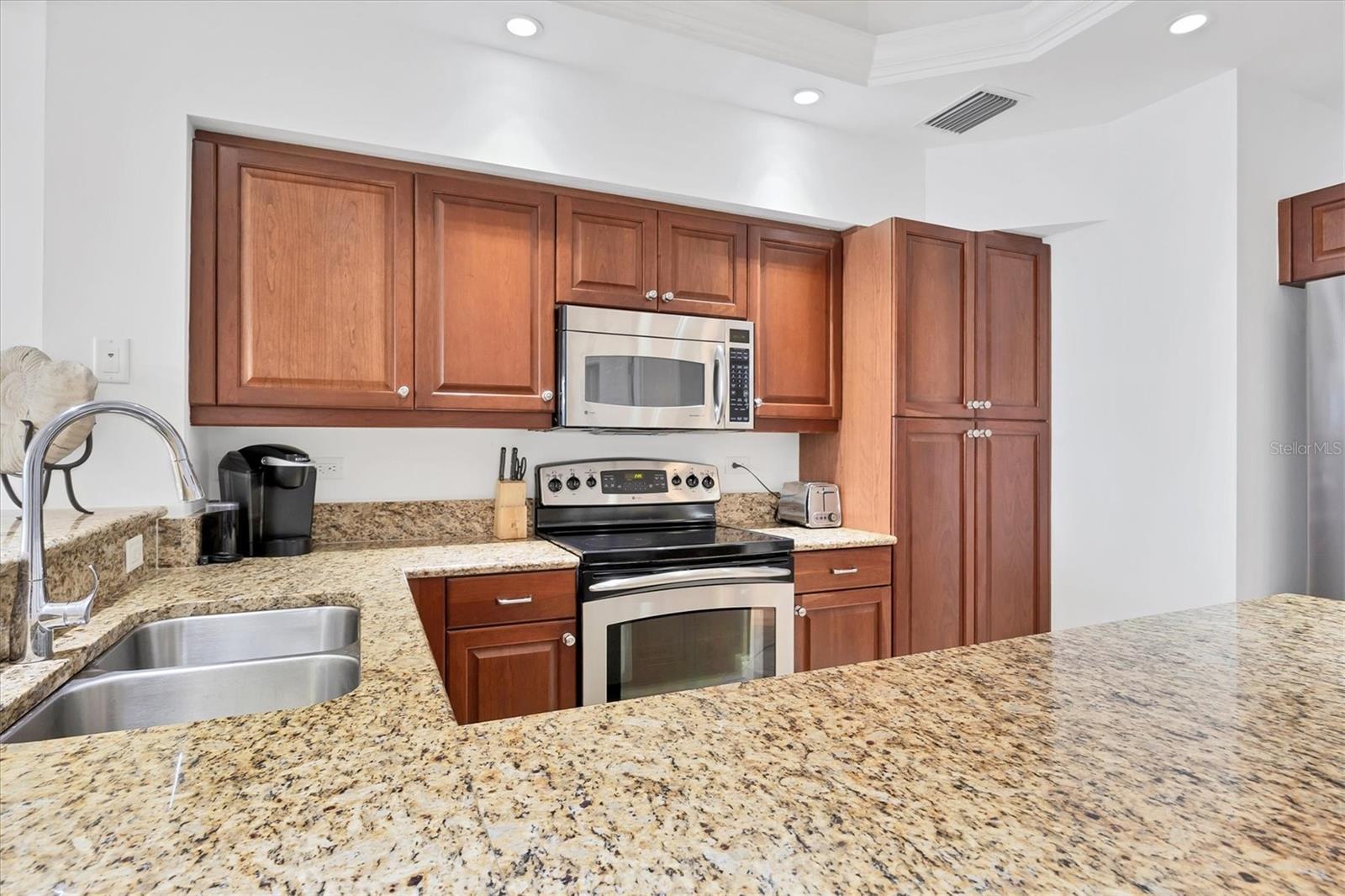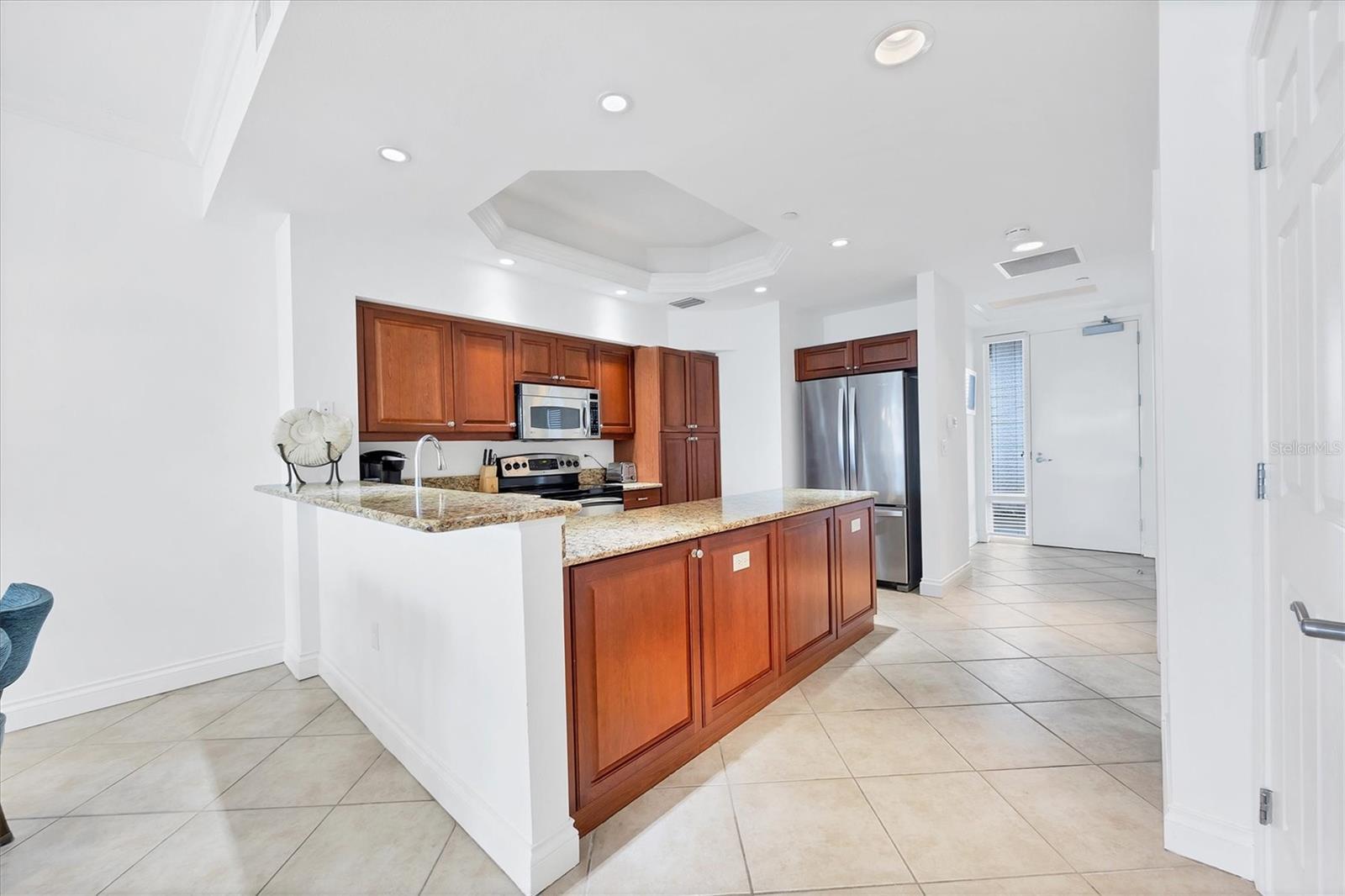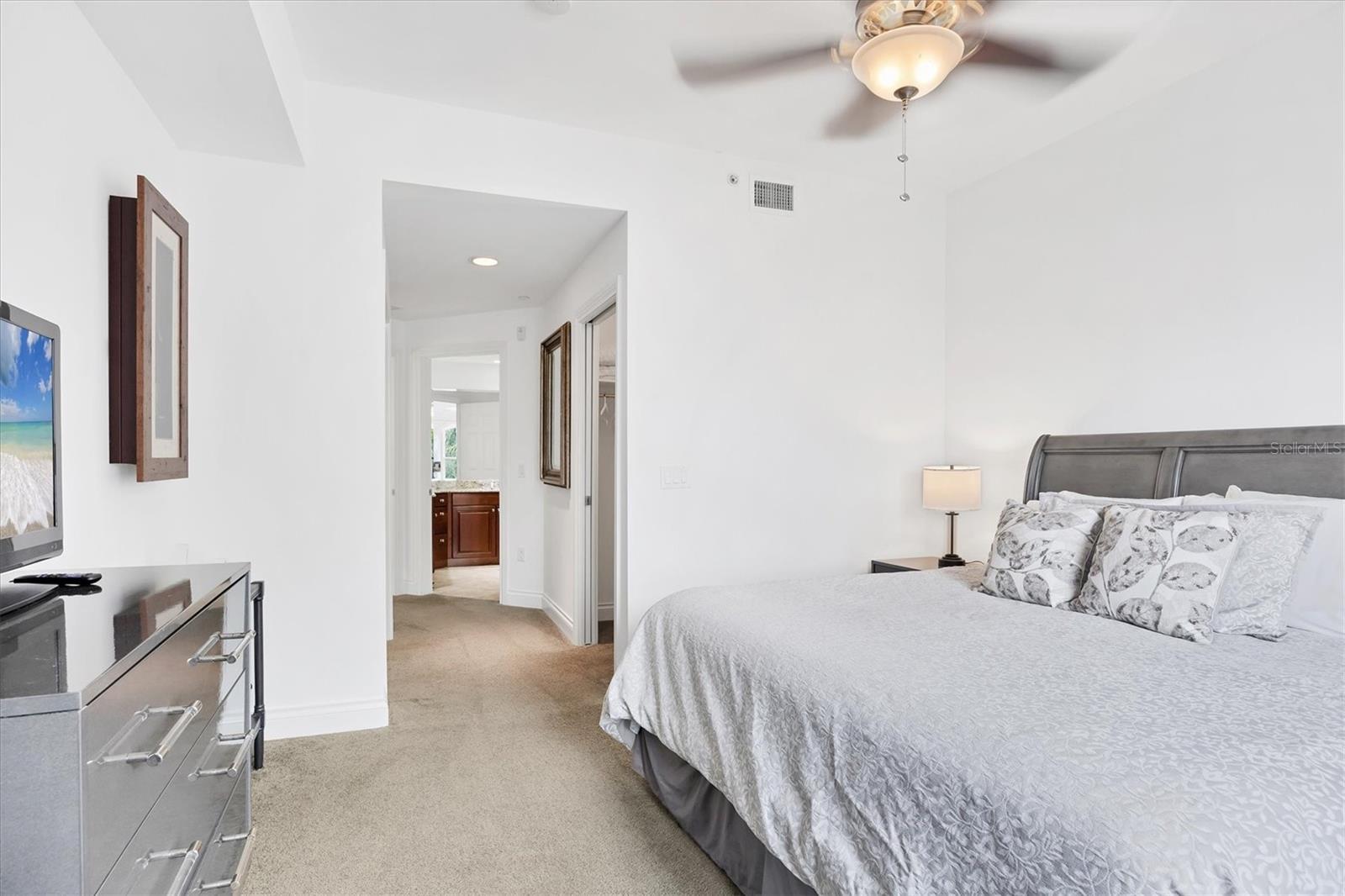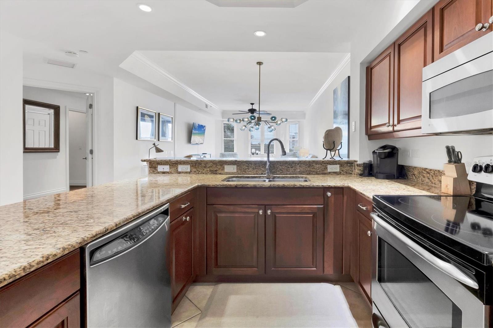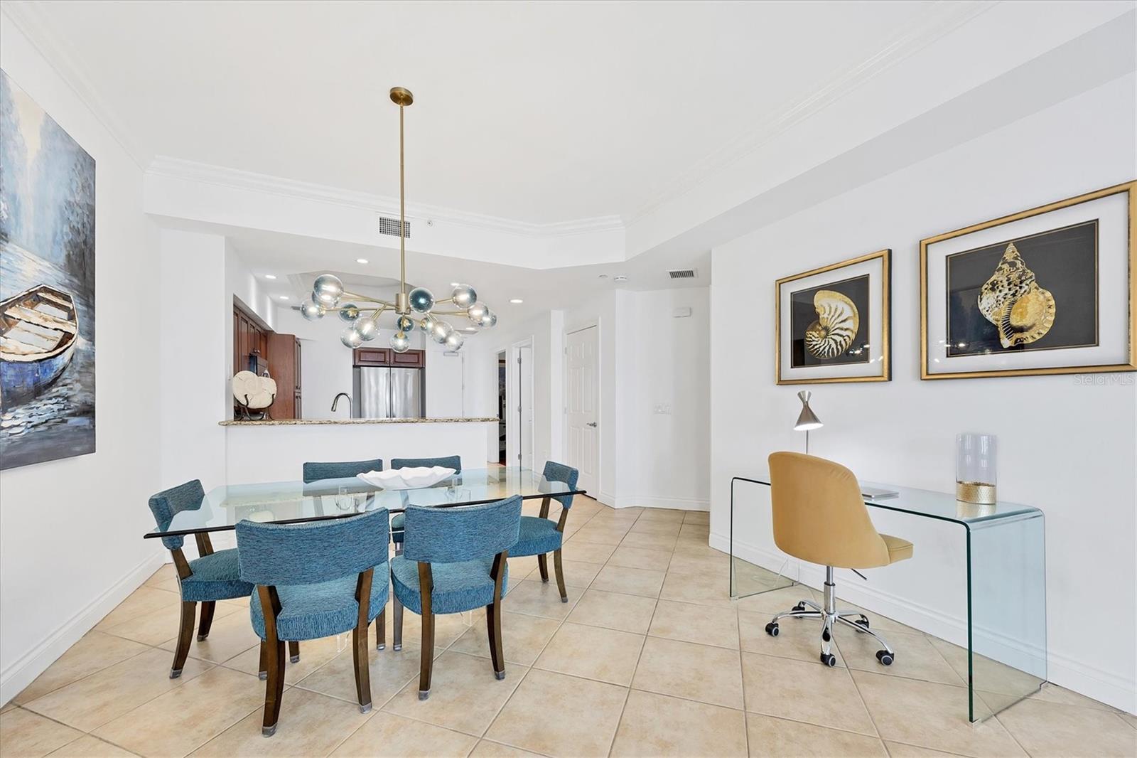 TURN KEY, ALL INCLUDED! One Month Minimum! Enjoy an elegant experience in this centrally located place. From your unit’s windows, you can take in views of downtown Lakewood Ranch, fountains, a movie theater, mini-golf, shops, and restaurants. This recently renovated condo is bright and spacious. The living room features brand-new Italian leather furniture—both the sofa and chair are reclining and incredibly comfortable. Additionally, there is a large granite coffee table and modern side tables. A 75-inch TV is mounted in the living area for your entertainment. The modern glass dining table comfortably seats six, making it perfect for gatherings. The primary bedroom boasts a king-size bed, a large dresser, and a TV. The guest bedroom features a Scandinavian-style bedroom set with a queen-size bed and a TV as well. The kitchen is fully equipped, so you can even prepare a Thanksgiving dinner with ease! For your convenience, the unit includes an in-unit laundry. An elevator provides easy access to the assigned parking space. Immerse yourself in an elegant and convenient experience at this exceptional property!