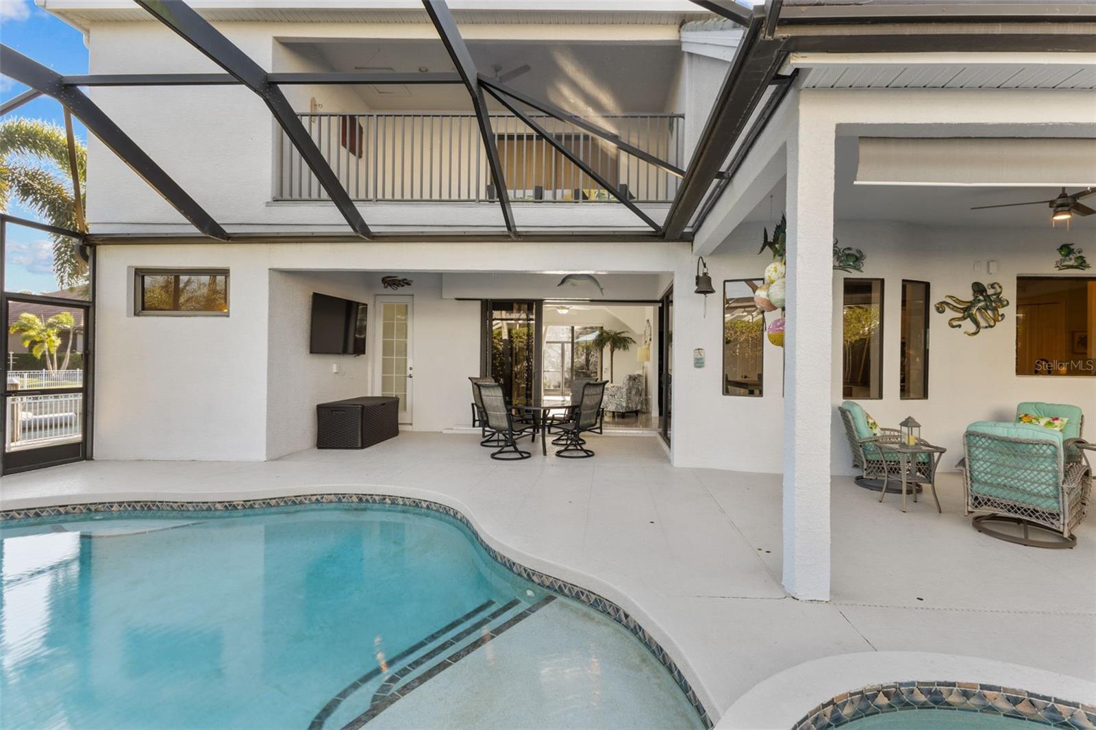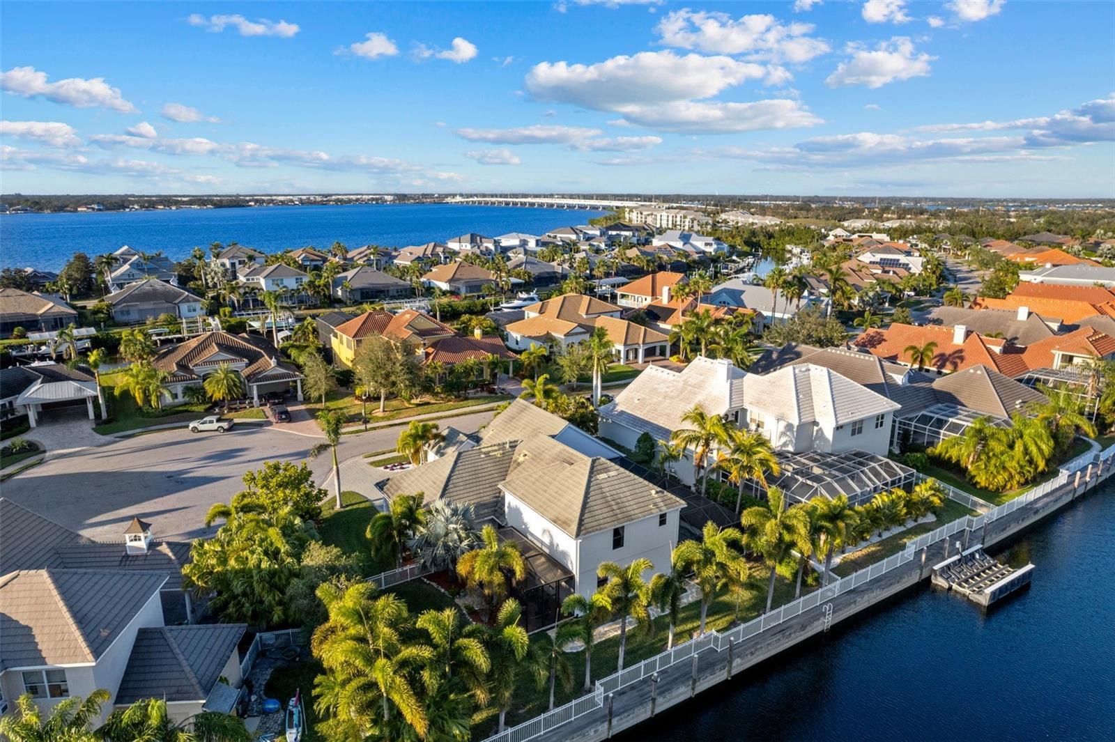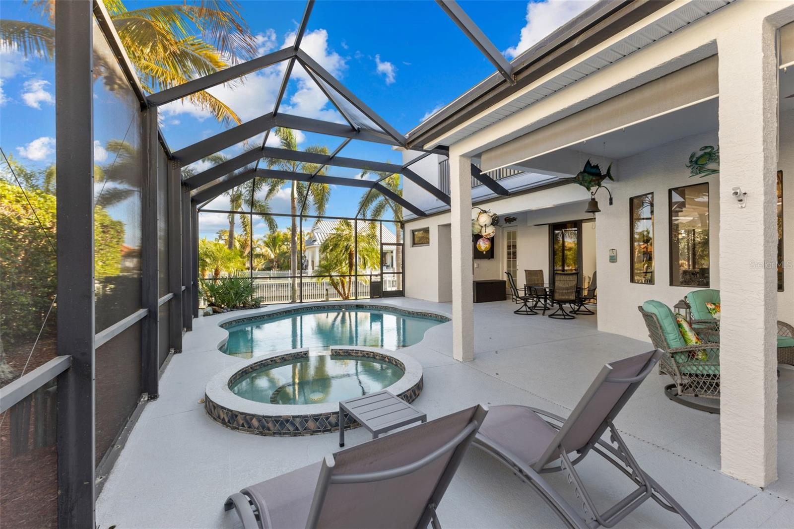 Stunning coastal inspired 5 bedroom, 4 bathroom waterfront home with boat dock, pool, spa, 3 car garage and 2 x Lanai's for Sunrise and Sunset. Freshly painted interior. Located in the highly sought after Inlets on the Manatee River, which features tennis courts, kayak launches and a playground, this tastefully updated home has everything you need to live the perfect Florida lifestyle. 4 Bedrooms on the first floor, and an in law suite on the second floor with its own living room, bedroom, full bathroom and a balcony overlooking the water. The boat dock is on a freshwater canal connected through a lift to the salt water. The freshwater dock allows for less maintenance on your boat. This beautifully maintained home has a gas cooktop, double oven and zero corner doors leading from the breakfast dining area to the first screened patio area. A pool, spa and a large TV complete the first lanai with water views and has no other homes overlooking this oasis. The 2nd lanai is perfect for evening sunsets and grilling with private water views. The living room opens on both sides to the 2nd lanai providing a true indoor/outdoor experience. In addition to the 3280 sq ft of living space, There is over 800 sq ft of covered outdoor area with a retractable awning on the west Lanai. The oversized yard is fully fenced in and ideal for pets and children. A full home Generac generator was installed in 2023. There is a new footpath connecting both lanai's on the outside of the home. The Inlets is a friendly riverfront community that is meticulously landscaped throughout with mature palm trees. To top this all off, the community has a LOW HOA and NO CDD This is a true gem. Some photos are virtually staged.
