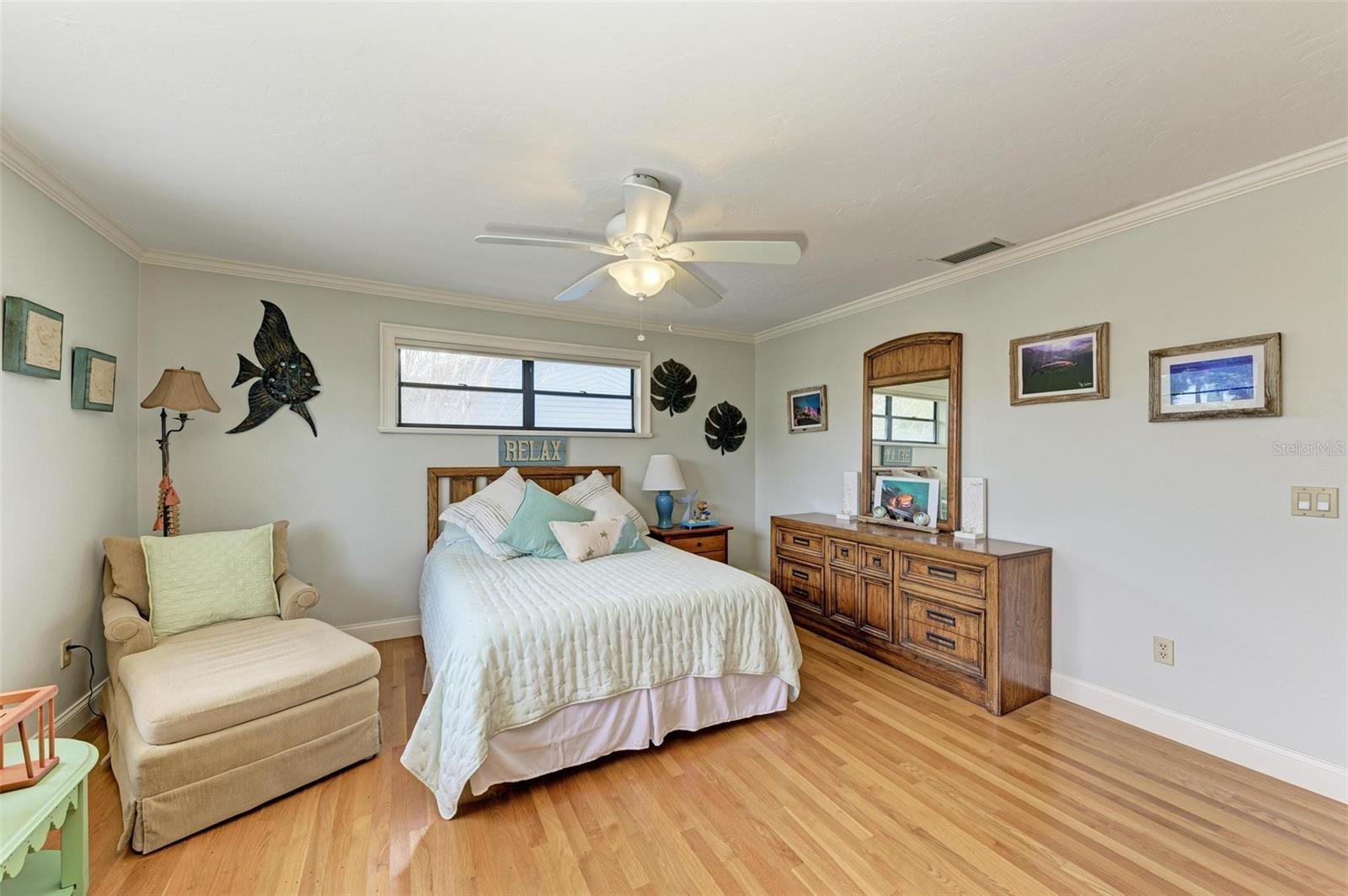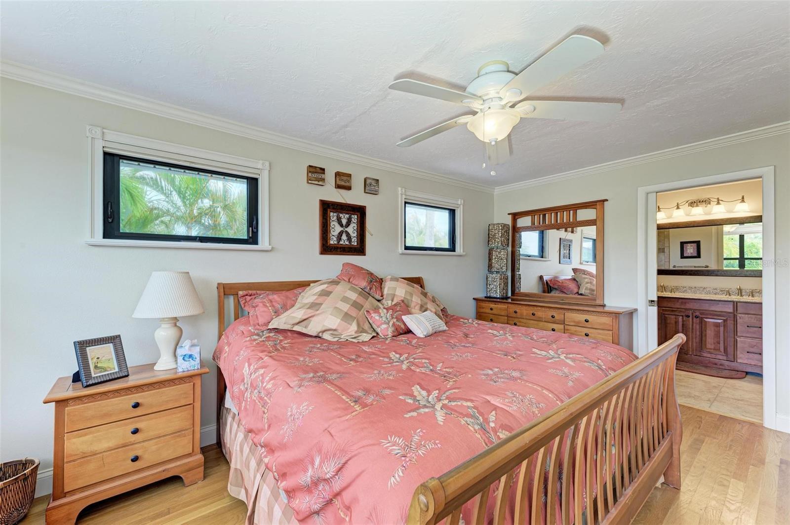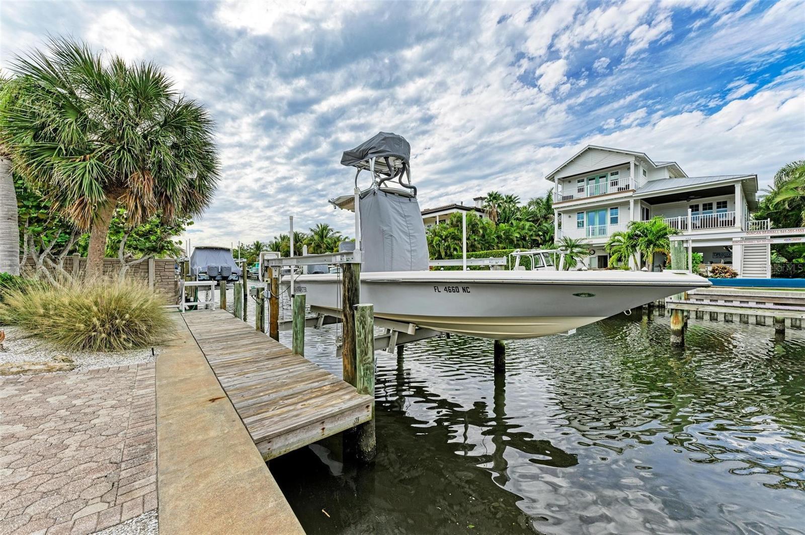 You have to see this home to appreciate the efficient layout and spacious living spaces. This property comes turnkey furnished, making it a seamless transition for the fortunate new owners. Meticulously maintained and never rented, the home exudes a sense of care and pride. For those considering short-term rentals, this residence presents an attractive opportunity. Featuring three bedrooms, including two master suites, and three bathrooms, the open floor plan enhances the spacious and airy ambiance, creating an inviting atmosphere for residents and guests alike. Nestled along a serene saltwater canal, this home caters to boating and fishing enthusiasts with a 12,000lb boat lift and a fish cleaning station. This deepwater canal has no fixed bridges to get to open water, both sailboats and power boats are welcome. The covered back porch overlooks the canal, providing a tranquil setting for relaxation and entertainment. Immerse yourself in the refreshing saltwater pool. The pool is heated with an electric heat pump and comes with a pool sweep and fitted cover. Inside, the residence boasts high-end finishes, including granite countertops, crown molding, Hunter Douglas window dressing and hardwood floors throughout, with tile accents in the bathrooms. Practical features of this elevated home include a new metal roof and a completely enclosed lower level that boasts a 2-car garage, ample storage space under the entire home on a generous lot with 75' on the canal, ensuring privacy and room for outdoor activities. A short seven-block stroll or bike ride takes you to the beautiful Gulf beaches that Anna Maria Island is renowned for. And Tampa Bay water access is literally half a block away, across South Bay Blvd. Again, turnkey furnished and ready to move in. And as an extra bonus a meticulously maintained 2006 Shearwater Z2400 power boat is included. Don't miss this opportunity!!!
