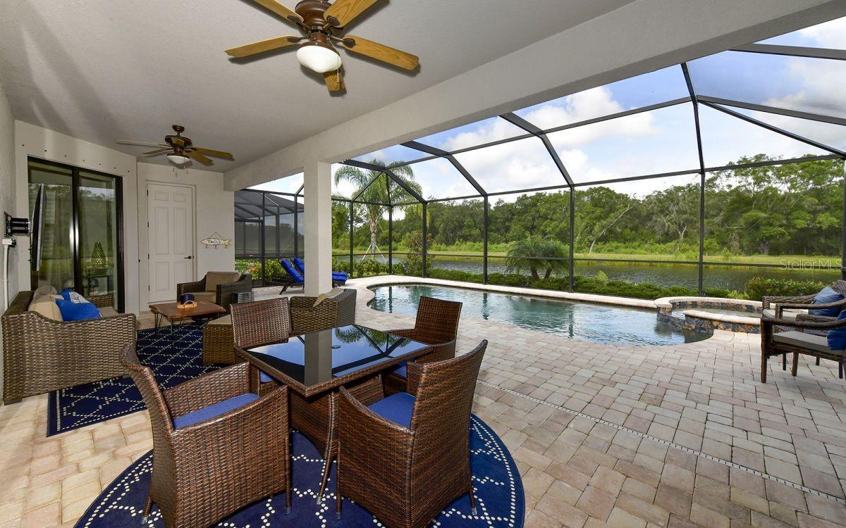 Gorgeous 2 bedroom 2.5 bathroom home in the resort style living gated community of Lakewood National. Professionally decorated with coastal chic furnishings. This is the Popular 1850 sq. ft. VICTORIA model features a clever open floorplan. Master bedroom features en-suite bath with soaking tub, walk-in shower and double sinks. Guest room is located at the front of the home. A den is set up with two extra-large twin beds allow Enjoy your very own private oasis featuring a heated SALTWATER POOL & SPA and a pool bath. Outdoor grill for entertaining guests, grilling and enjoying meals outdoors. PREMIUM Water & Preserve views. Upgraded light fixtures. Custom storage, built in sports racks in garage. This home has everything for the MOST DISCRMINATING GUEST. Located in Lakewood National Golf community. Residents have access to 2 Arnold Palmer designed championship courses. LWN is a golfer's dream. Amazing resort style amenities feature; spa - fitness center - resort style pool - Tiki Bar with food service, har-tru tennis courts, pickle ball - Golf/Membership transfer available.
